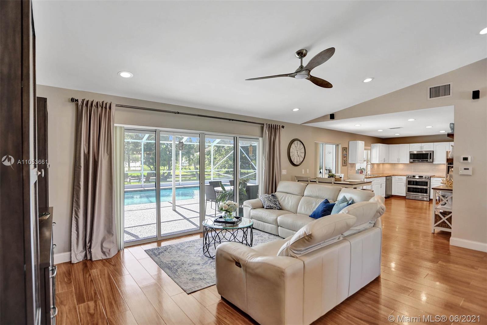 Rarely available & highly sought after One Story, 2 Car Garage, Pool & Waterfront (82') home in very desired, very family oriented Jacaranda Lakes, in Plantation, FL. Boasting majestic volume ceilings & water views in main living area & master suite this 4 bed, 2 bath, large laundry room & bonus room the home is exquisitely & meticulously rejuvenated. Boasting Metal roof (Spanish S design), new 2017 HVAC system, new Laminate flooring in bedrooms, Ceramic Wood-plank Flooring in living areas & the most amazing step down formal dining w/ custom builtin (lighted) China cabinets, & Wainscoating panels w/ attention to every detail. Bright, open & generous floor plan, Large bedrooms, Upgraded LED lighting, Spacious eat-in kitchen, Beautiful White cabinets, Granite counters & SS appliances