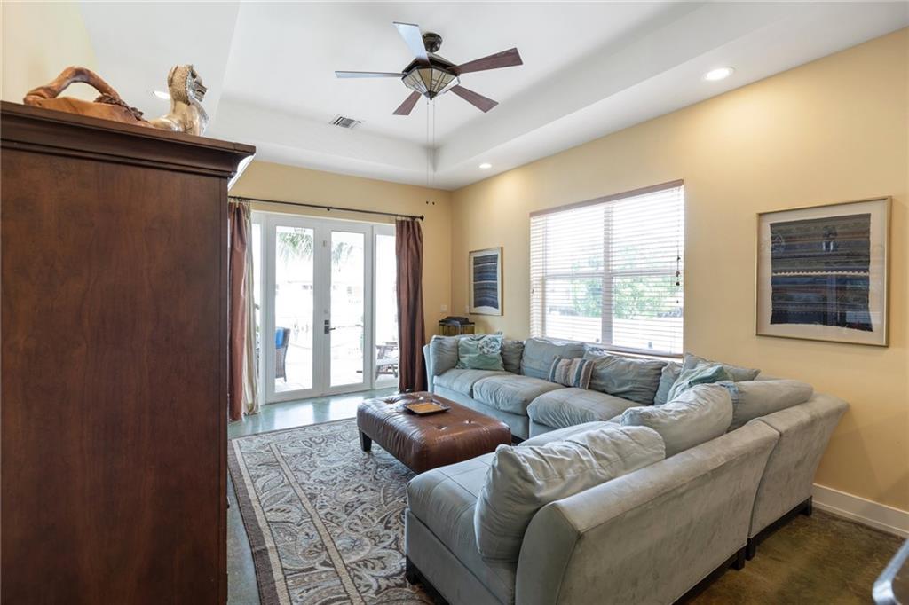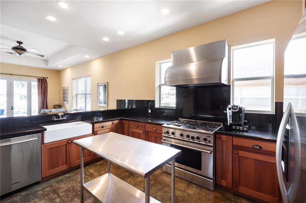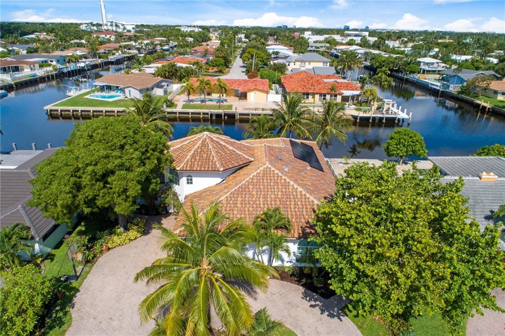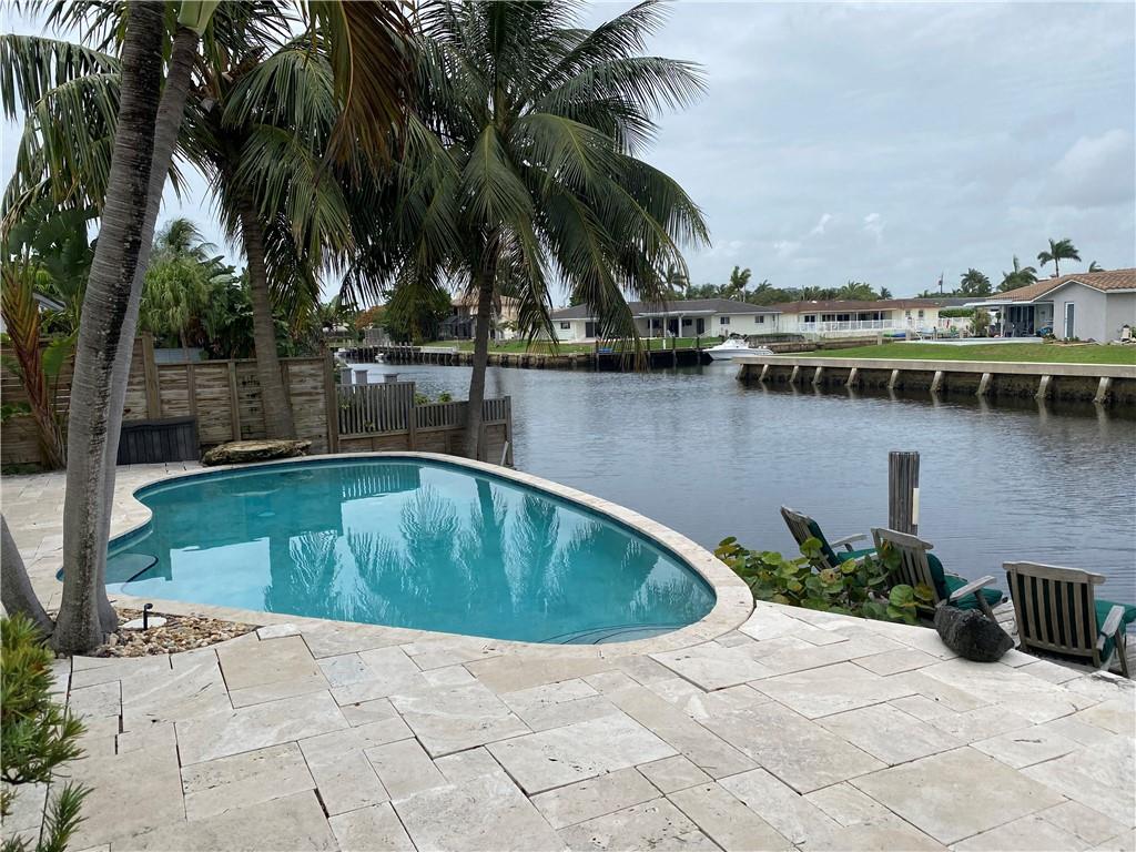 Rebuilt from foundation in 2004, 2882 sq ft of living space with 12ft high ceilings, 8ft impact windows and doors, unique polished concrete floors, gourmet kitchen with gas stove/oven, stainless steel appliances, custom cabinets, and granite countertops. 4 bedrooms in a split plan layout with 2 master suites, 3 full baths and ½ bath. Master suite bathroom has a jetted tub and steam shower. 2nd master bathroom has a jetted tub. On 80 feet of water with 50 feet of dockage with saltwater pool. Salt generator and pump are new as of 2021. Roof is 2 years old with full house solar energy. Beautiful backyard oasis patio/pool deck done in travertine. Tropical landscaping with room for a vegetable garden. Close to the beach, shopping and restaurants.