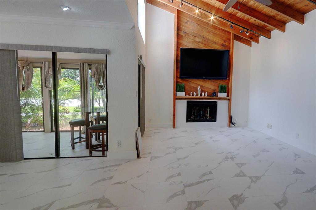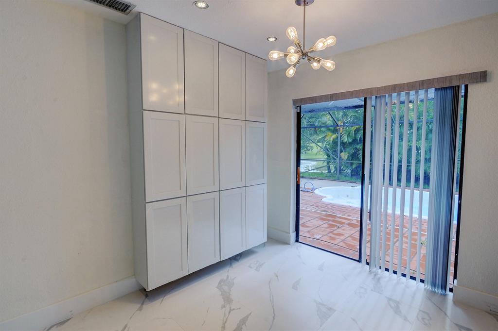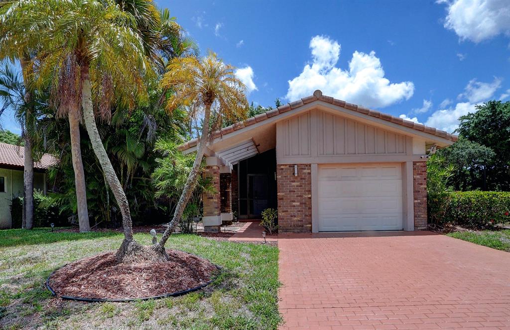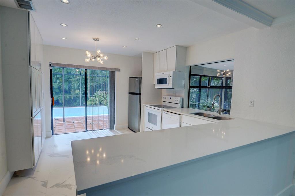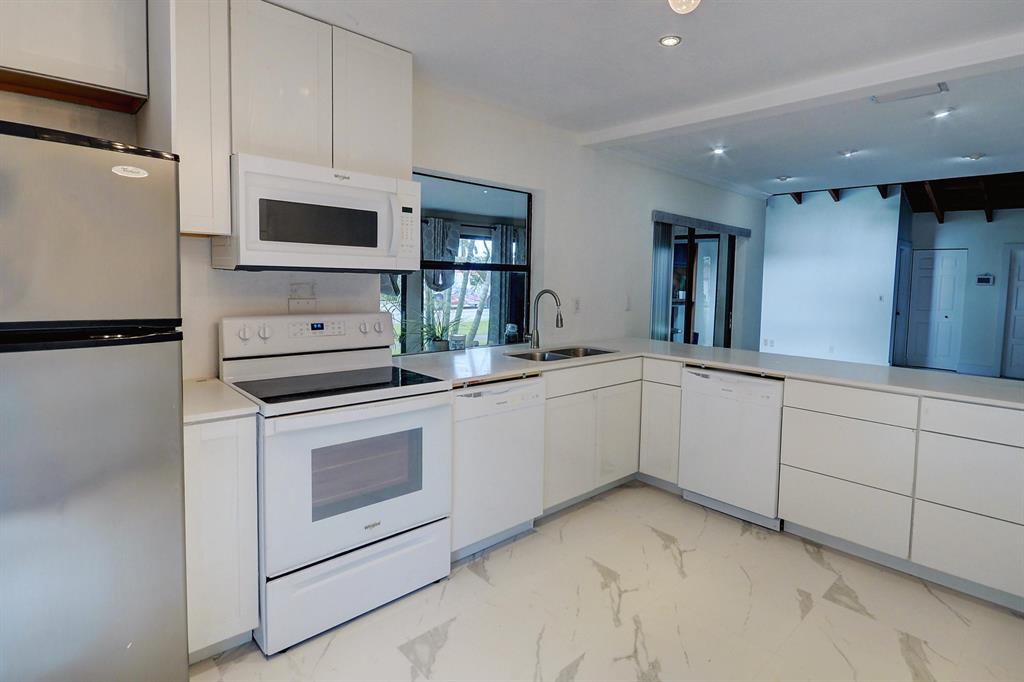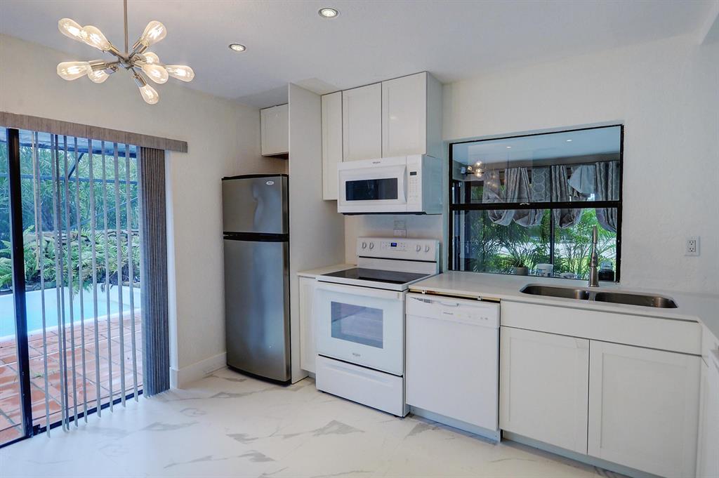 Light bright with new double sink and double dishwasher kitchen which has just been totally renovated with new cabinetry and quartz countertops. The modern all white kitchen coordinates perfectly with the new porcelain tile which runs through to the fully enclosed Florida room that can be use for additional living space. This is the closest home to the front of the community and a very very short walk to worship. Also, it's move in ready! Boca Greens is a gated community of 586 homes as well as being the home of the Boca Greens County Club. All residents can play the course on a pay for play basis. No membership is required and the low monthly fees include a premium cable tv package with HBO, HBO Max, Showtime and fast fiber internet.