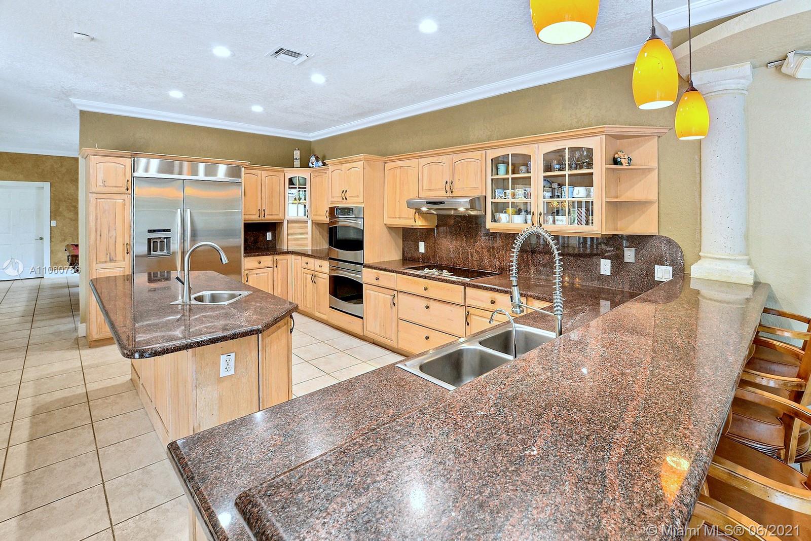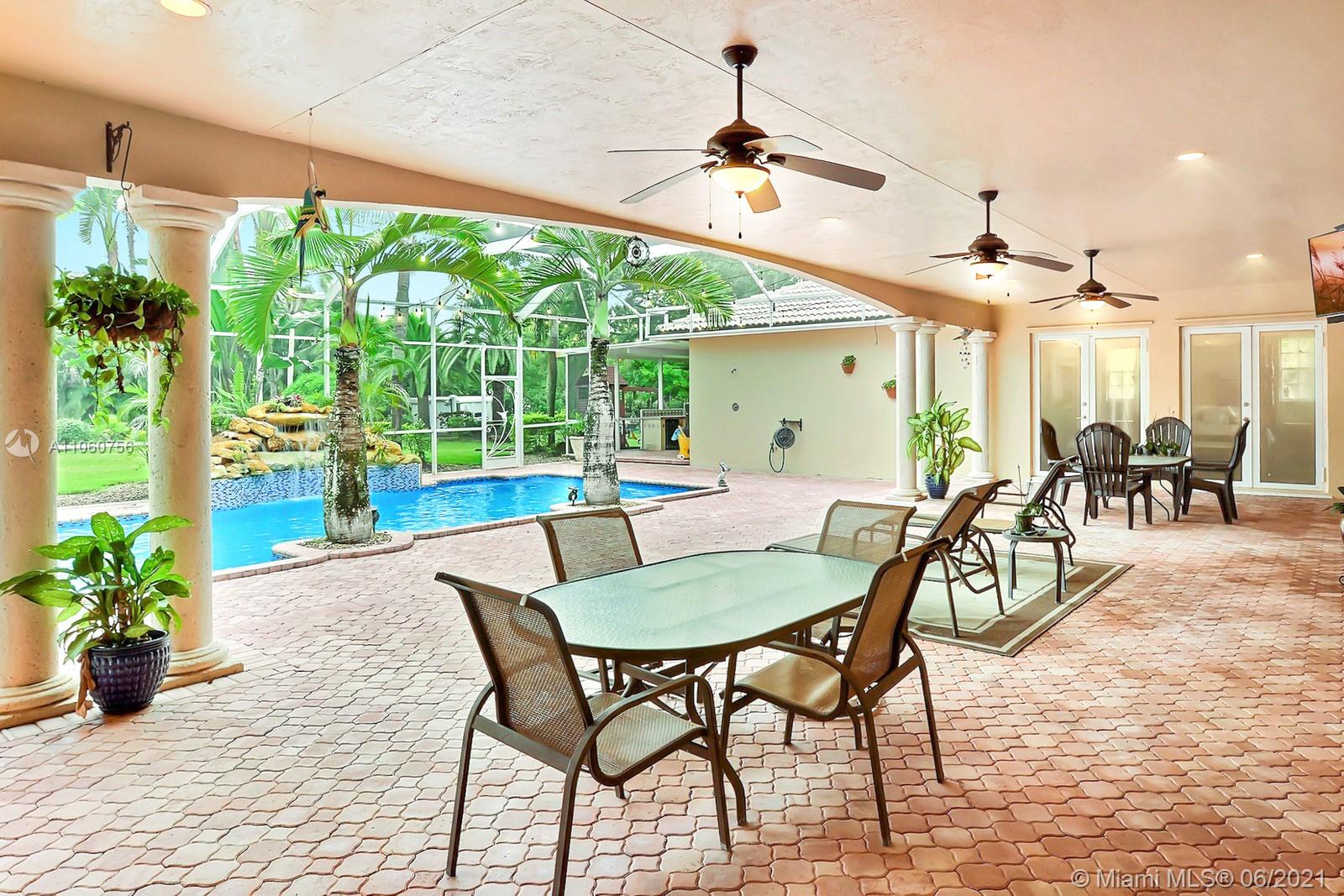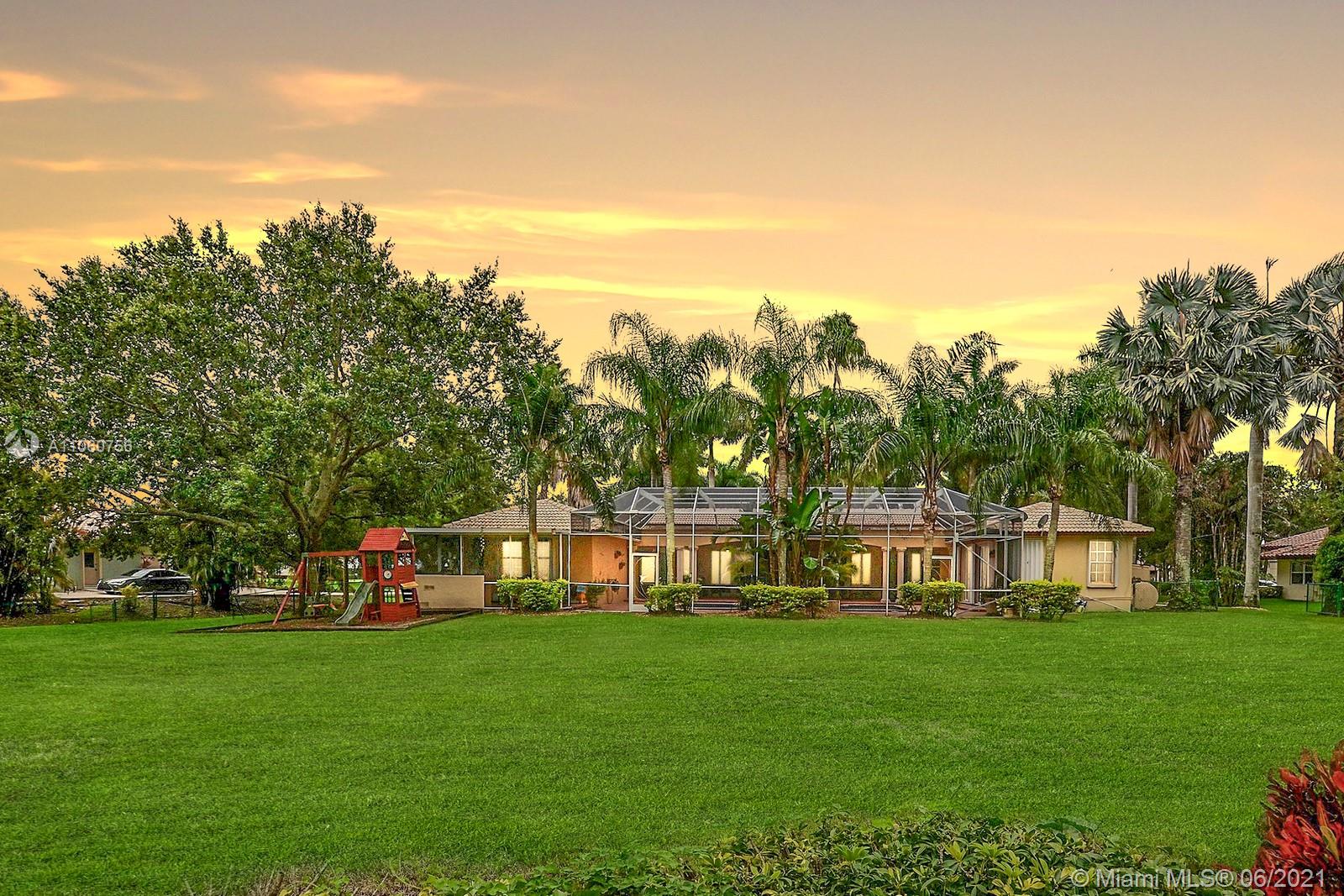 WELCOME TO IVANHOE ESTATES IN THE TRULY SPECIAL EQUESTRIAN FRIENDLY TOWN OF SOUTHWEST RANCHES. SITUATED ON 1.4 ACRES, THIS ELEGANT HOME HAS 3,561 SF OF LIVING SPACE W 4 BEDS 3 BATHS, LIVING, DINING & FAMILY ROOMS + BONUS DEN/FLEXSPACE. FABULOUS FLOOR PLAN PERFECT FOR ENTERTAINING W ROMANTIC WOOD BURNING FIREPLACE. LARGE CONTEMPORARY EAT-IN KITCHEN TONS OF CABINETS, ISLAND, GRANITE COUNTERS & STAINLESS APPLIANCES. SPACIOUS PRIMARY SUITE W FRENCH DOORS TO PATIO & POOL. UPDATED BATHS. STUNNING CURB APPEAL, GRAND DRIVEWAY W WATER FEATURE PARKS 30+ CARS. BACKYARD OASIS HOSTS COVERED PATIO, BBQ & SCREENED POOL W SERENE WATERFALL, LINED BY LUSH TROPICAL PALM TREES. GENERATOR POWERS ENTIRE HOME. ENJOY THE BEST OF BOTH WORLDS IN RURAL YET VIBRANT ENVIRONMENT W EASY ACCESS TO SHOPS, DINNING & 75.