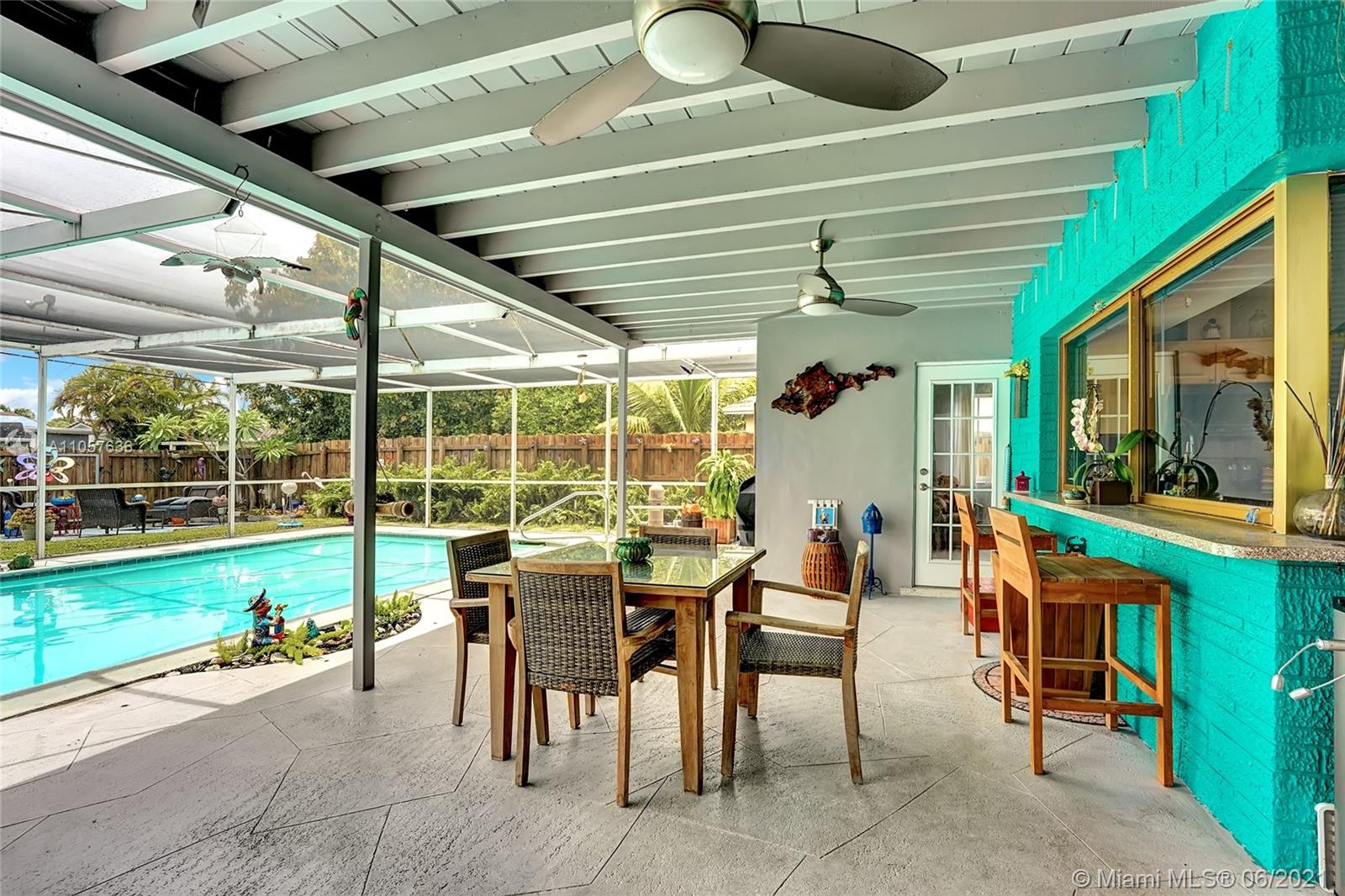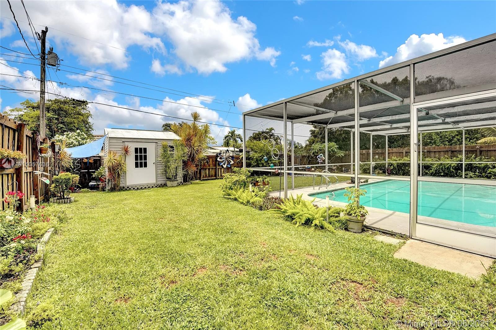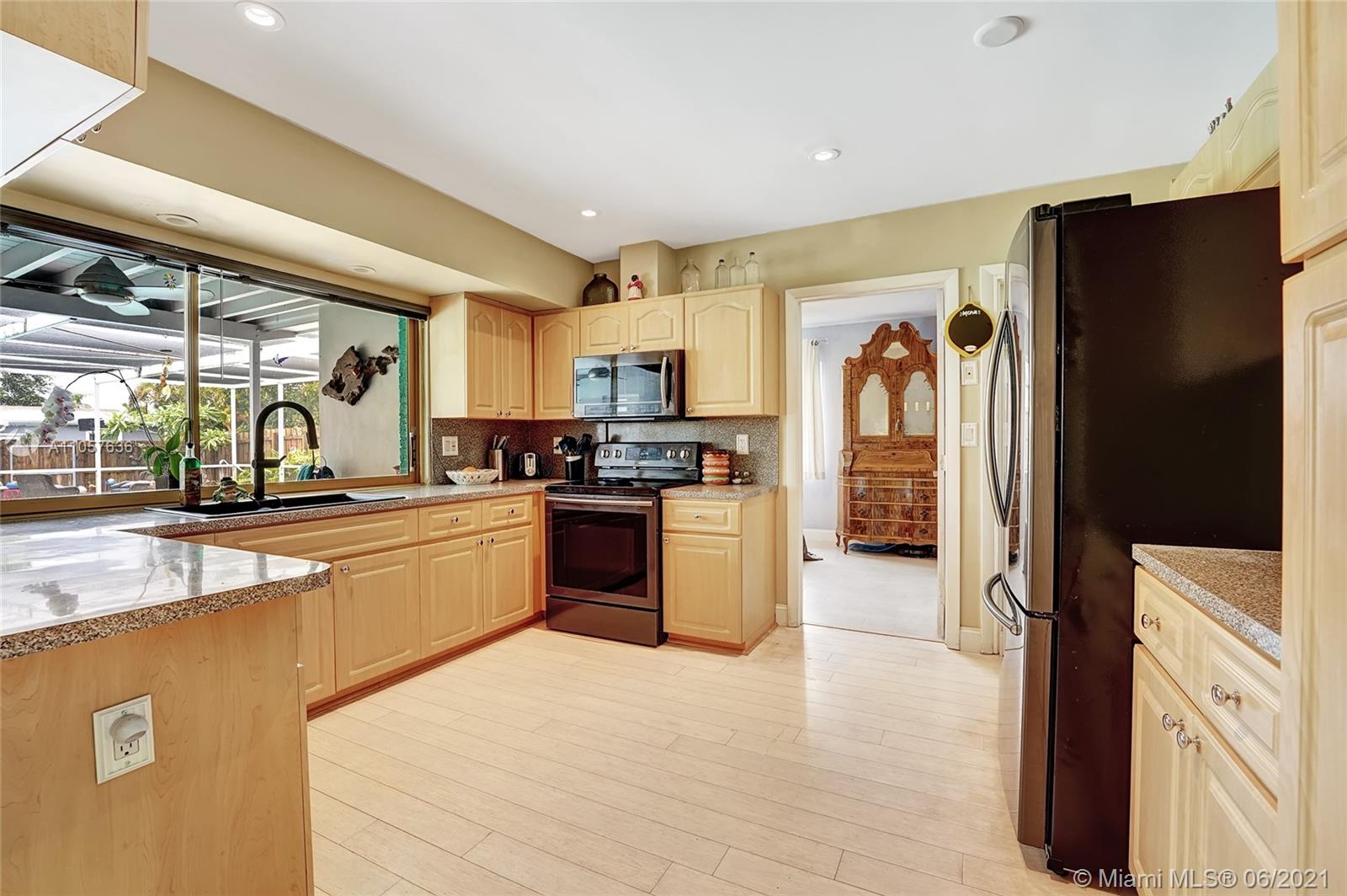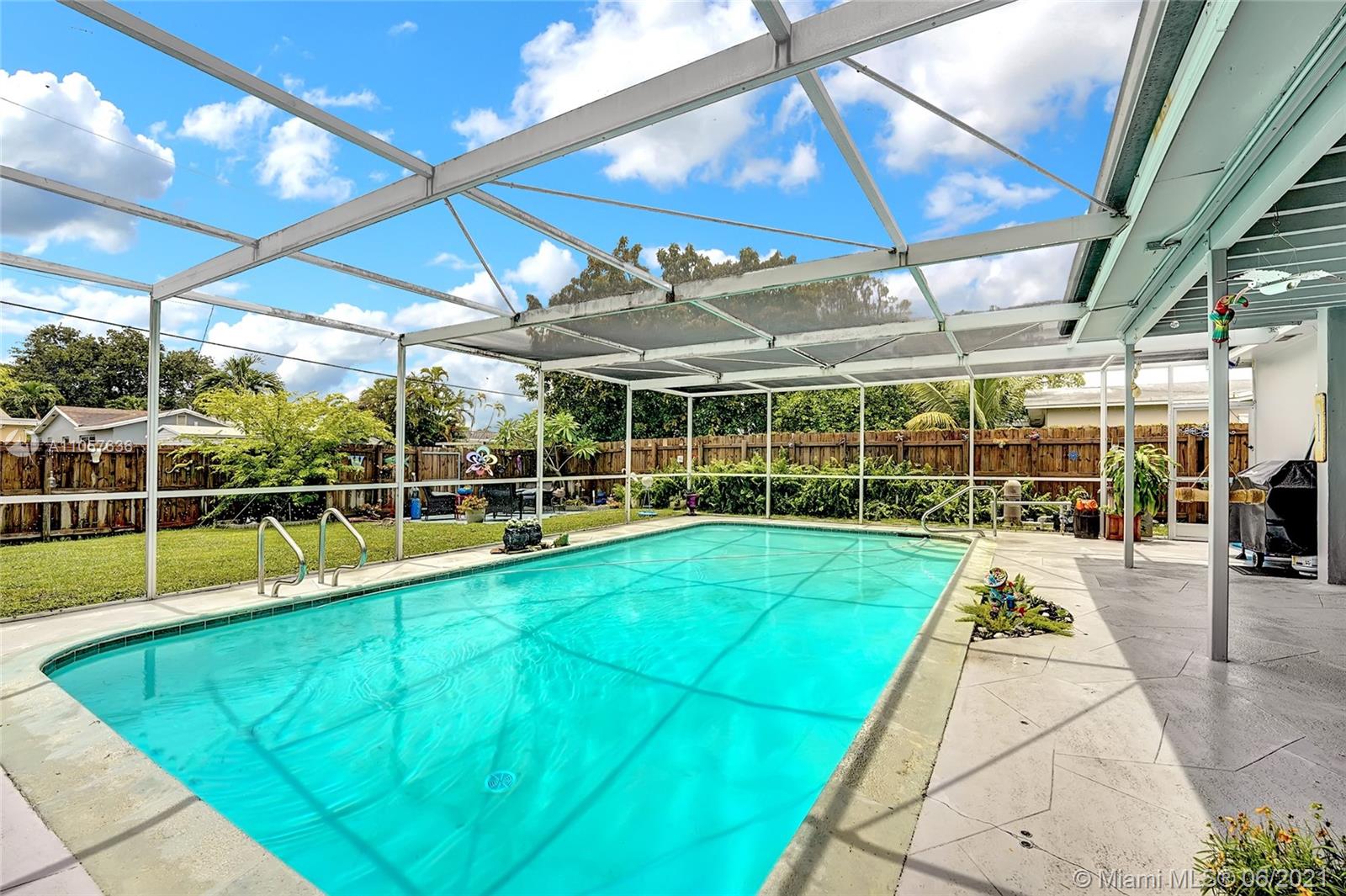 Are you looking for a tropical tranquil home that is great for entertaining & less than 5 miles to Hollywood Beach Then look no further, this 4 Bedroom 2 Bathroom home sits on a spacious 7,673 fully fenced sqft lot. Enter through your foyer & your greeted by the open flowing floor plan and captivating views of the pool. The large kitchen is thoughtfully designed w/ built-in pantry & large pass through window w/ pool bar seating. Triple split floor plan. Spacious bedrooms. Upgraded bamboo flooring throughout. Master suite features walk-in closet w/ built-ins & en-suite cabana bath. French doors lead you from the living space to your screened pool deck w/ covered patio & plenty of yard pass the pool to enjoy! Outdoor storage shed. Impact windows/doors. Large circular driveway & much more!