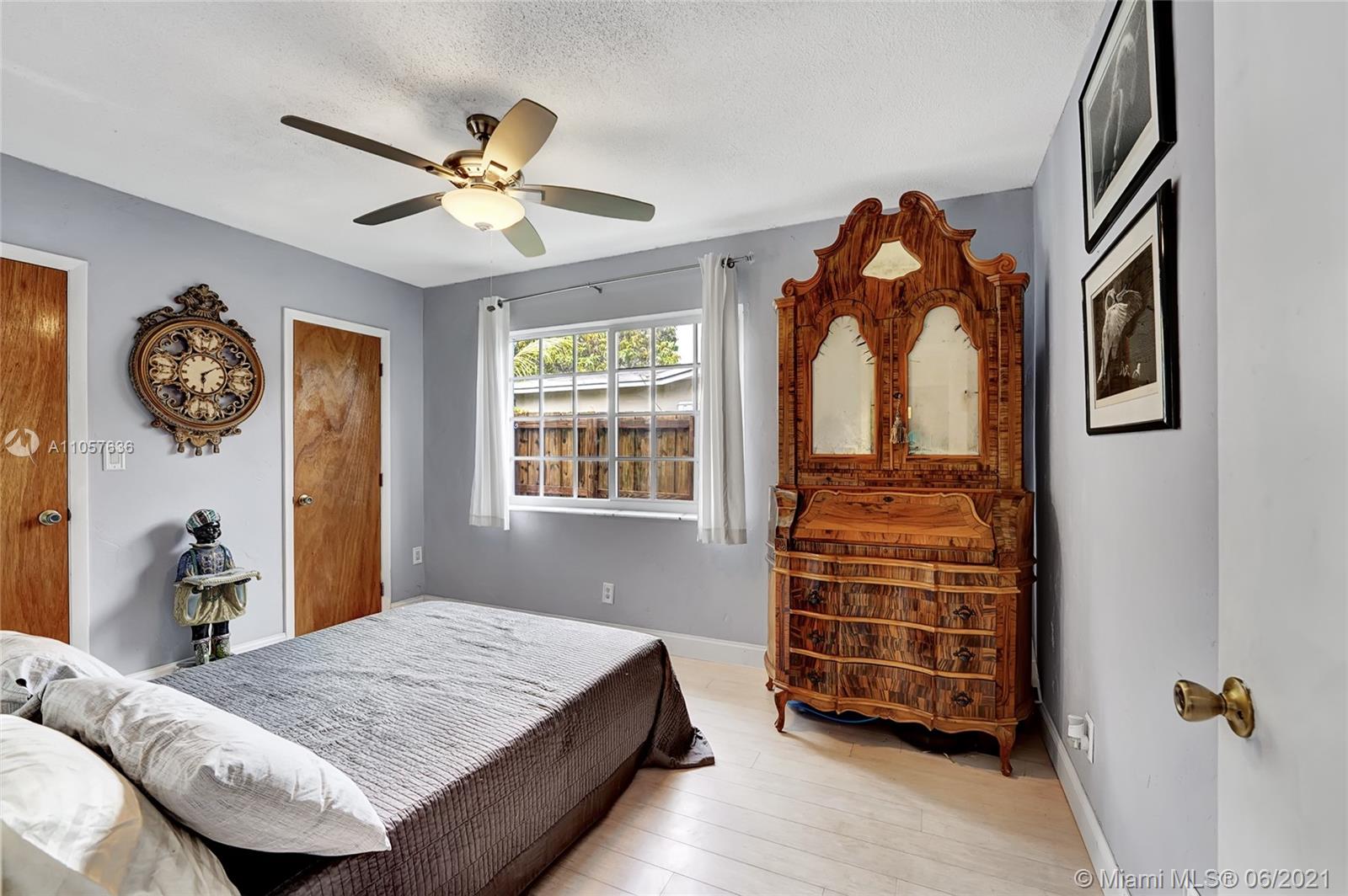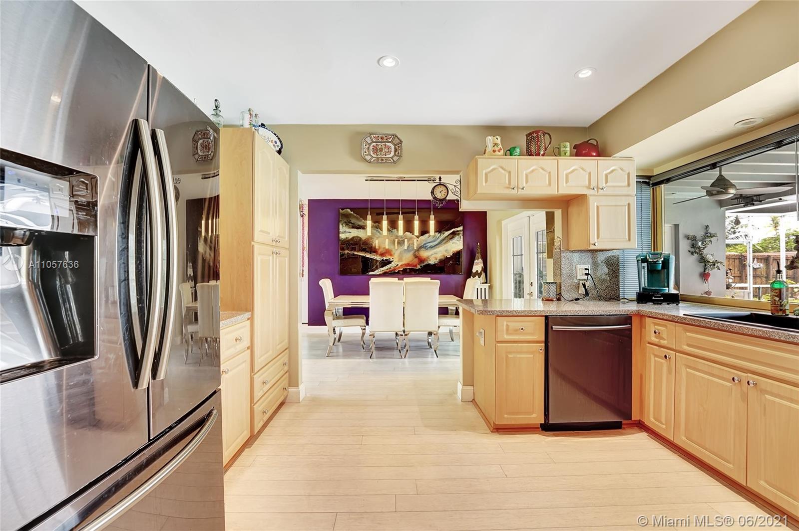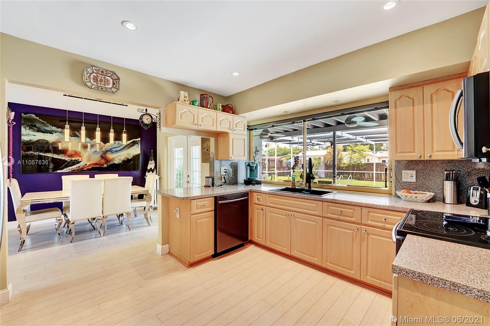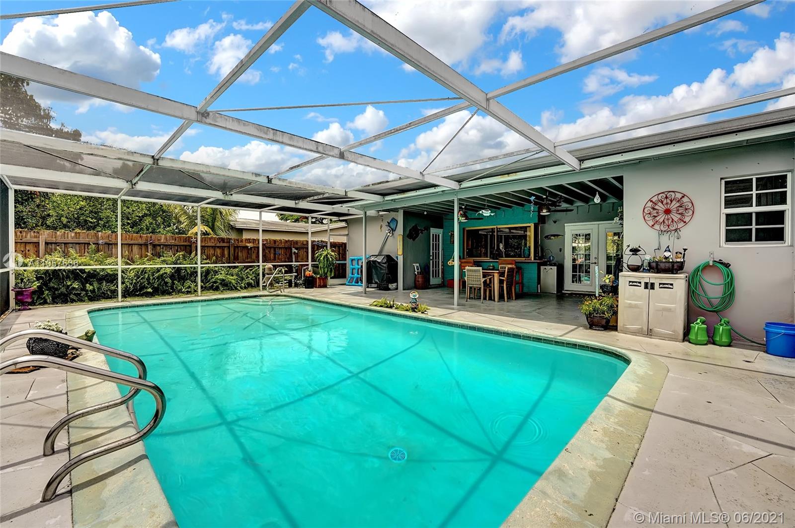 Are you looking for a tropical tranquil home that is great for entertaining & less than 5 miles to Hollywood Beach Then look no further, this 4 Bedroom 2 Bathroom home sits on a spacious 7,673 fully fenced sqft lot. Enter through your foyer & your greeted by the open flowing floor plan and captivating views of the pool. The large kitchen is thoughtfully designed w/ built-in pantry & large pass through window w/ pool bar seating. Triple split floor plan. Spacious bedrooms. Upgraded bamboo flooring throughout. Master suite features walk-in closet w/ built-ins & en-suite cabana bath. French doors lead you from the living space to your screened pool deck w/ covered patio & plenty of yard pass the pool to enjoy! Outdoor storage shed. Impact windows/doors. Large circular driveway & much more!