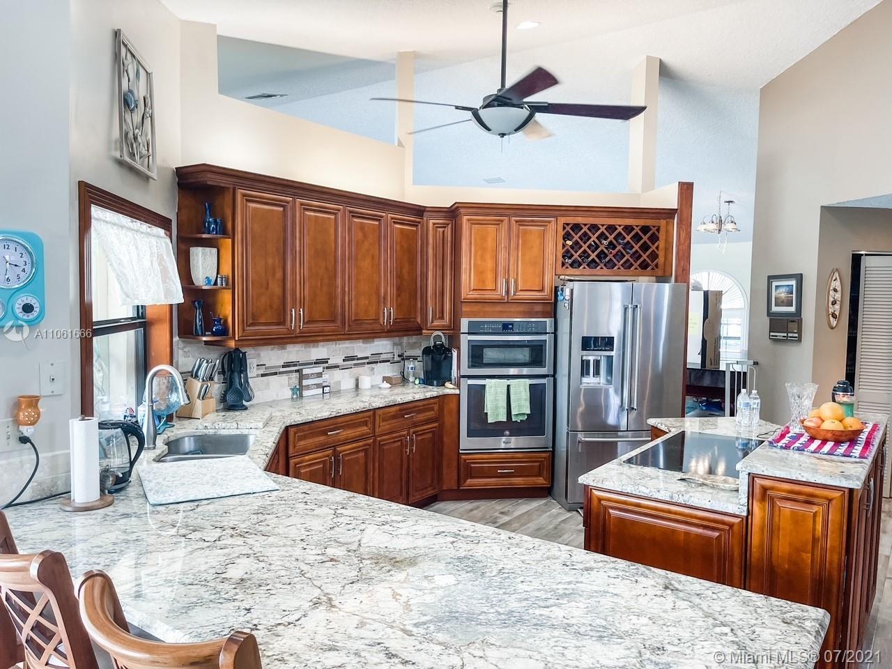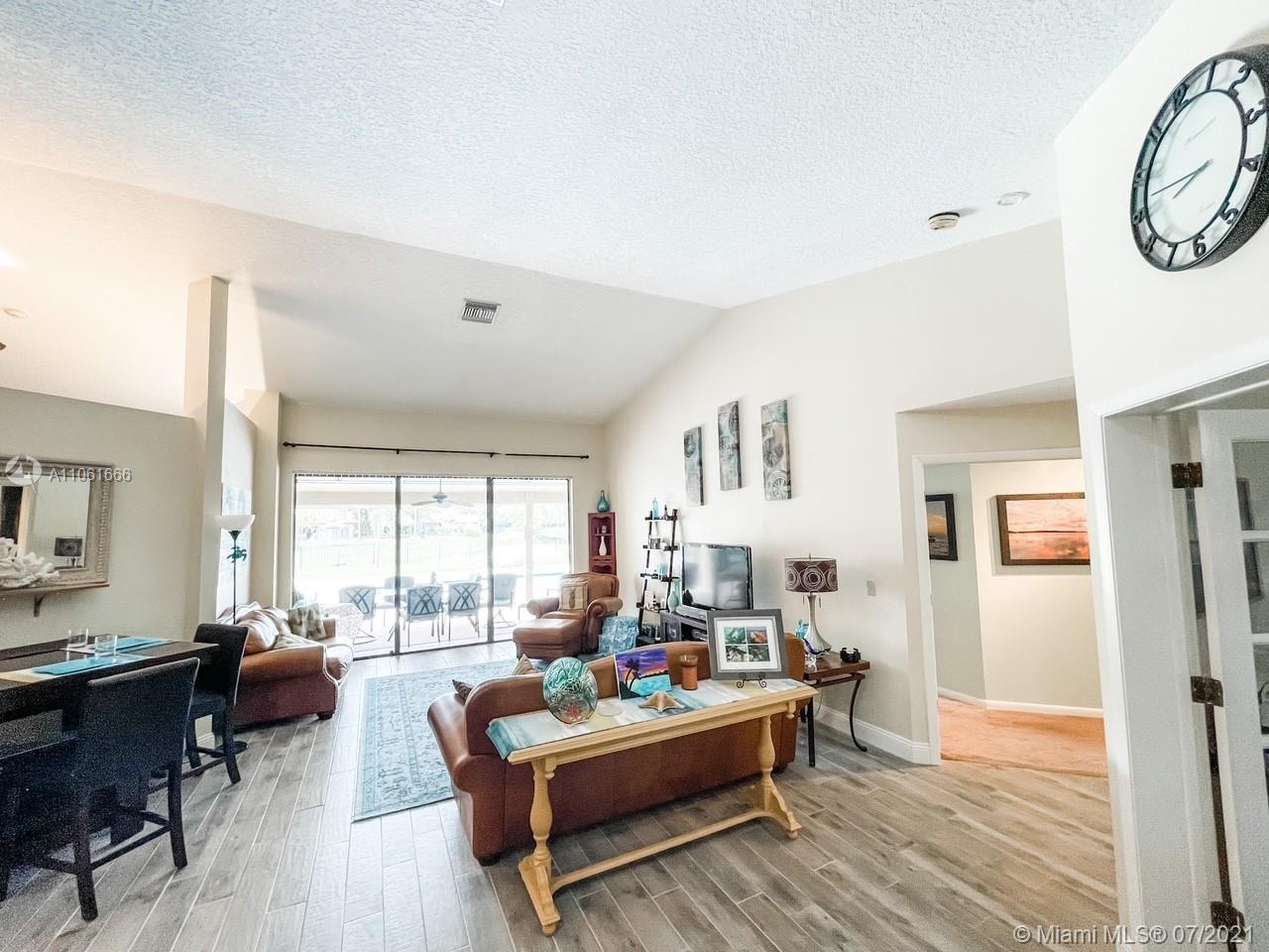 Truly a one of a kind RED HOT Pine Ridge neighborhood gem-Low HOA! Walk in to vaulted ceilings, 5 bedrooms, 2.5 baths, massive fireplace, circular driveway, & gorgeous pool! Amazing split floor plan, new tile floor throughout living areas, carpeted bedrooms, upgraded bathrooms, updated kitchen & island with granite counter tops. 2007 Roof, accordion shutters, some impact windows, cabana bath that leads to the oversized waterfront lot great for sunsets w/ large grassy backyard for entertaining guests. Super safe MagnaLatch fence for the little ones. The master bedroom features a HUGE walk-in closet! This home has an open floor plan, living room, family room & formal dining room. Close to major shopping & dining, parks/recreation & the sawgrass. THIS IS THE HOME YOU'VE BEEN WAITING FOR!