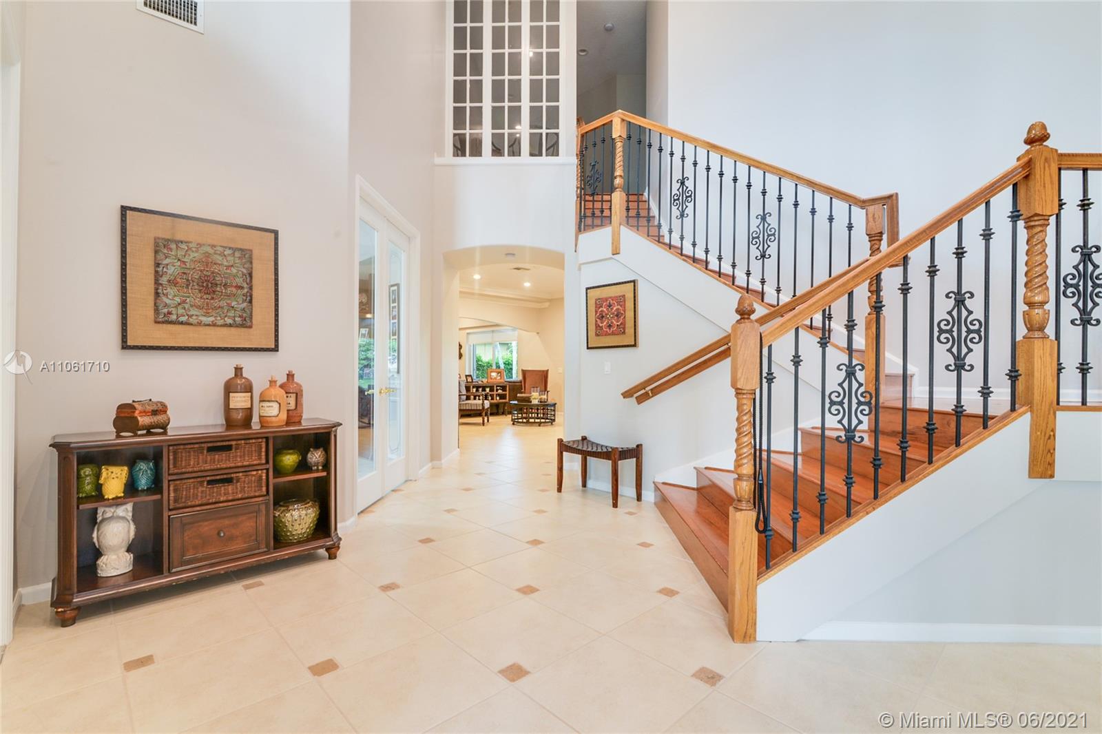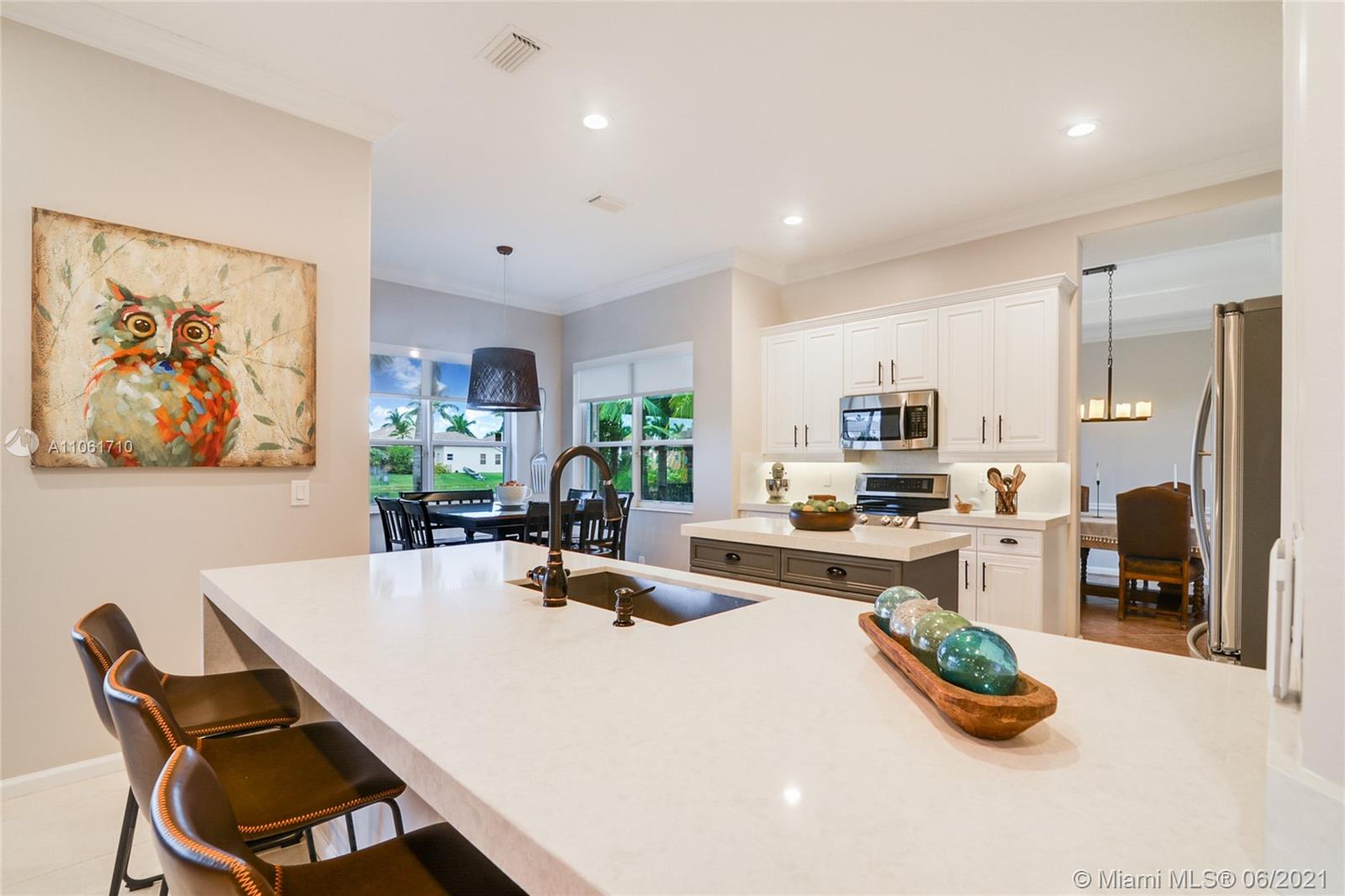 Beautiful Lakefront Home w/a breathtaking lake view. 5 Bedrooms, 4 Baths. Master bedroom has separate sitting room, 2 walk-in closets & oversized bathroom. California closets, Loft, Office/Den, TV/Theater Room, Fam. Room, Living Room & Dining Room, Foyer, 3 car garage, pool, jacuzzi, patio furnit, covered terrace & entry, sprinkler system, soaring volm ceilings, spiral staircase, porcelain tiles, new blinds, freshly painted. NEW kitchen w/ Quartz Waterfall countertops, stainless steel appliances, LG double oven range. New Maytag washer & dryer, smart outlets w/USB chargers, LED lights, 2019 high efficiency air conditioner, 2 units, smart thermostat, built out garage, hurricane shutters. 10,719 sqr ft of land. Great amenities & wonderful location, close to schools, shopping & restaurants.