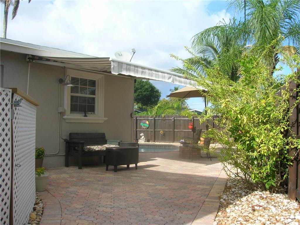 Beautiful ready to move in. This 3 bedroom ,2 bath home with a pool and covered patio has a fire pit as well as a wood deck for entertaining. corner property is a quiet interior street with a fenced pool and back yard. Retractable awing near the pool. Brand new roof . Storage shed as well as washer and dryer and refrigerator off the carport. Beautiful wood floors with an updated kitchen with new cabinets . counter tops and backsplash and a deep stainless steel sink . Updated bathrooms. Lots of storage in tall kitchen cabinets. a pantry in the family room with a washer and dryer hook up. Do not miss this one ! It will not last.