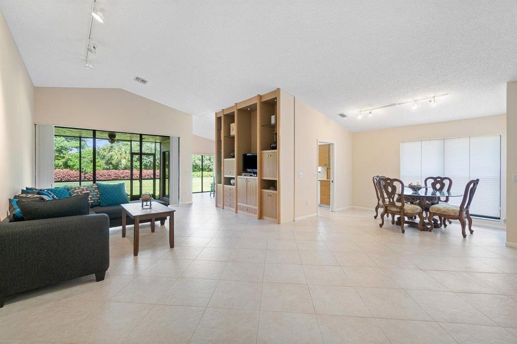This home has fantastic natural light, vaulted ceilings, and is super spacious with a huge great room overlooking a large green space of the 5th hole on the golf course. It has a large lot on a quite cul de sac w/ 3 bedrooms, 2 baths, all tile throughout, 1 private screened in covered patio, and another open screened in patio both w/ beautiful golf course views. The roof is 2006, A/C & water heater are 2017, & the 2 car garage has been converted to a 1.5 but could be converted back. Boca Woods is a 24 hour manned gated community and offers two 18 hole golf courses, driving range, tennis & fitness center, pool, pickle ball, dining, & much more. It has a Mandatory Membership of $65,000 and $30,000 refundable when you sell, dues $16,215 +tax/yr - minimum in dining room $1,000 +tax/yr.