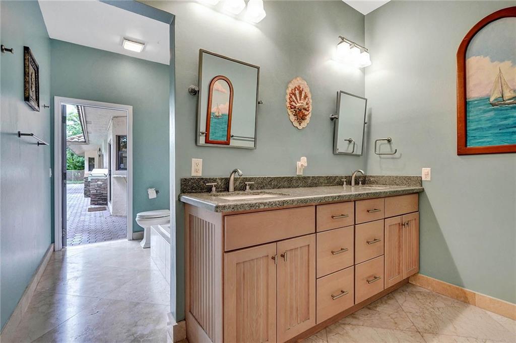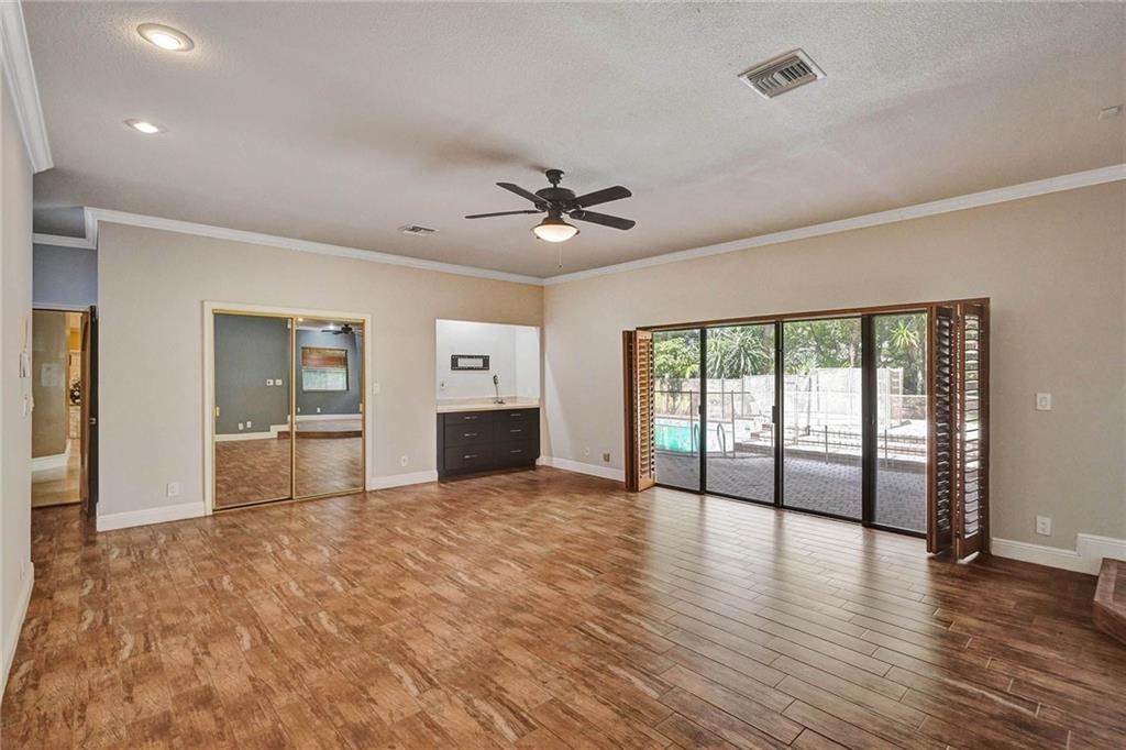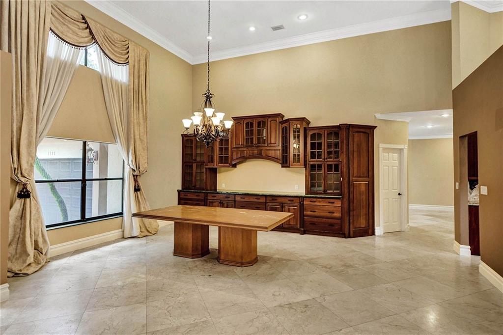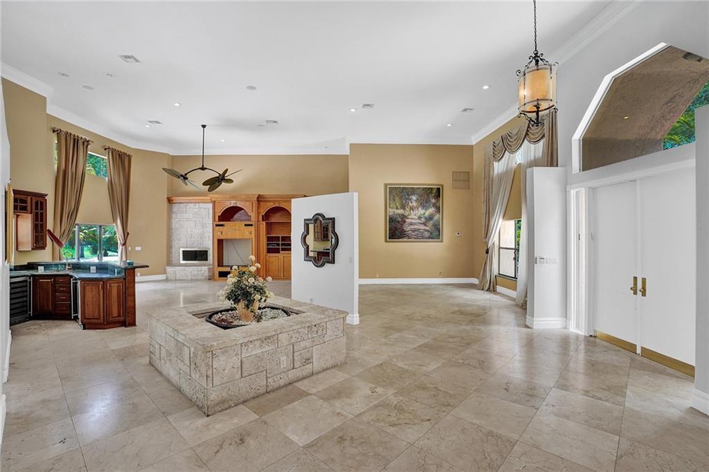 Tree-lined, cul-de-sac on 18000sf pie-shaped, water lot invites you into dramatic 1 story w/ 16' ceilings accented by dbl crown moldings, remodeled kitchen & baths in this 6/4 & sitting area, split design. In the KT, Wolf & Miele stainless appliances. pull down shelves w/soft close drawers, tumblestone backsplash & More!! Center island w/ disposal & full cabinetry. Koehler fixtures in baths w/designer vanities. Dual-side showers in 2 baths. Huge main bath w/jetted tub & multi feature shower. Owners wing over 1000sf w/plantation shutters! Coral Rock Fireplace, first-class built-ins in the FR, DR and Den. Lg wetbar w/pass through, refrigerator & wine chiller. Lg covered patio with pool and elevated spillover spa, with baby fence overlooking water. See attachment for EXTENSIVE features list.