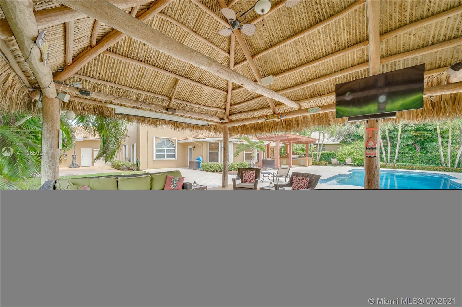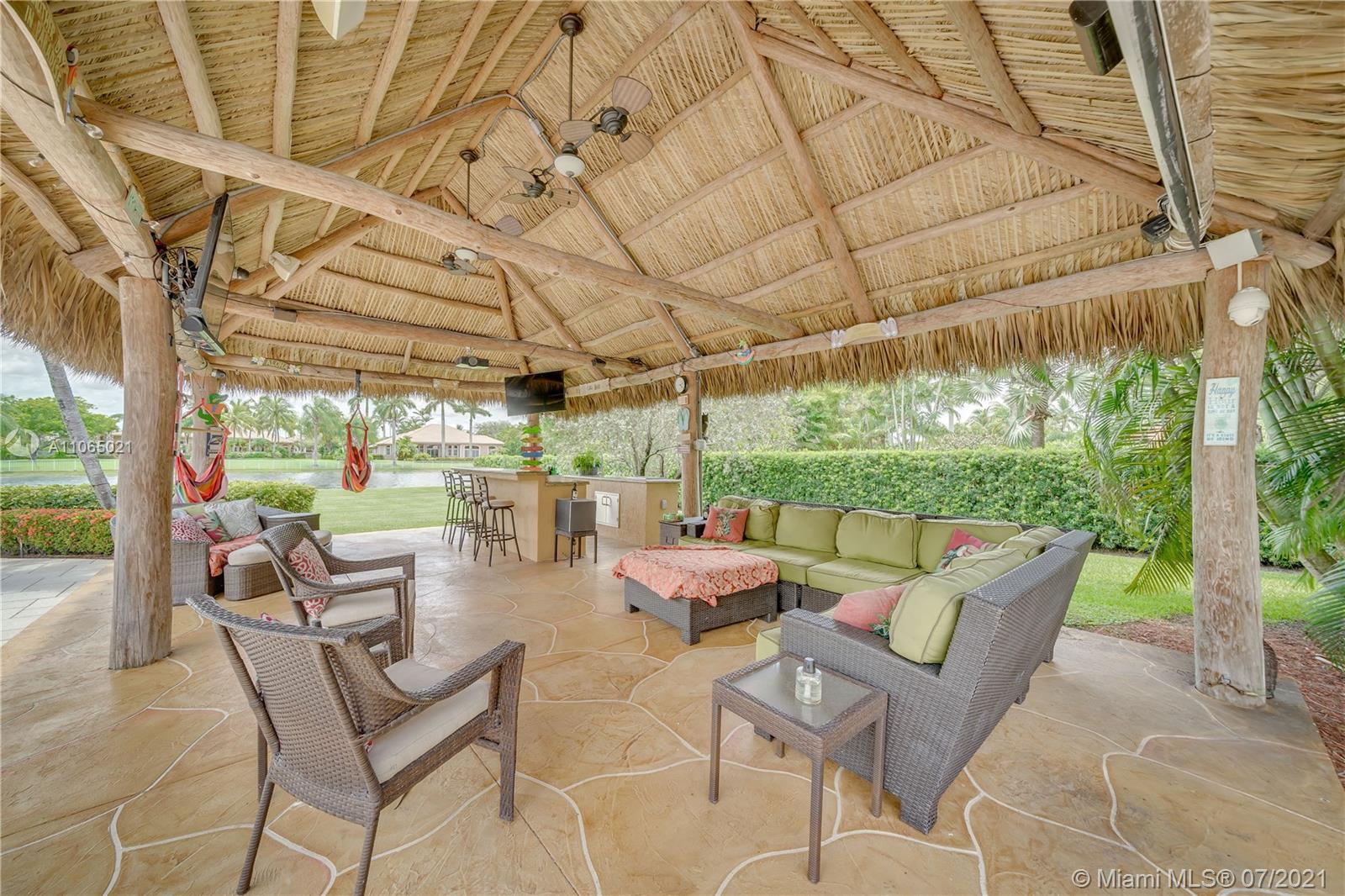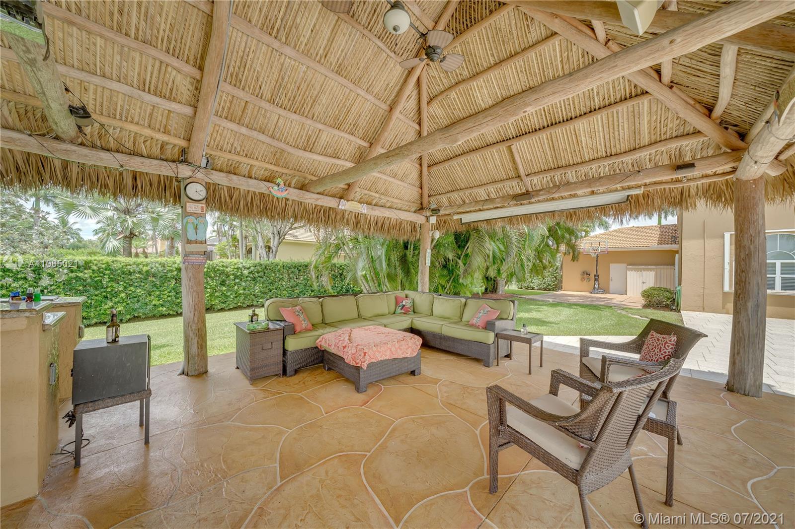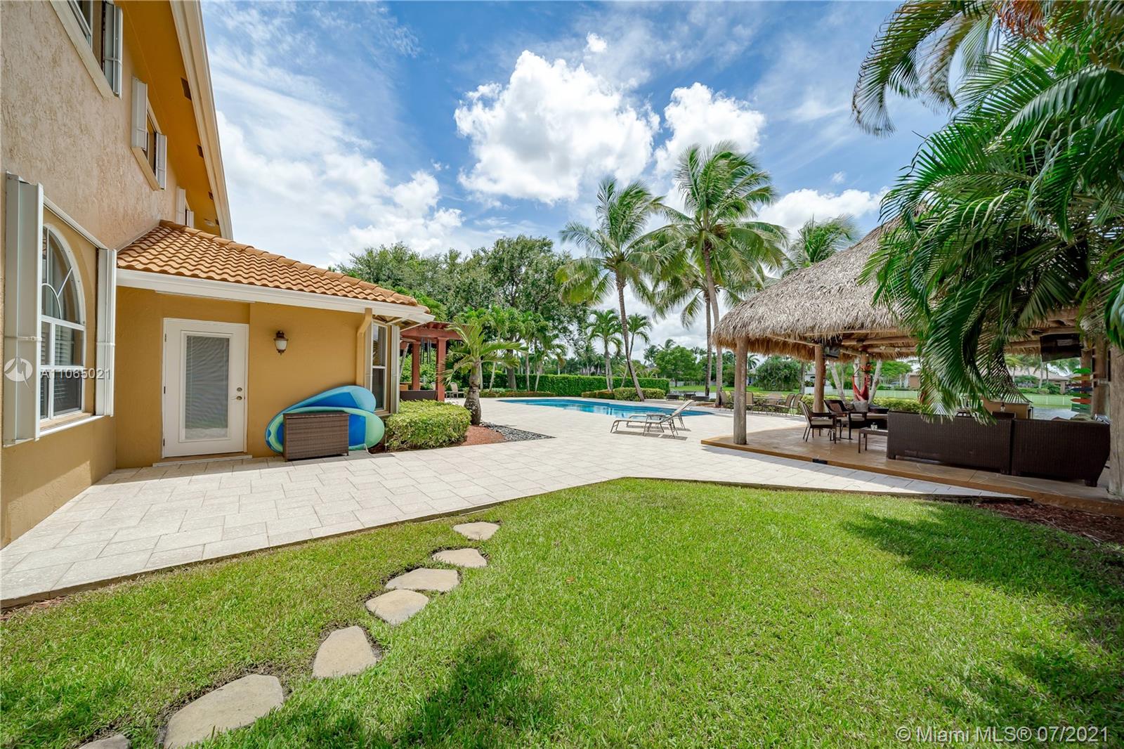 This serene lake estate offers an outdoor lifestyle as well as all the comforts you are looking for in a magnificent spacious home. Soaring entryway welcomes you. Formal living & dining room. Oversized chef's kitchen, breakfast area, open family room with an office/playroom where you can enjoy views of the stunning backyard from every room. Spectacular sunset views as you relax under your 800 sq. foot tiki hut with bar, 2 TV's and movie projector. Oversized pool, Summer kitchen, half BB court, boat launch and fire pit area are added to the upgrades list. Full house generator & a 500 gallon natural gas tank allows for 2 weeks of non-interruptive electricity. 3 car Housewall garage system, oversized driveway for 12 cars. Impact doors and Accordion shutters throughout. Don't miss this gem.