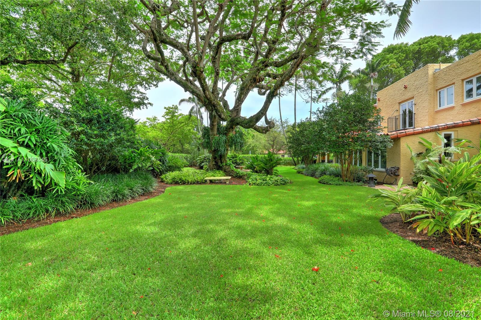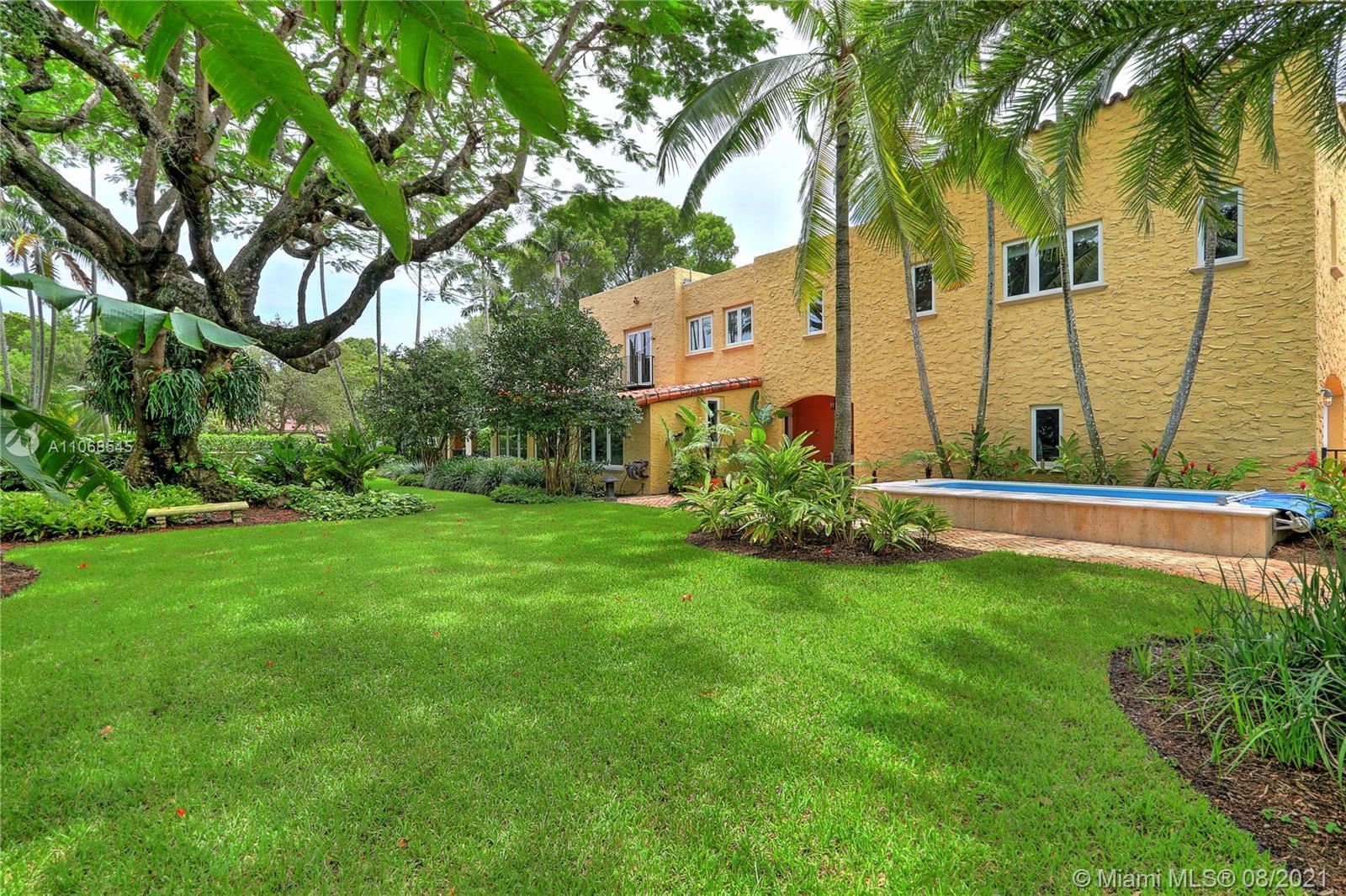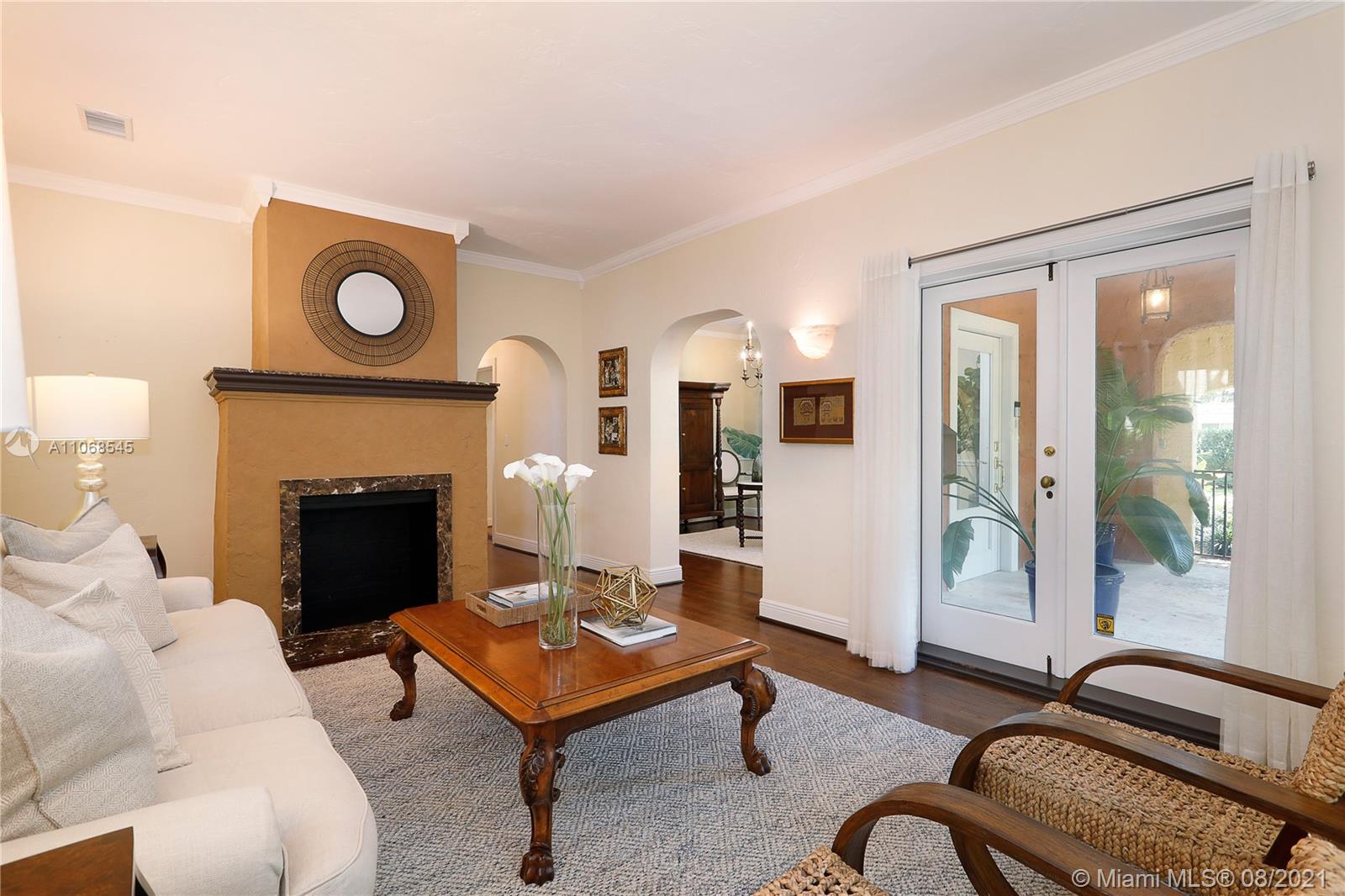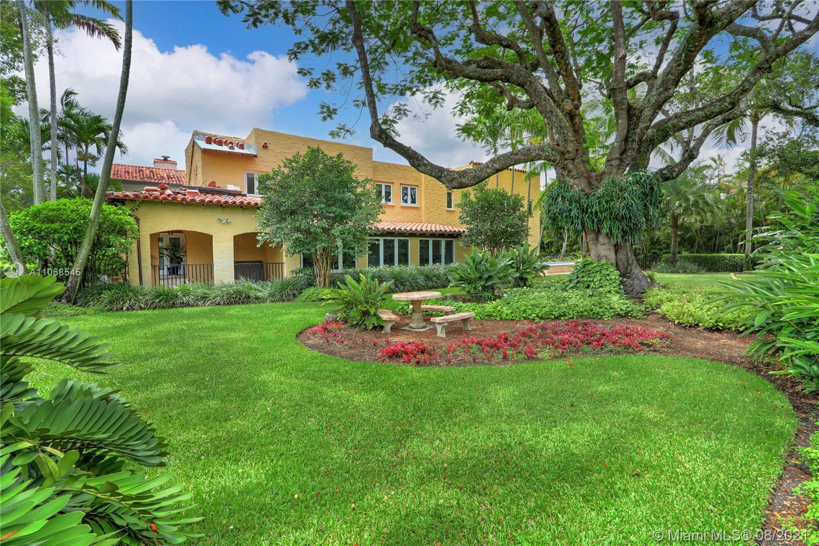Absolutely lovely & special Old Spanish in prime Golden Triangle location on lush, private 14,000+ SF lot down the street from the Biltmore. This property has been meticulously maintained & updated w/ brand new roof, impact glass, & renovated kitchen. A large addition houses the primary suite w/ generous BA w/ Jacuzzi tub, seamless shower, & 2 closets. Upstairs there is also an office, 3 BRs, 1 BA, laundry rm + 1 more BR & BA downstairs. Formal living rm, fam rm w/ wall of windows, large foyer, open air entry w/ original columns, 2 car gar, rear driveway, & carport. Wonderful details incl wood flrs, Chicago brick drive & patio, trellised arches creating a secret garden effect, built-ins, working fireplace, wood beamed ceilings, Endless Pool, & beautiful wall around tropical garden.
