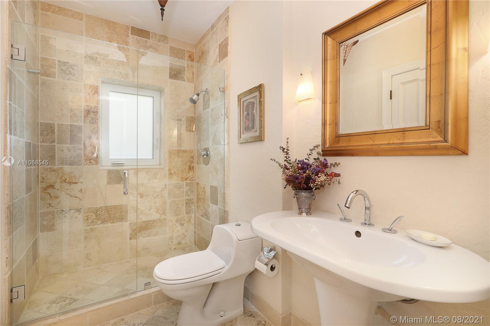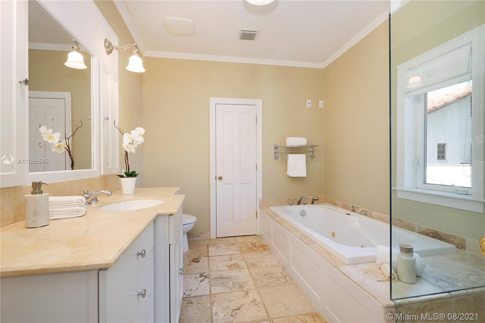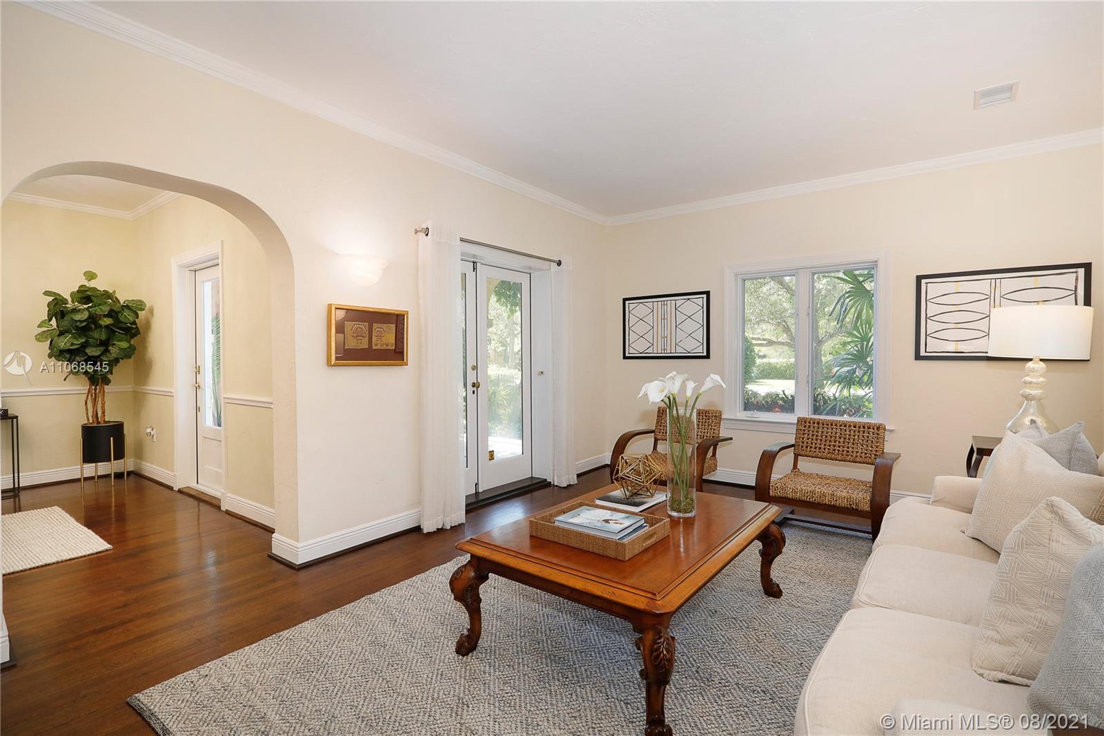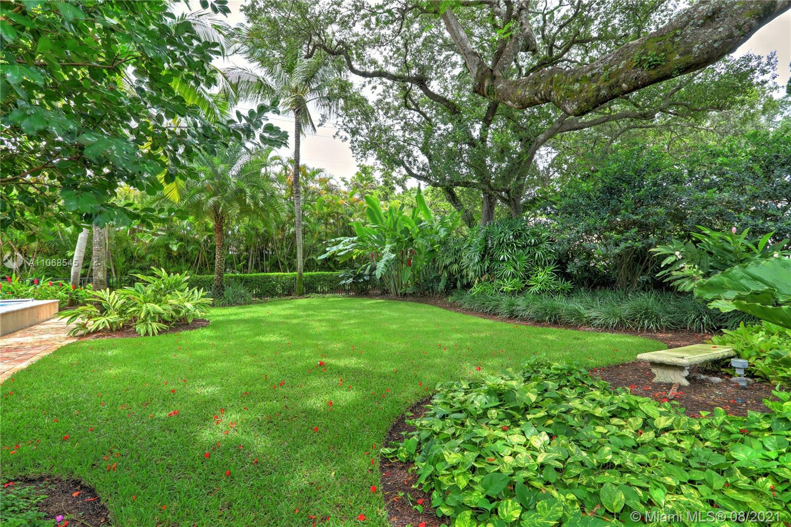 Absolutely lovely & special Old Spanish in prime Golden Triangle location on lush, private 14,000+ SF lot down the street from the Biltmore. This property has been meticulously maintained & updated w/ brand new roof, impact glass, & renovated kitchen. A large addition houses the primary suite w/ generous BA w/ Jacuzzi tub, seamless shower, & 2 closets. Upstairs there is also an office, 3 BRs, 1 BA, laundry rm + 1 more BR & BA downstairs. Formal living rm, fam rm w/ wall of windows, large foyer, open air entry w/ original columns, 2 car gar, rear driveway, & carport. Wonderful details incl wood flrs, Chicago brick drive & patio, trellised arches creating a secret garden effect, built-ins, working fireplace, wood beamed ceilings, Endless Pool, & beautiful wall around tropical garden.