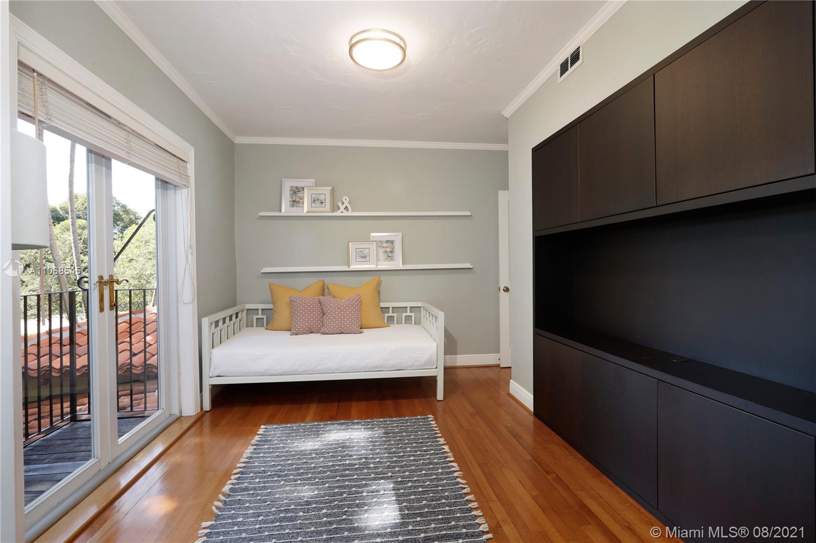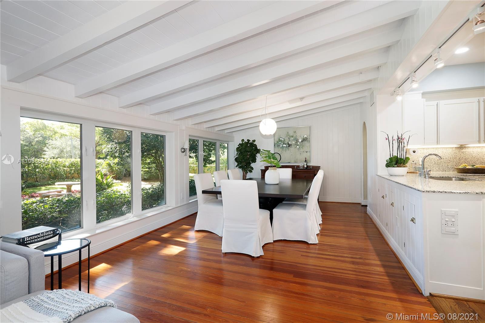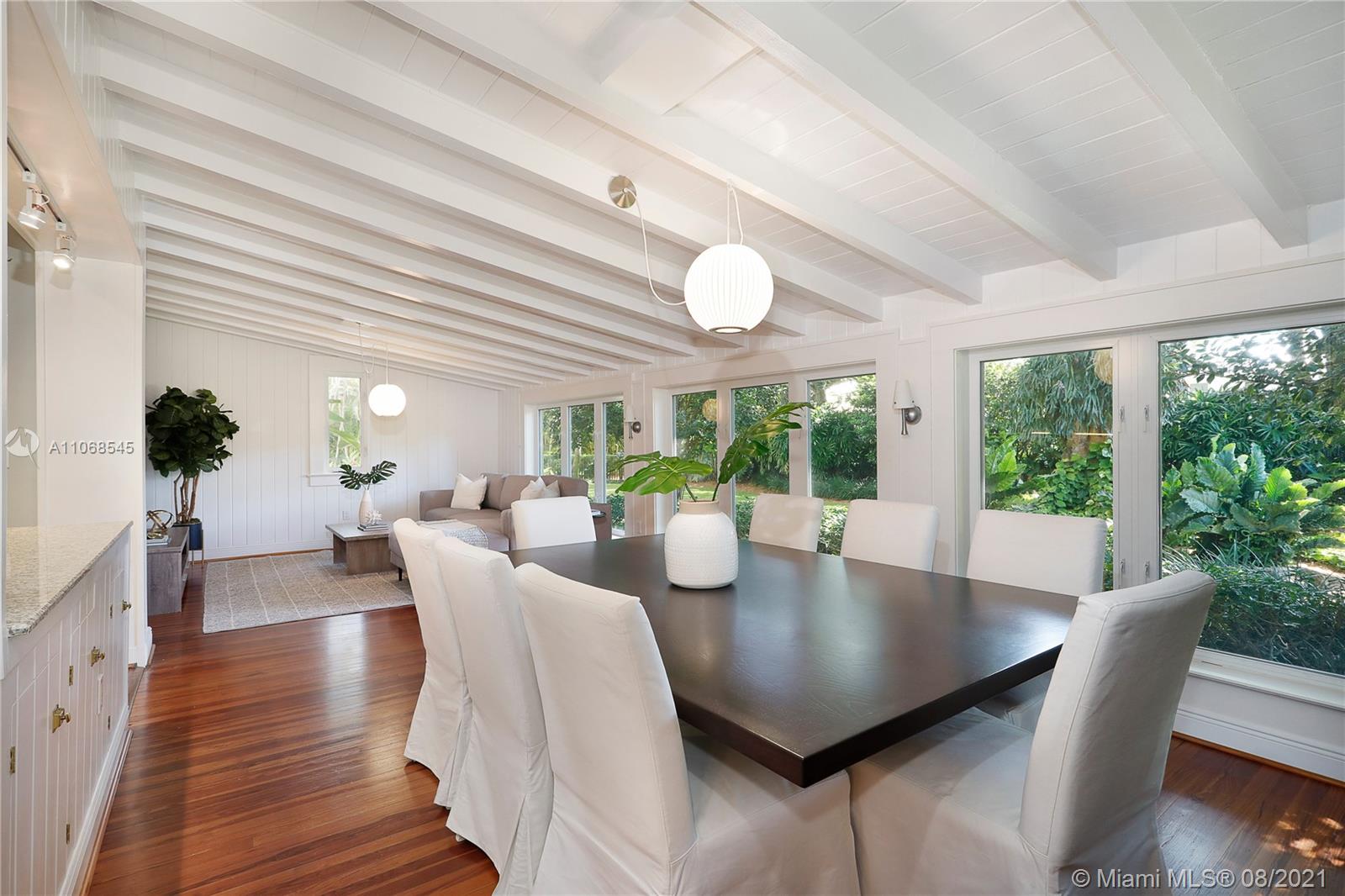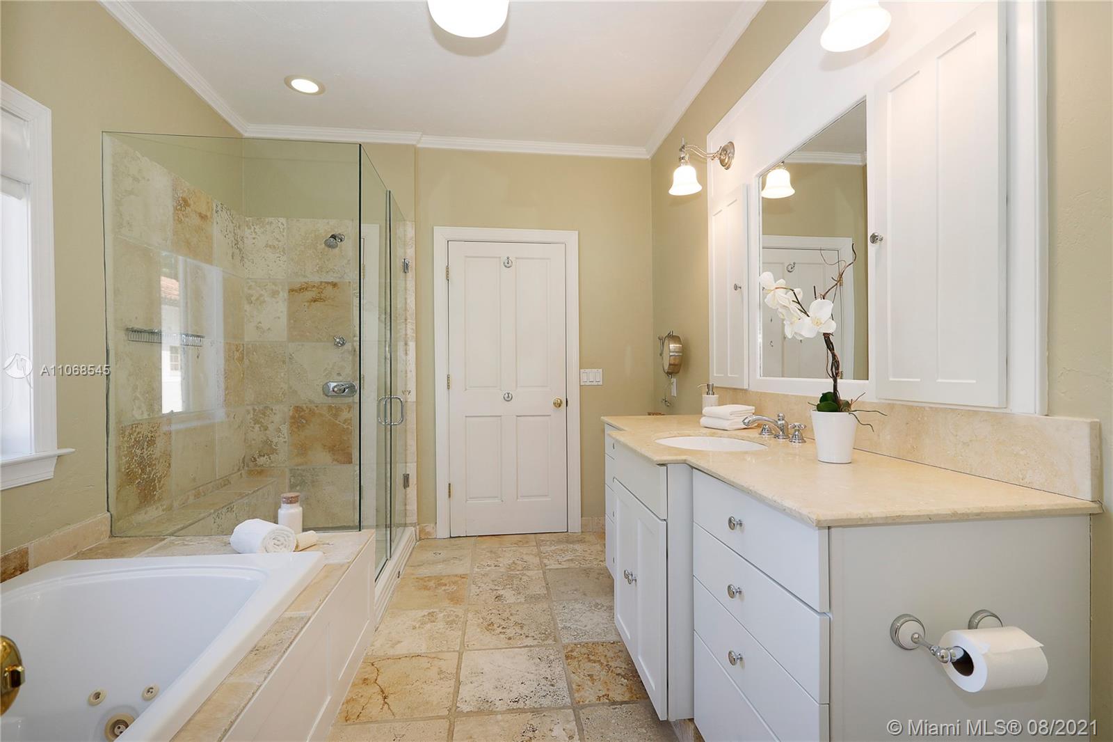 Absolutely lovely & special Old Spanish in prime Golden Triangle location on lush, private 14,000+ SF lot down the street from the Biltmore. This property has been meticulously maintained & updated w/ brand new roof, impact glass, & renovated kitchen. A large addition houses the primary suite w/ generous BA w/ Jacuzzi tub, seamless shower, & 2 closets. Upstairs there is also an office, 3 BRs, 1 BA, laundry rm + 1 more BR & BA downstairs. Formal living rm, fam rm w/ wall of windows, large foyer, open air entry w/ original columns, 2 car gar, rear driveway, & carport. Wonderful details incl wood flrs, Chicago brick drive & patio, trellised arches creating a secret garden effect, built-ins, working fireplace, wood beamed ceilings, Endless Pool, & beautiful wall around tropical garden.
