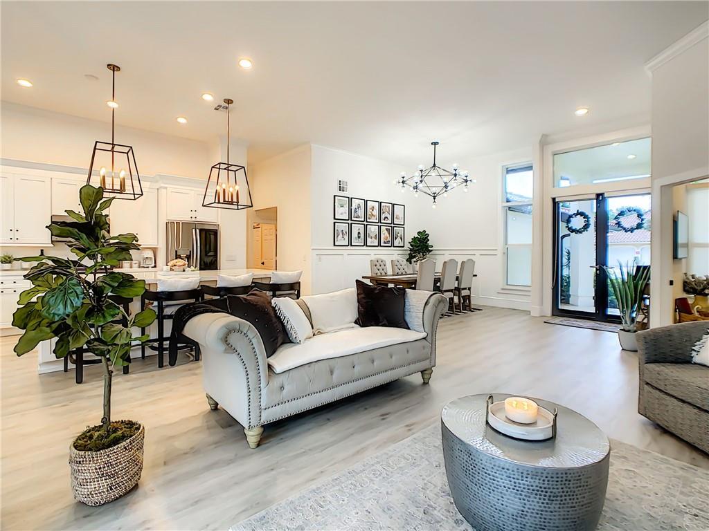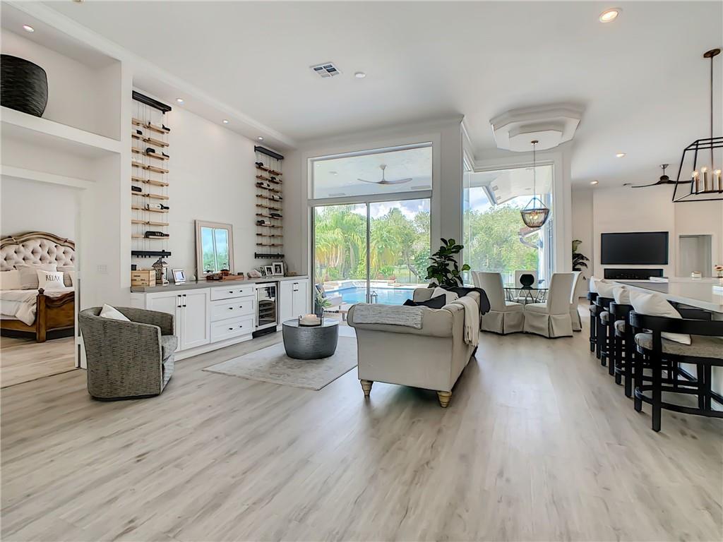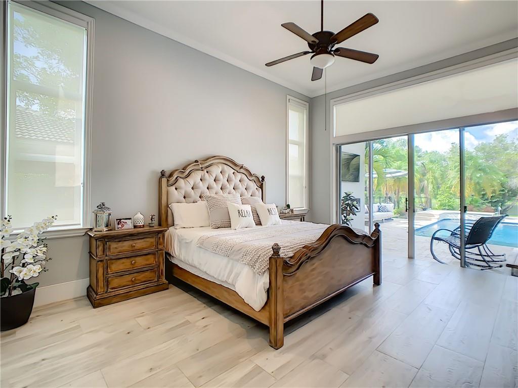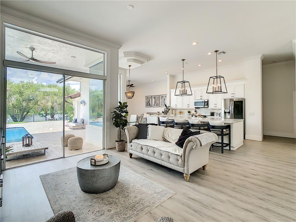 Stunning 6 BR, 4 bath pool & waterfront home on an oversized lot! Upgrades galore! Modern open floor plan with views to the newly remodeled patio, pool, and putting green. The outdoor oasis features a 2,000 sq ft travertine pool deck along with a salt water pool, outdoor fireplace wall perfect for a tv sitting area and views to the tranquil lake. The kitchen features an extra large Quartz countertop and is a newly upgraded chef's kitchen. A new curved tile roof was installed in 2019. New A/C units installed in 2021. All 4 bathrooms upgraded including the master bathroom which features a beautiful marble wall and stand alone soaking tub. 3-car garage w/ hurricane-rated door! Upgraded security system w/ cameras! This house will not last!