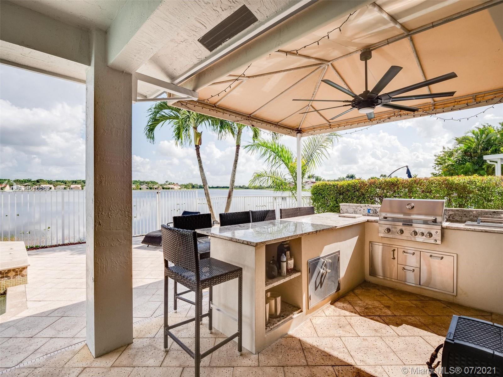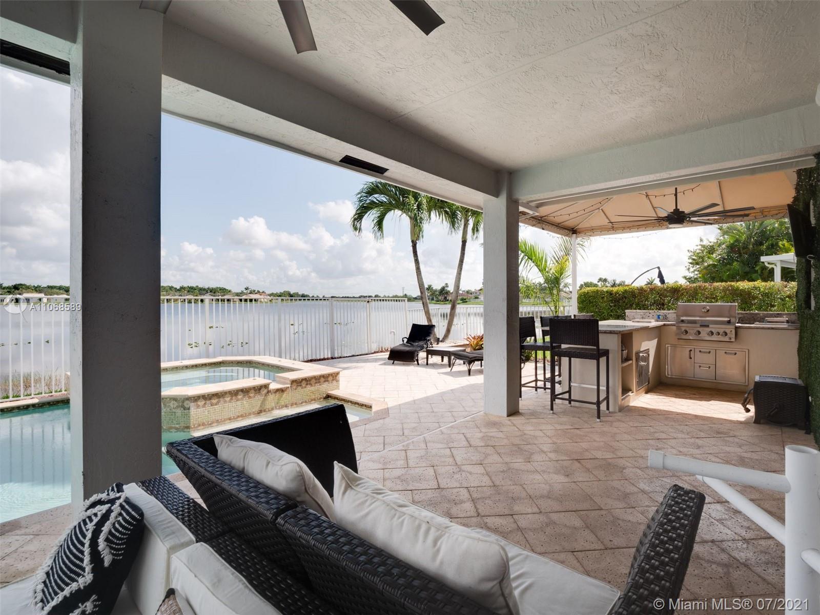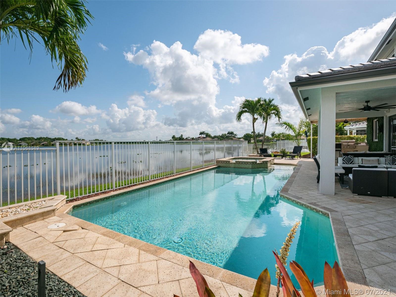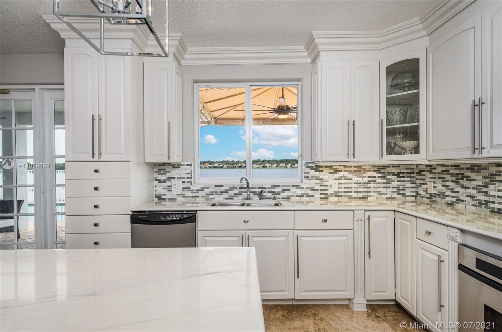 Enjoy one of the most spectacular wide-lake waterfront views from this completely updated pool home. Situated on one of the largest lakes in Weston, this 3,700sf 5 bed/3 bath professionally decorated home has it all. No detail has been overlooked. NEW ROOF!! Marble & wood flooring throughout. 1 bedroom & bath downstairs. Open kitchen design including subzero refrigerator & double ovens. Oversized master suite with sitting area, 2 large walk-in closets and coffee bar. Modern master bath w/ separate vanities, bath tub & walk-in shower w/ multiple shower heads/body sprays. Custom built-ins including bar and wine storage, pool/spa automation, freshly painted, modern window treatments, accordian shutters, & A+ schools just begin to tell the story of this sophisticated Highland Meadows home.