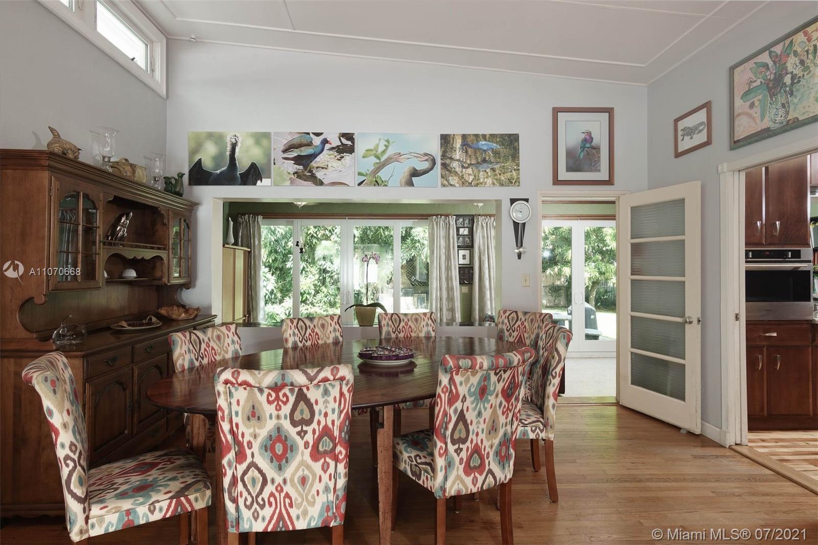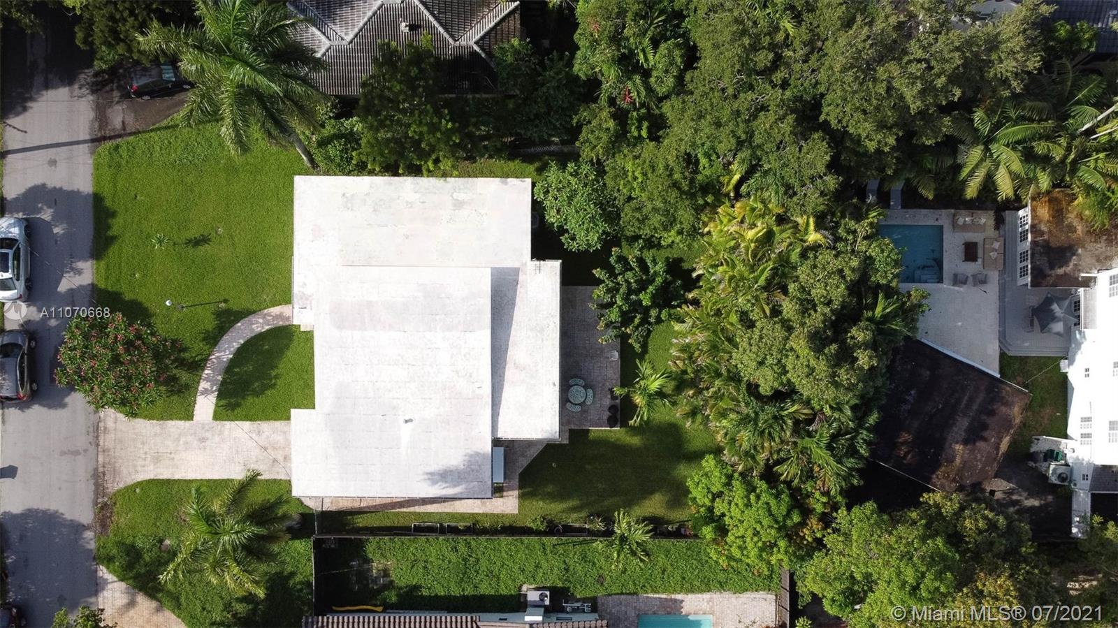 Magical Mid-century modern East of US-1 on a quiet street, Miami Shores. Big fenced/private yard with fruit trees, patio and room for a pool. Attached 1 car garage with laundry and extra storage. Open floor plan with high ceilings, huge living room, great dining area, and awesome Florida/family room overlooking the garden. Amazing natural light. 2 bedrooms and 2 full baths. Large updated eat-in kitchen with granite and stainless steel, ample cabinet and countertop space. Natural gas hooked up to the cook-top, tank-less H2O heater and dryer. Oak and terrazzo floors. Impact windows and doors, sprinkler system and more. A Must See!