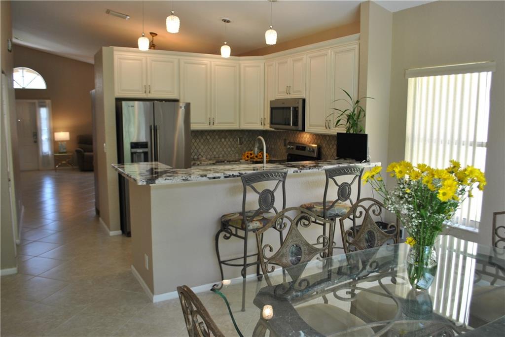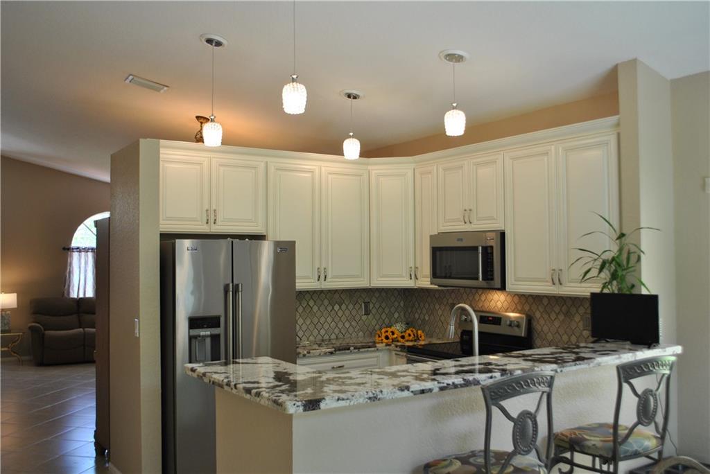 Magnificent, immaculate home featuring split bedroom plan, vaulted ceiling. Remodeled 2 yr new kitchen w/granite countertop, top-grade backsplash, and S.S. appliances. Newer renovated bathrooms featuring seamless shower door in primary bath plus a Roman tub. Inside and outside freshly painted. Inside walls are textured. 18" diagonal tile throughout, paver driveway, walkway & patio. Cul-de-sac lot location. 3 bedroom PLUS A 12x8 extra room w/closet that can be utilized as an office, playroom etc.. Community pool and clubhouse.