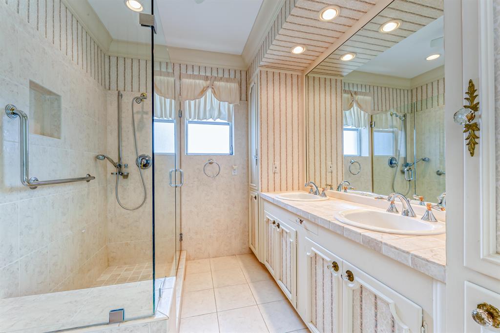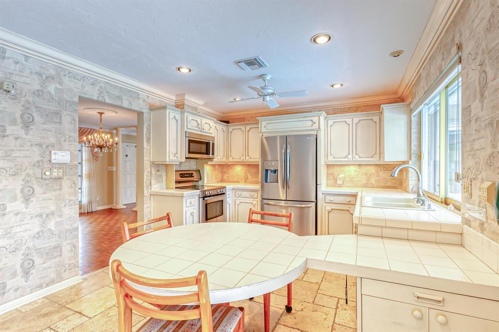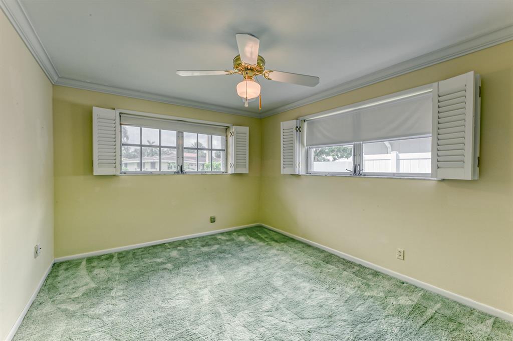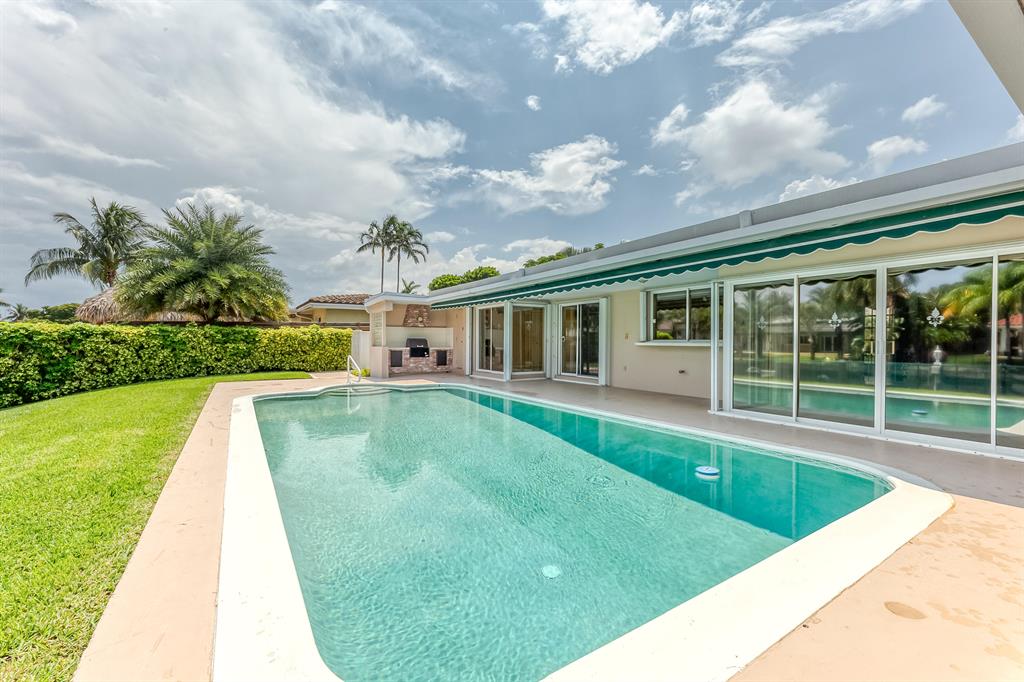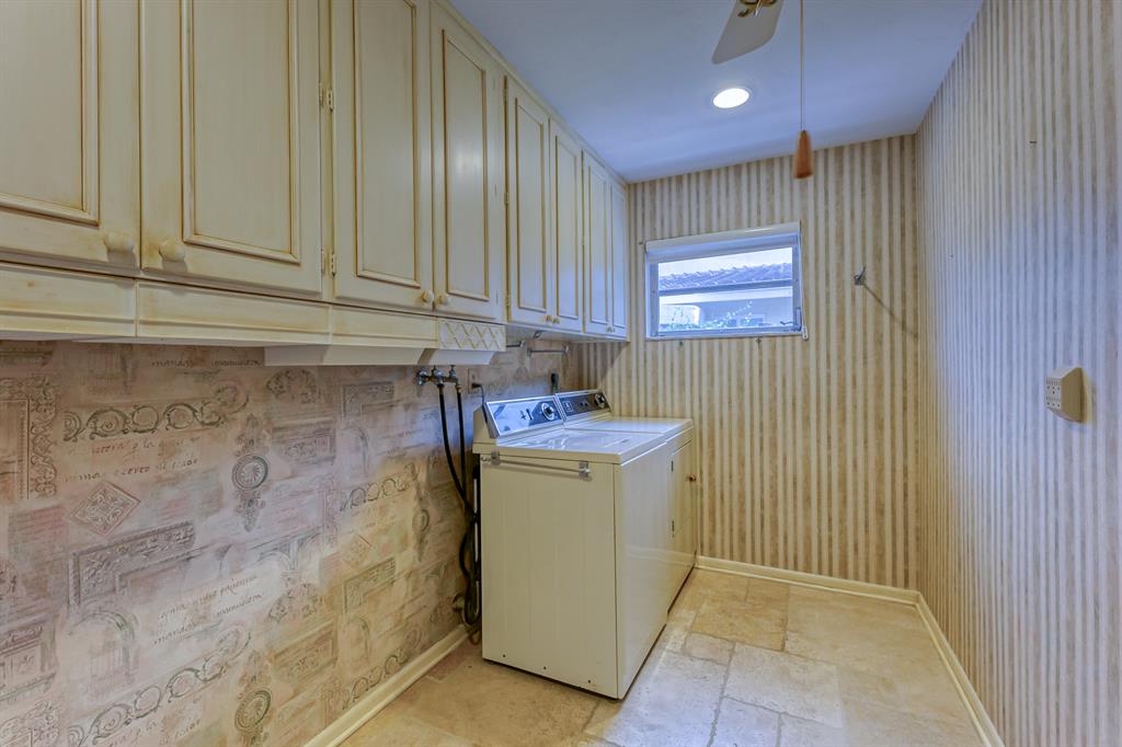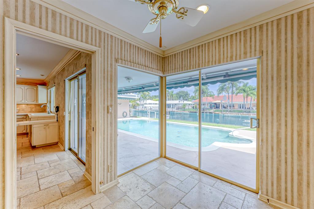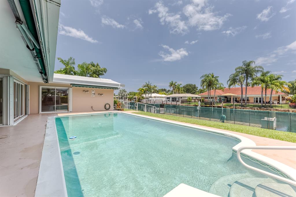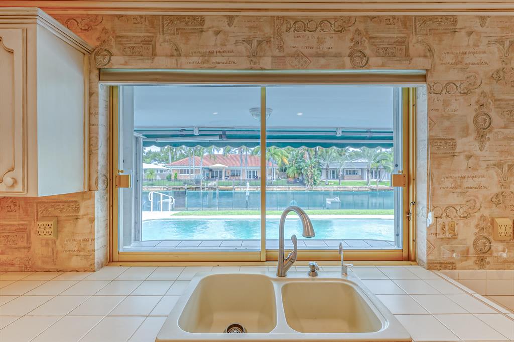 4 Bed/3 bath with an extra rm for an office. 4 Bedrm being used as a den. Newer kitchen, master bath & full cabana bath. Crown molding. Large kitchen w/ light wood cabinets, tile counter tops, Hi Hats, knockdown ceilings & breakfast table. Travertine Flrs. Kitchen has a great view of the pool & water w/ a pass through to outside counter. Accordion shutters & impact doors. Walk in closets. Formal dinning area. Huge circular driveway with pavers. 85 feet water frontage, 48 ft dock w/ electric & plumbing. Protective see thru fence on the seawall for your children an pets & seawall footer was added in 2020. A/C is 2020 and water heater 2013. Covered patio w/ electric retractable awning for more shade over the pool. Inside laundry rm. 35 ft boats no problem. This house has been well maintained