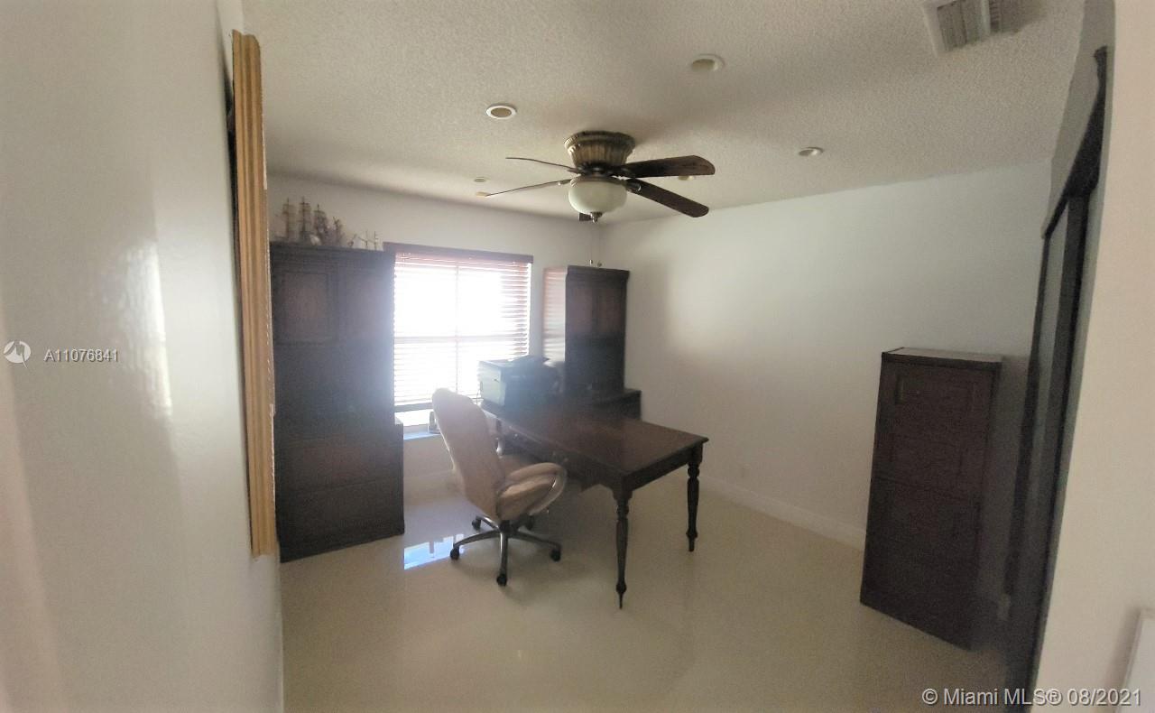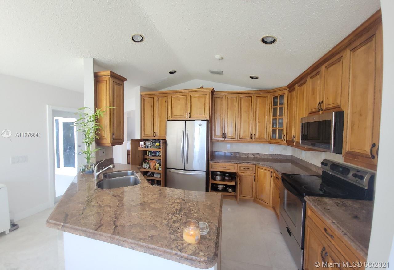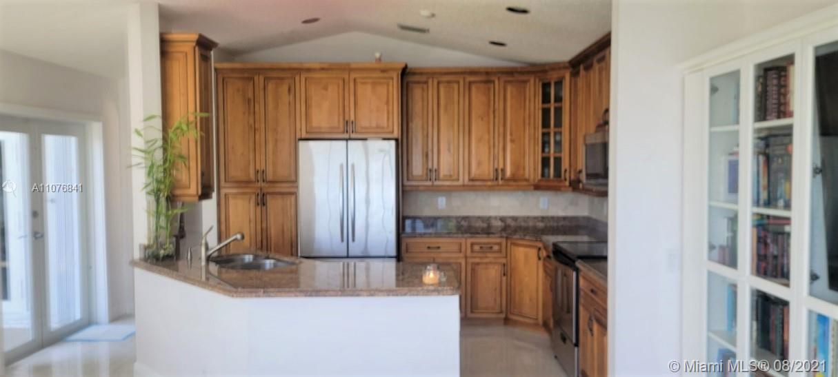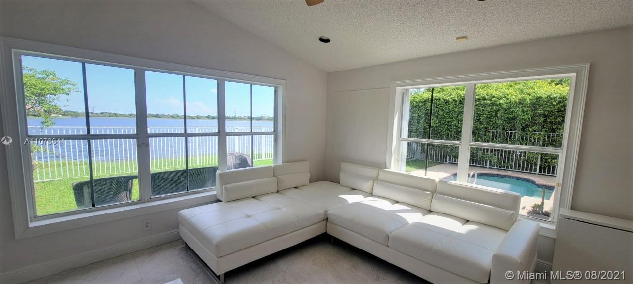 From the moment the door is open you can see this amazing water view that can be enjoyed not only from the living room and family room but also from the master bedroom. Tranquil waters that will live you breathless and relaxed. Bright and airy home with imported porcelanato floors from Spain. Kitchen has high costume made cabinets with SS appliances, pull out drawers, back splash and granite countertops. An extra refrigerator at the garage and shelving. Build ins in family room and one of the bedrooms. Bathrooms has been updated. Nice size back yard with pool spa. 4yr old AC, new water heater. Accordion shutters throughout. Spot lights that illuminates the house at night. House has been well kept by owner. Gated community, with pool, kids playground, basketball and volleyball courts.
