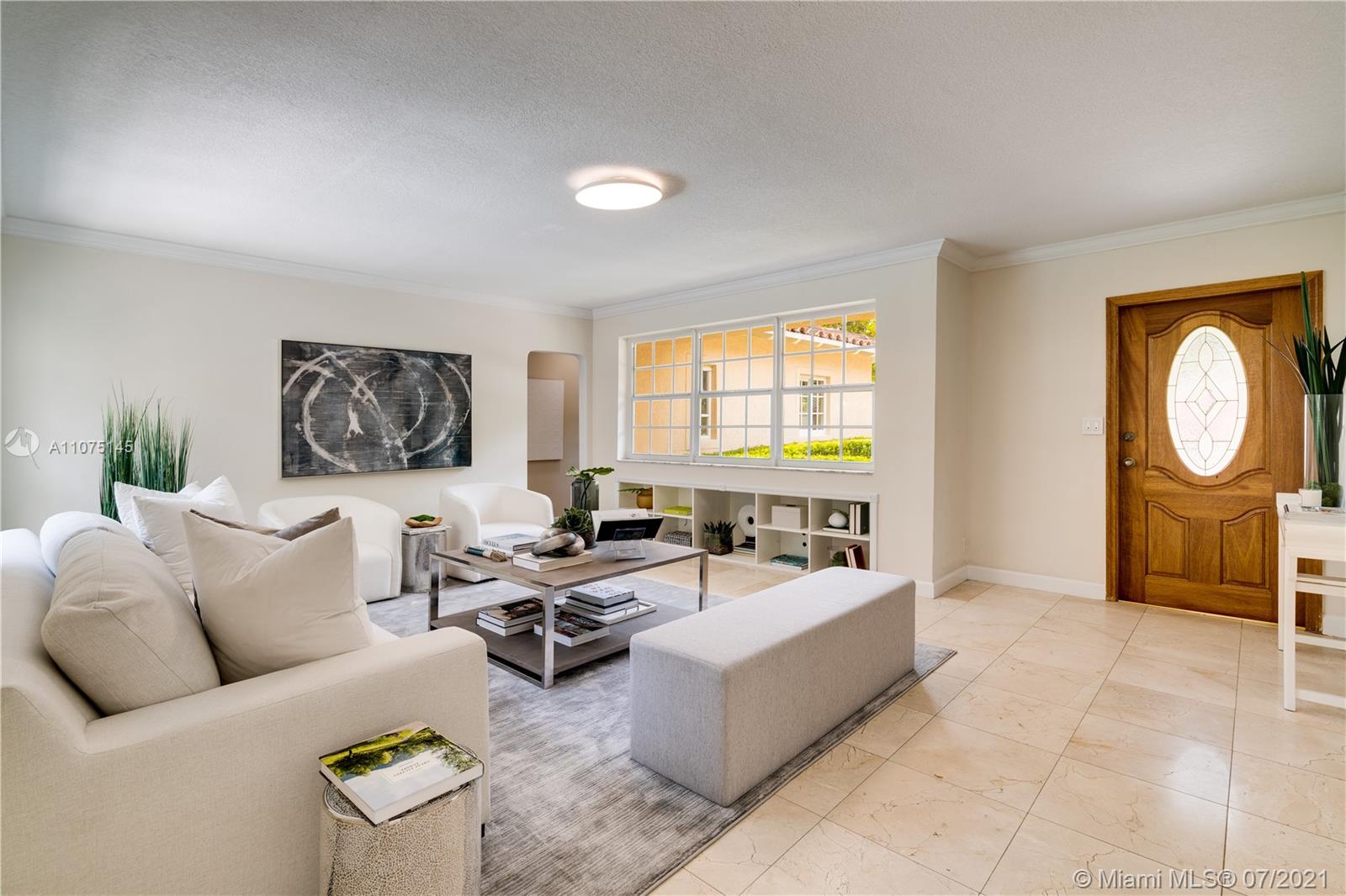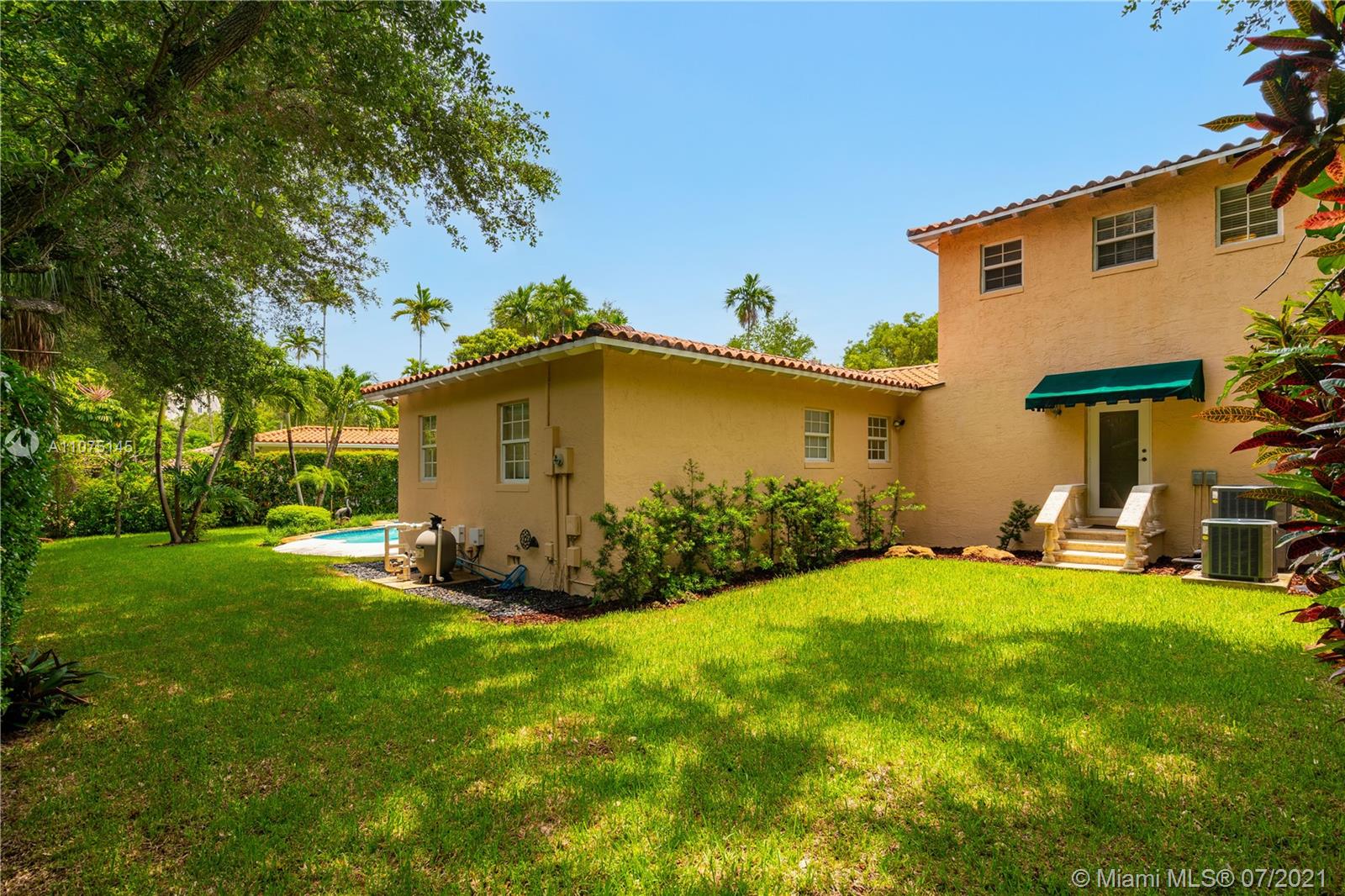 Urban living with the benefits of suburban space! Less than a 1/4 mile from Miracle Mile & all its restaurants & shops, lies this beautifully maintained & updated Coral Gables home on a 12,000 sf lot. Elegant brick circular driveway & front porch invite you in. A true split floor plan, there is an upstairs private primary suite w/free-flowing natural light, 2 walk-in closets, & a jacuzzi tub. There is a second en-suite bed/bathroom downstairs. Another 2/1 bedroom wing has original hardwood floors & plenty of windows for your vitamin D fix! There are family & living rooms w/impact doors/windows overlooking sizable yard w/free-form pool & deck. Spacious 2 car garage w/plenty of storage, & interior laundry. Lovingly cared for home ready for new family to make memories! A Very Special Home.