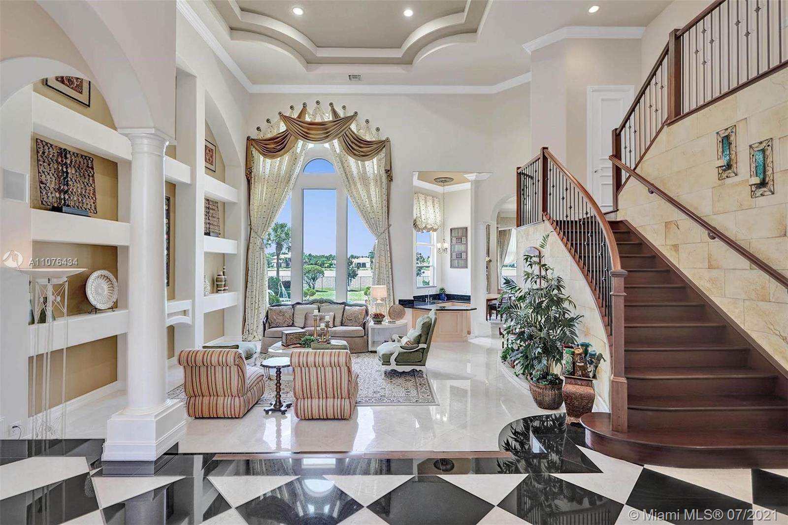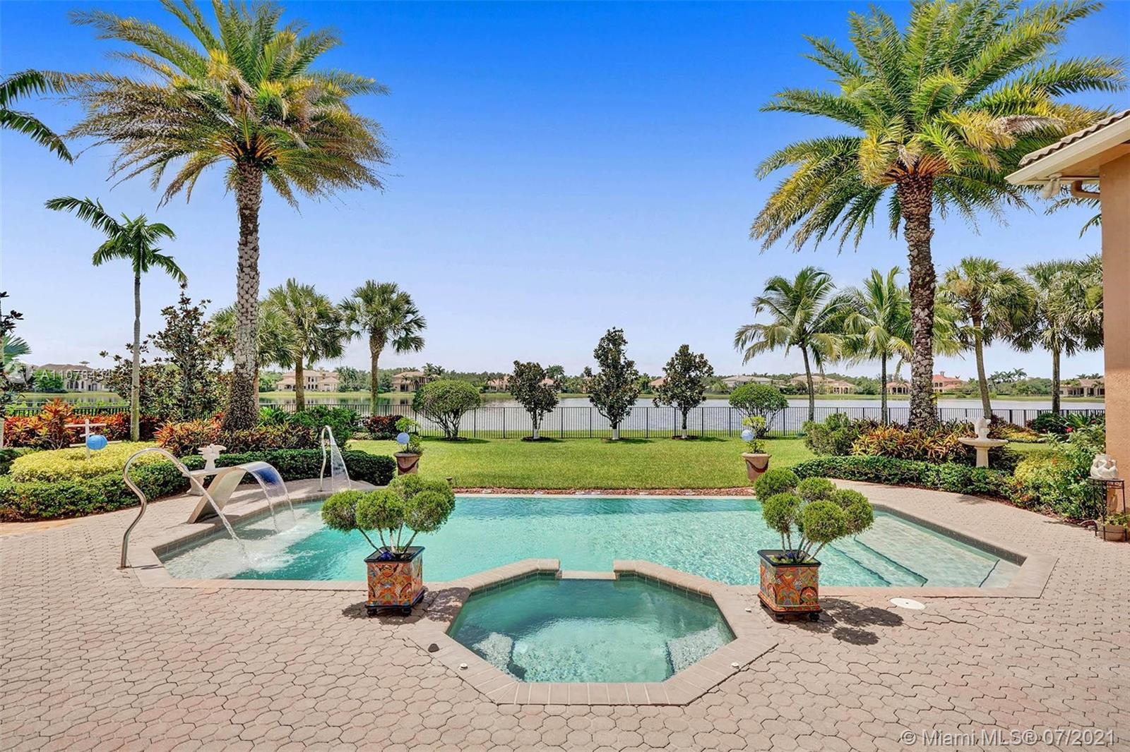 Elegant custom-built Vanderbilt model tucked in the 24 hr guard-gated community of Windmill Reserve at Weston.5,442 square feet under air. Sitting on over a 1/2 acre of lushly landscaped serenity with deep and wide lake view, scenic pathways, and fully fenced with sparkling infinity-edge pool and spa. Enjoy immaculately maintained and spacious 5 bedrooms+office+game room, 6 full baths & 3 car garage. Owner's suite on the first level with sitting room. Luxurious marble owner's bath. Marble and wood flooring throughout living areas. Grand staircase to the second level. Summer kitchen with large patio overlooking the peaceful and beautiful green and garden areas.
