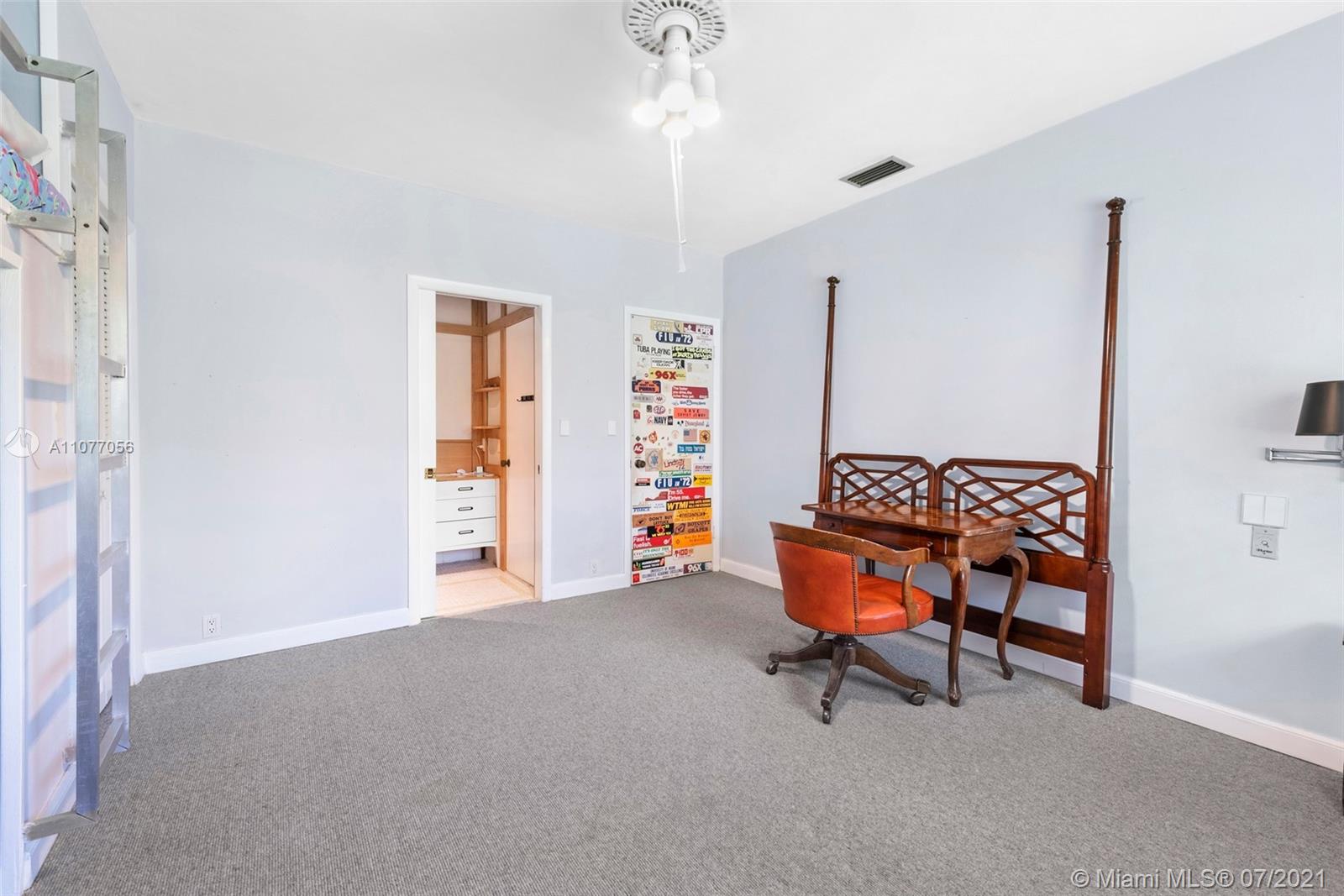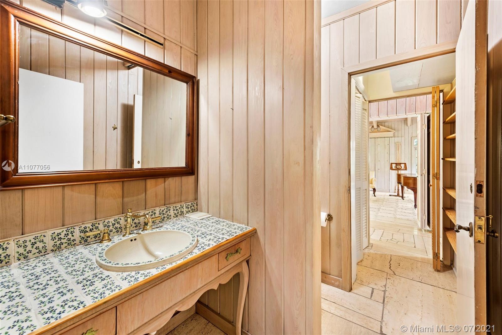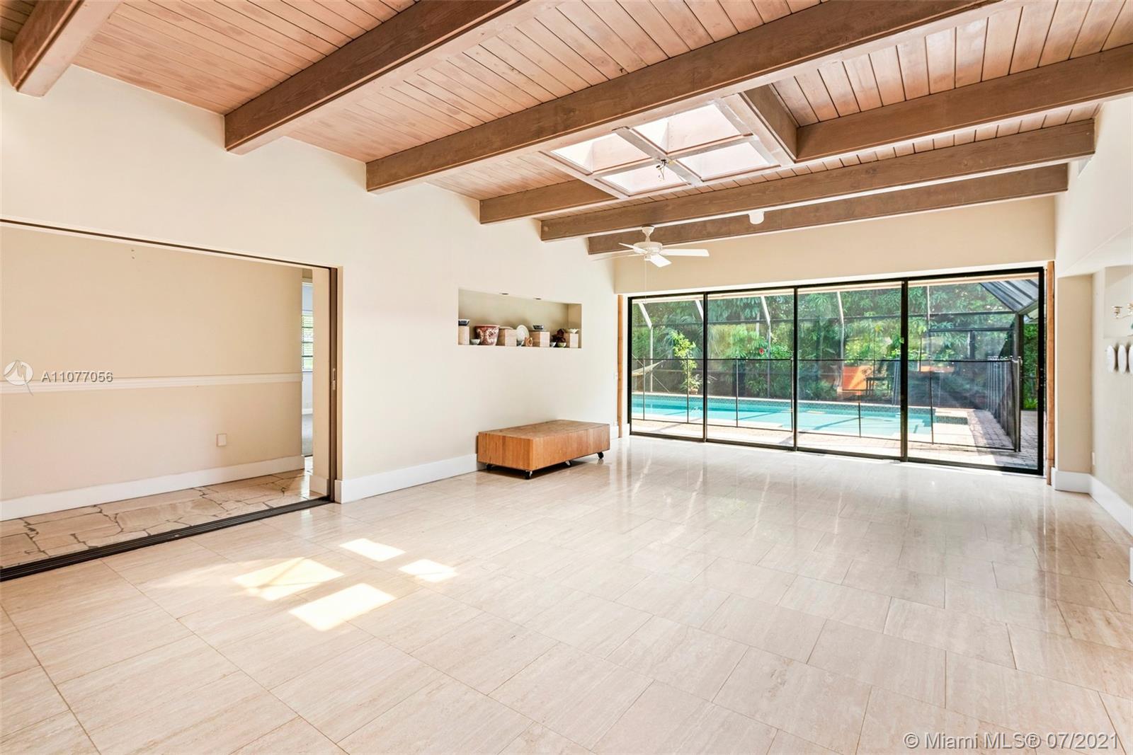 A wonderful home on one of the most beautiful streets of Pinecrest is on the market for the very first time since it was constructed. The home was built like a fortress and is ready for a fantastic upgrade. Beautiful natural light pours into the home throughout its ceiling skylights found all around the home. The grand primary suite features an impressive double-height fireplace, vaulted ceilings, a romantic wall of French doors leading to a courtyard with greenery, oversized master bath and WI closets. Marble stone flooring and cathedral wood ceilings add a timeless elegance. There is also a library, Florida room, sun room, formal dining and living, tennis court and a gorgeous sunny screened pool deck. Wonderful lush grounds. Laundry and staff quarters. Newer AC system and roof.