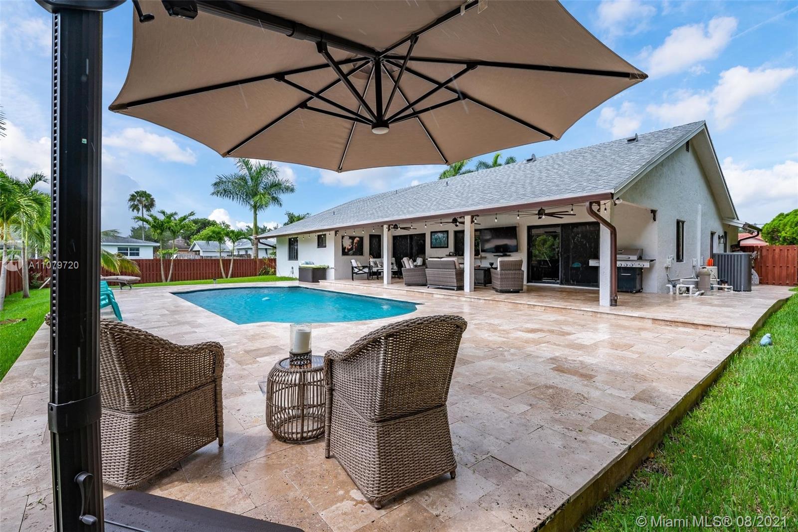 Beautiful 3/2 Plantation Acres home on a fenced half-acre cul de sac homesite. Completely updated from top to bottom. Huge master suite. 2017 roof, impact windows/doors, new kitchen with stainless steel appliances and quartz counters, a/c 2018, Genrac standby generator 22000KW with 2 110 propane tanks, seamless gutters, travertine marble pool deck and remodel, new shadowbox fence, exterior paint 2019, new water heater and bath remodels 2021. This one checks all the boxes. Gorgeous covered patio with custom landscaping in front and back. Close to shopping, Sawgrass Mills Mall and highways.