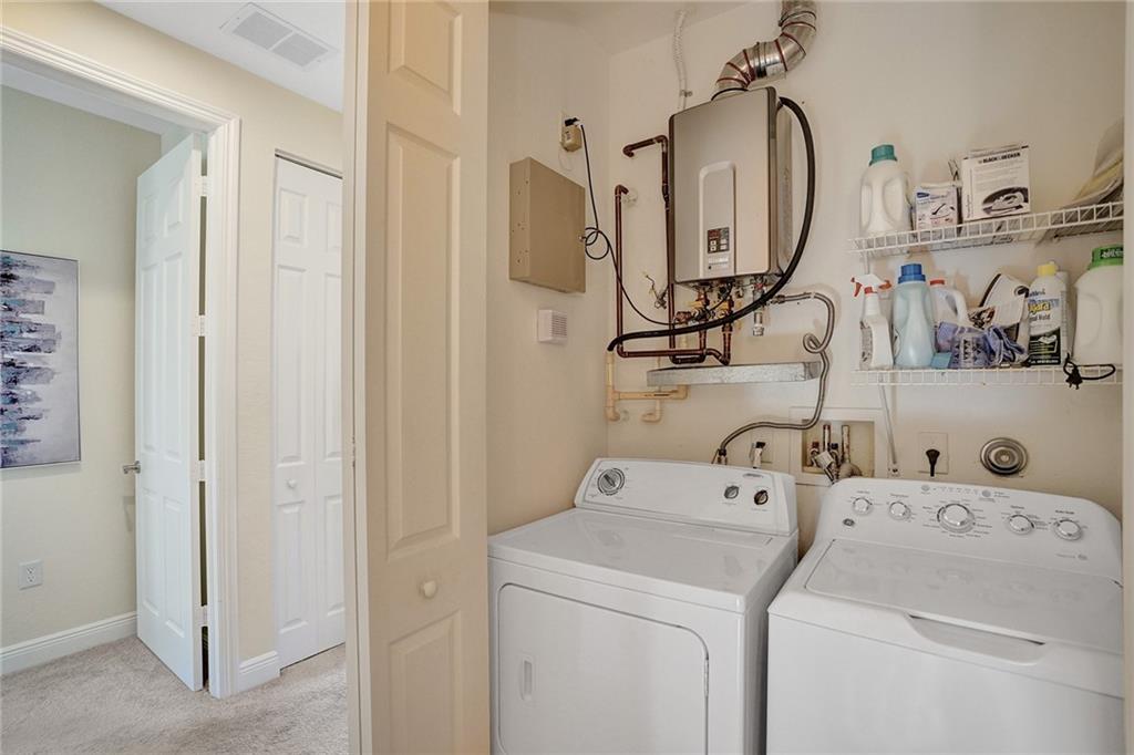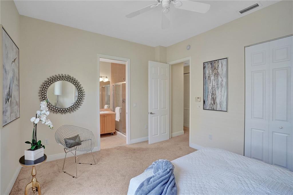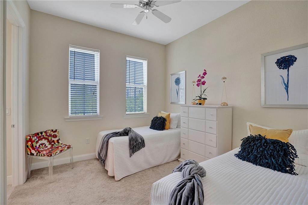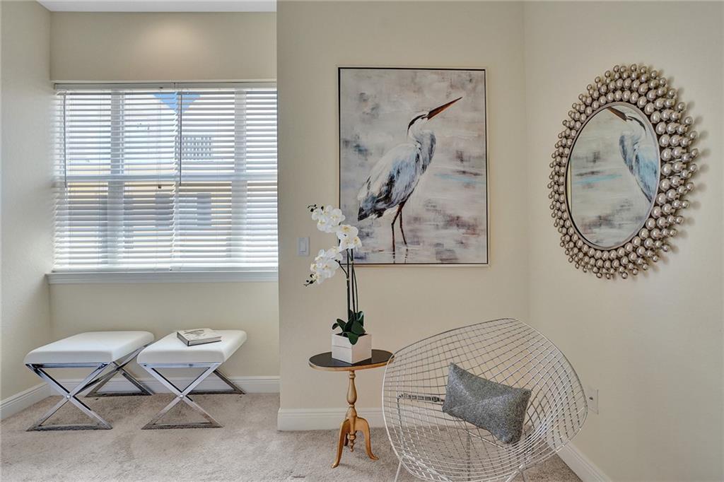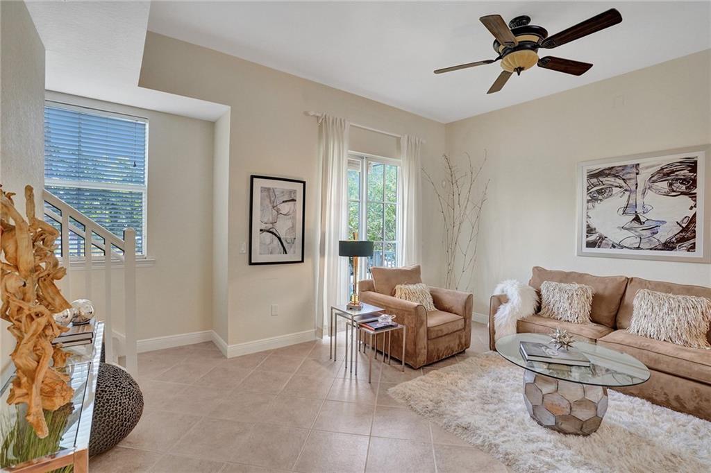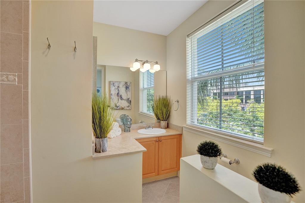 Victoria Park Elegant 3 story townhouse features 2 Bedrooms & 3.5 Bathrooms & a 2 car garage!.....On 1st floor is a bonus room which is presently used as office;( desks & cabinets stay); but perfect den or 3rd bedroom & has a full bath....Gated front court yard great for your pets....2nd floor features volume ceilings, a 1/2 bath, custom kitchen w/ granite breakfast bar, stainless steel appliances, gas range, generous cabinet space & granite counter tops overlooking dining room & living room....Tile floors on 1st & 2nd level are laid at a diagonal....On 3rd floor is washer/dryer & 2 master bedroom en-suites; w/ walk in closet in 1 Master Bedroom & separate tub & shower....2 zone AC, impact windows & doors, tankless water heater..... Community heated pool..... Walk to dining & shopping