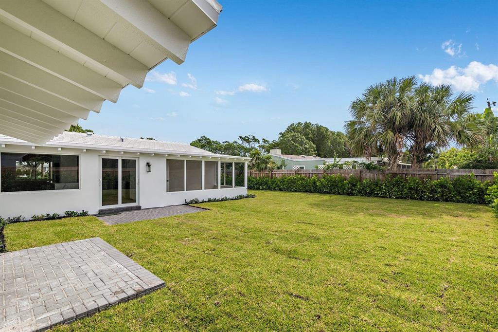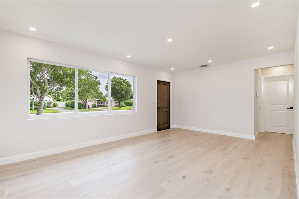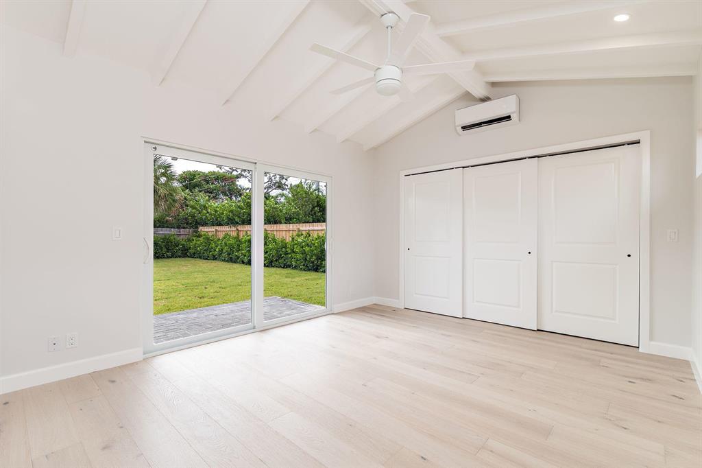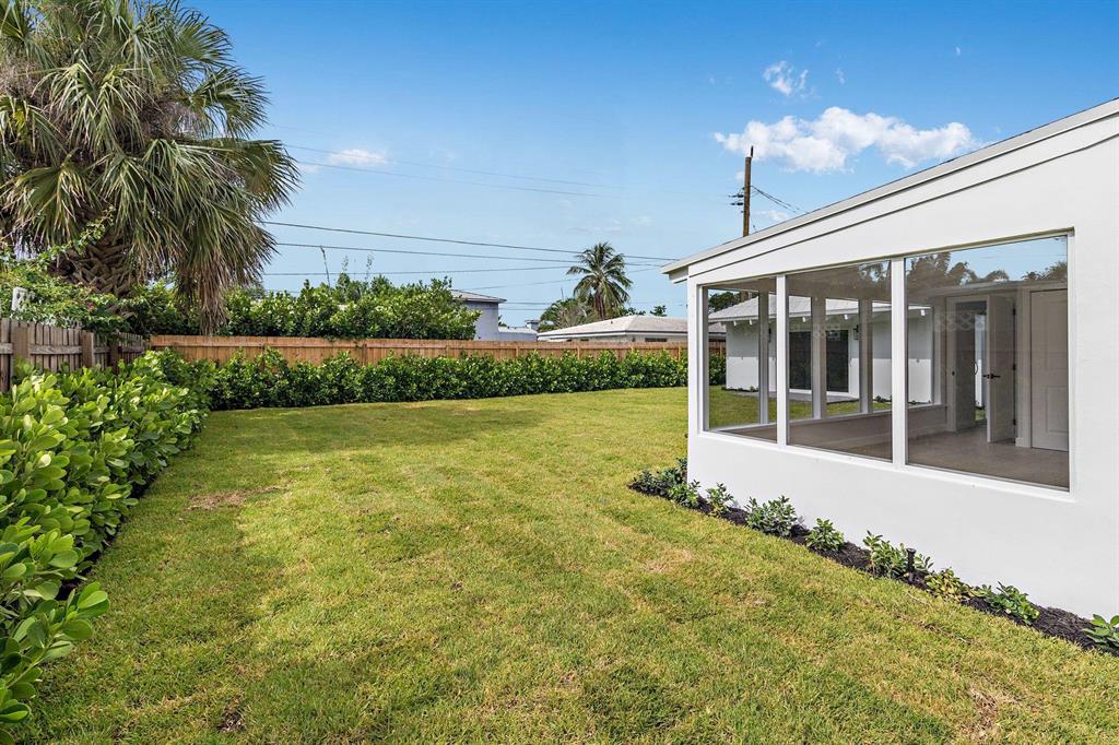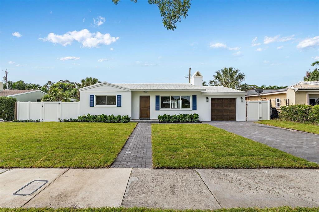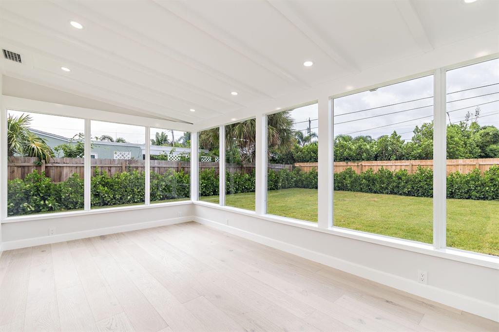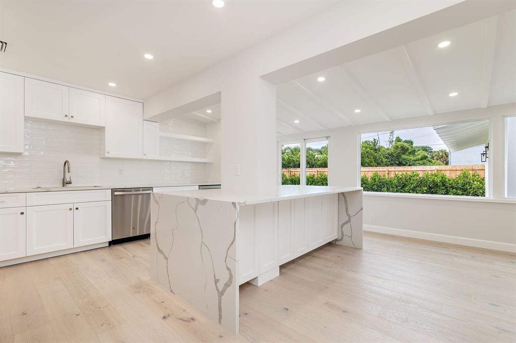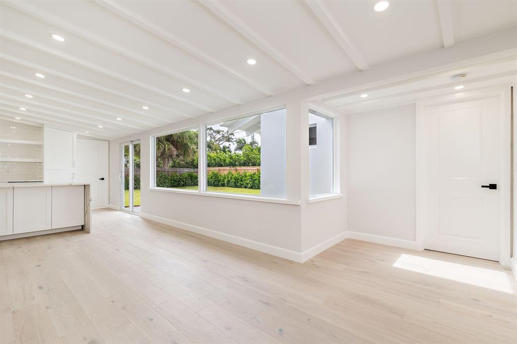 Freshly renovated featuring wide plank French oak floors throughout and dramatic beamed ceilings, this 3 bedroom home plus den is move-in ready. Wrapped in windows this home offers light filled spaces and a stream lined design esthetic. The kitchen is a dream, boasting quartz counter tops, custom cabinetry, stainless steel appliances and a wine refrigerator. This concrete block home has a brand new 2021 roof, full hurricane impact windows and doors and a one car garage. Additional features include new HVAC, marble bathrooms, custom closet systems and expansive green space with room for a generous pool. East of S. Olive Ave