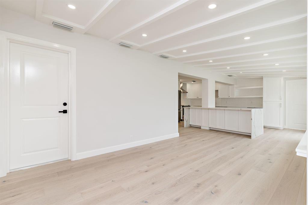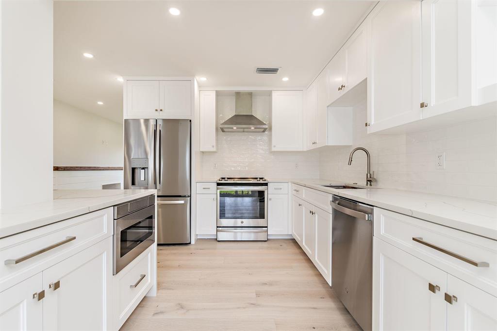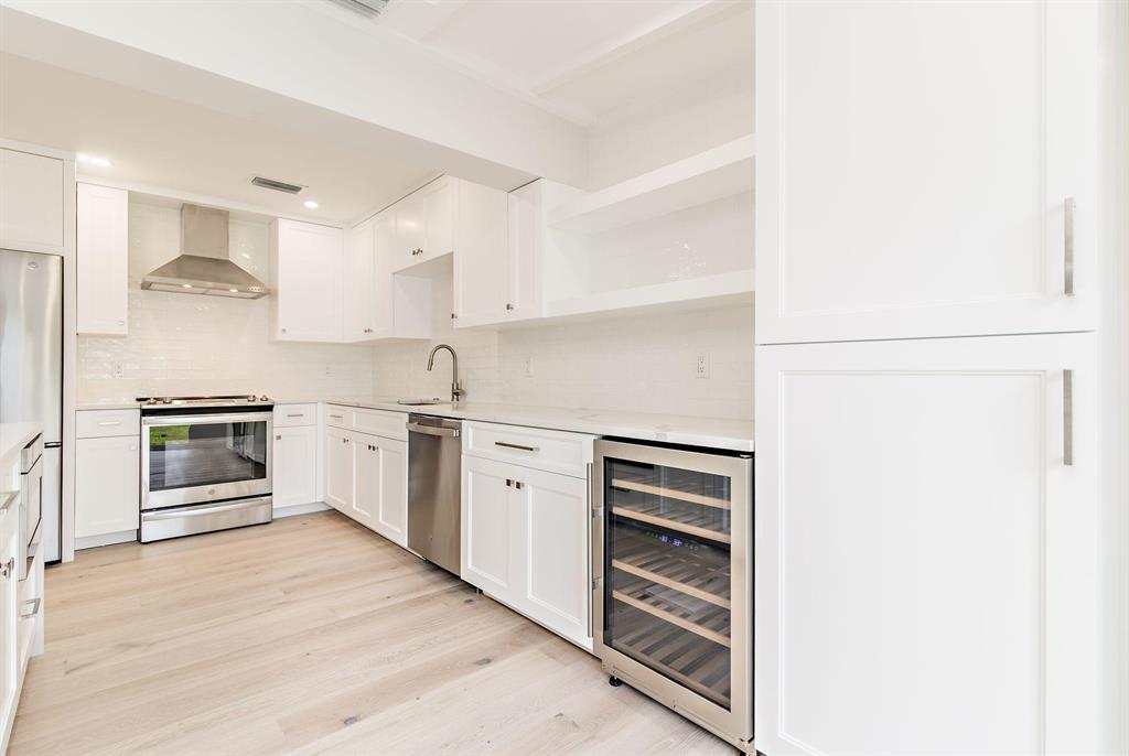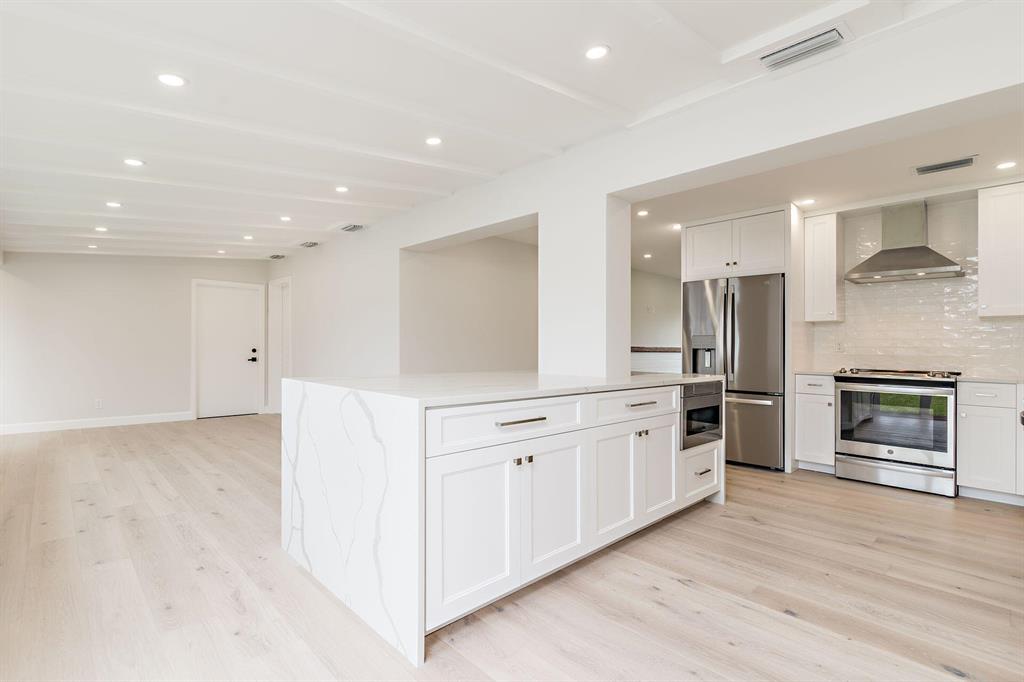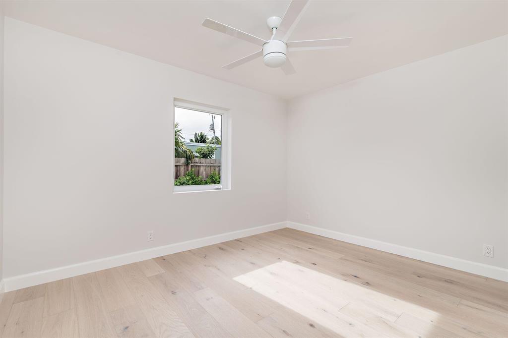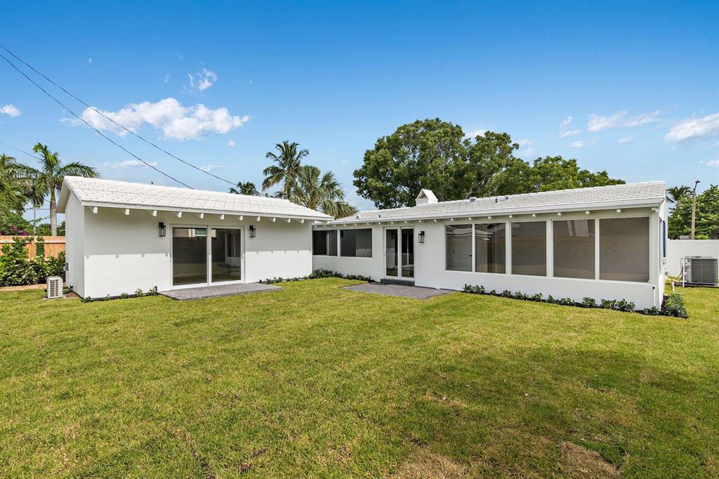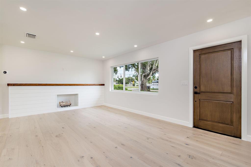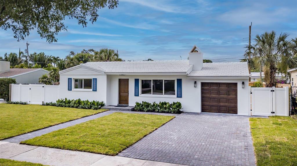 Freshly renovated featuring wide plank French oak floors throughout and dramatic beamed ceilings, this 3 bedroom home plus den is move-in ready. Wrapped in windows this home offers light filled spaces and a stream lined design esthetic. The kitchen is a dream, boasting quartz counter tops, custom cabinetry, stainless steel appliances and a wine refrigerator. This concrete block home has a brand new 2021 roof, full hurricane impact windows and doors and a one car garage. Additional features include new HVAC, marble bathrooms, custom closet systems and expansive green space with room for a generous pool. East of S. Olive Ave