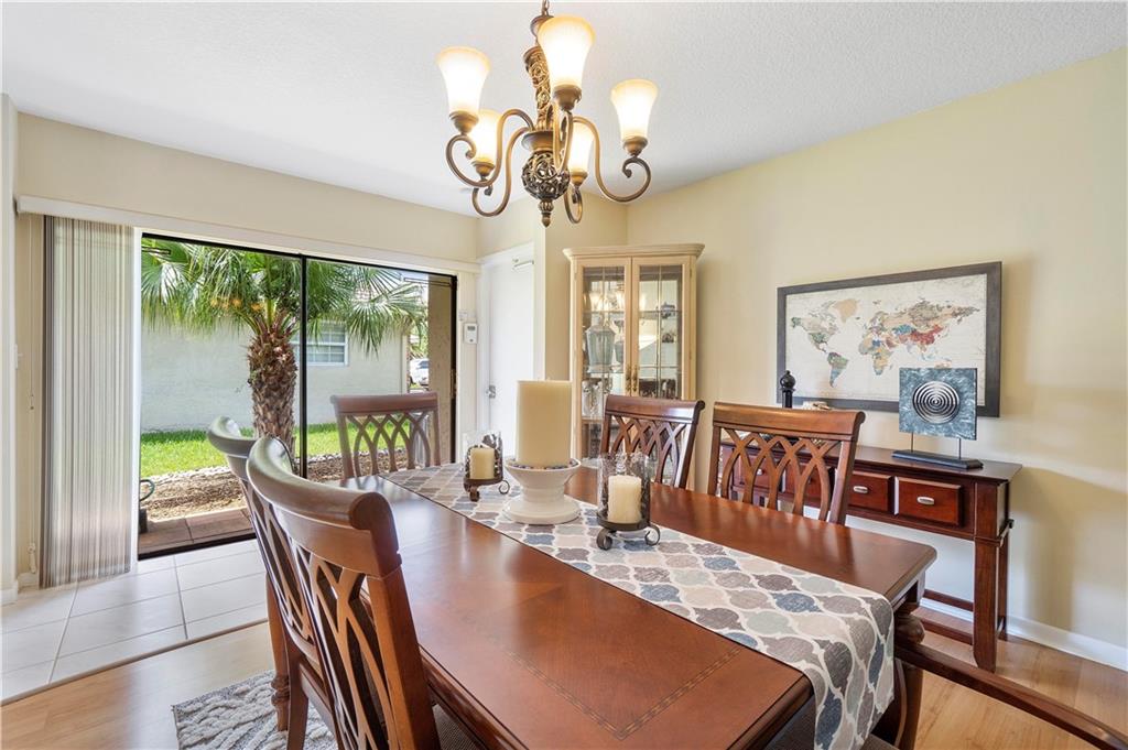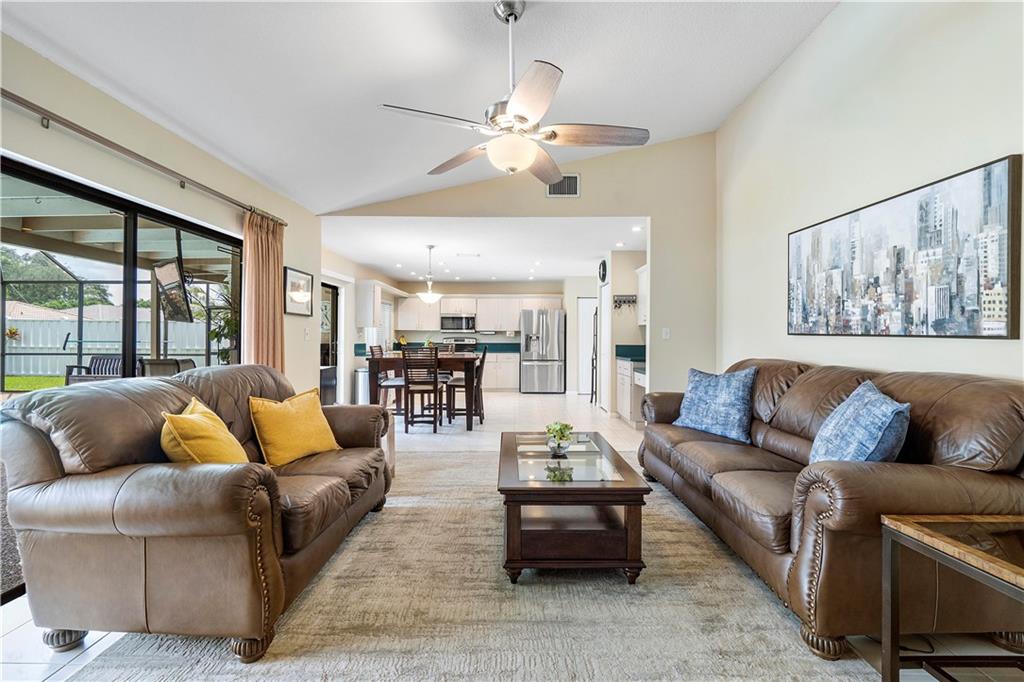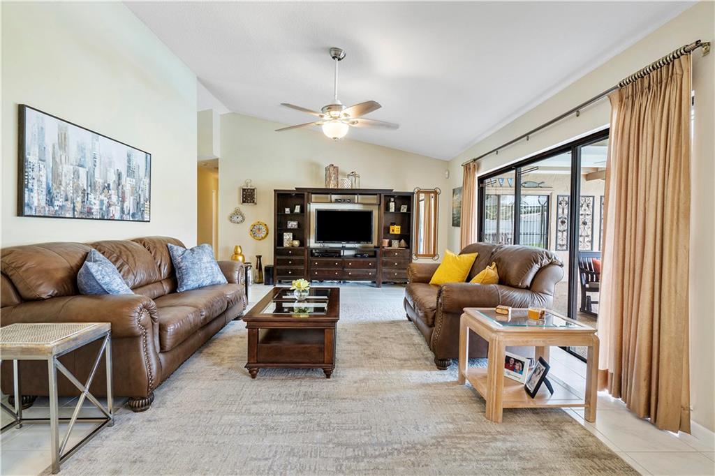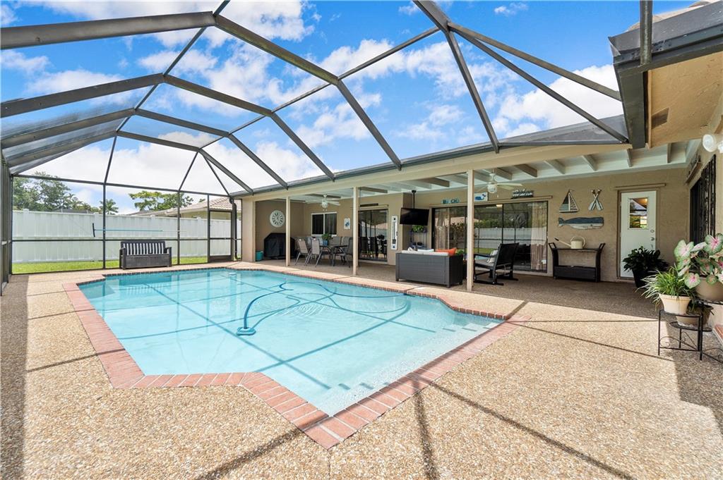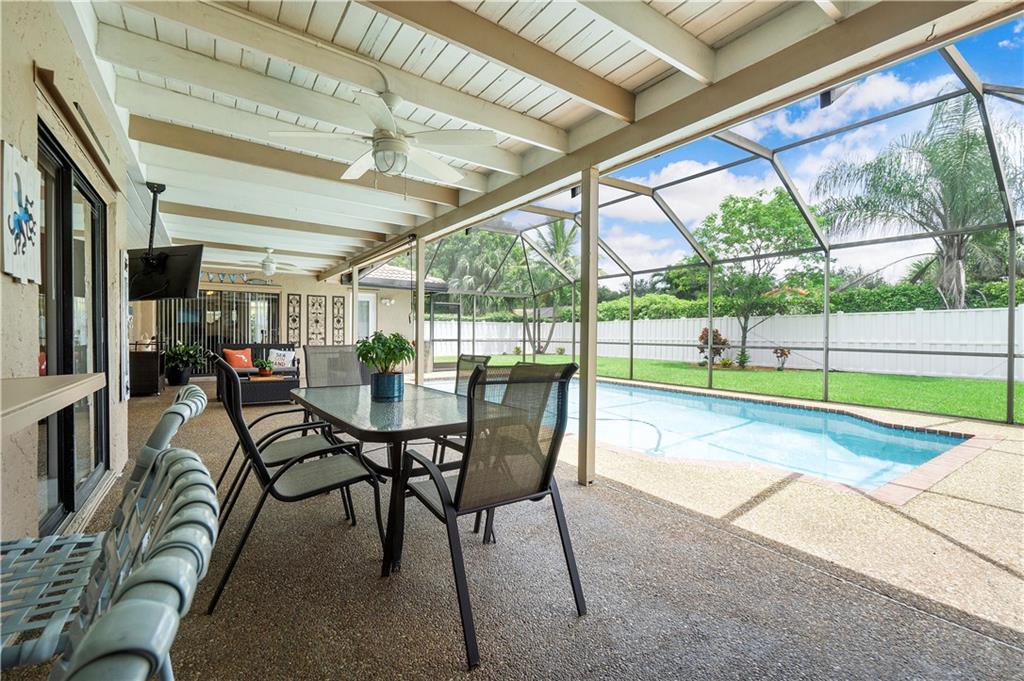 **NO HOMEOWNER ASSOCIATION** Charming home complete with impact windows/doors & hurricane panels for sliders & one cabana bath window. Sit in your kitchen, family room or Lanai, while sipping your favorite libation & gaze at your inviting screened-in pool with private (PVC shadow box) fenced-in backyard. Very large eat-in kitchen with new stainless steel appliances and opened to the family room. Formal dining and living room. Laminate wood floors in 3 bedrooms, dining room & living room. Wood look tile in one bedroom. Tile in kitchen/family room & hallways. Stunning remodeled grand bath w/cabana door. Hurricane proof garage door w/new motor. Gutters all around. Dual AC units. Samsung high efficiency Washer & Dryer. Ring Doorbell & new paver driveway! Neighborhood park around the corner!