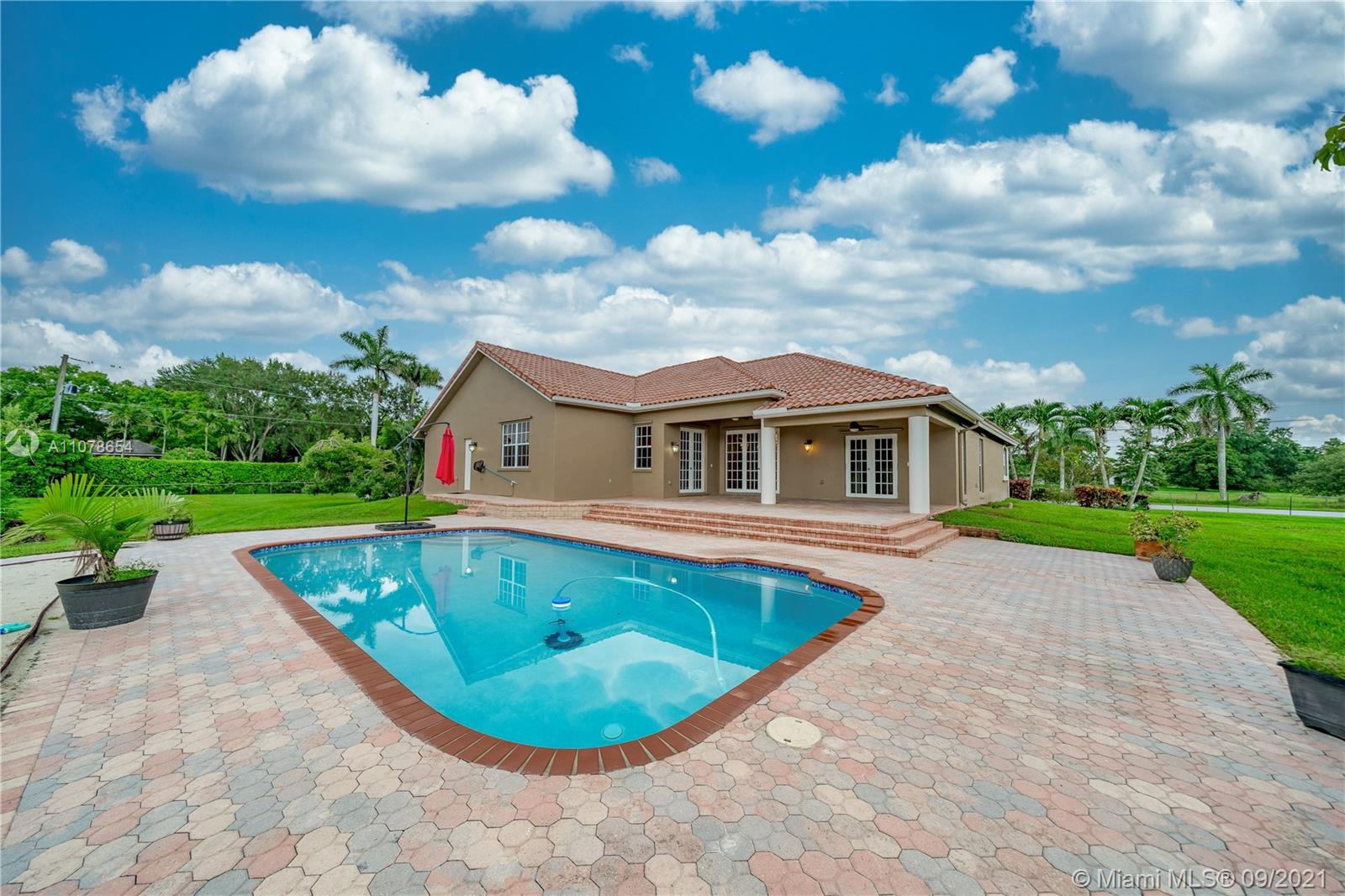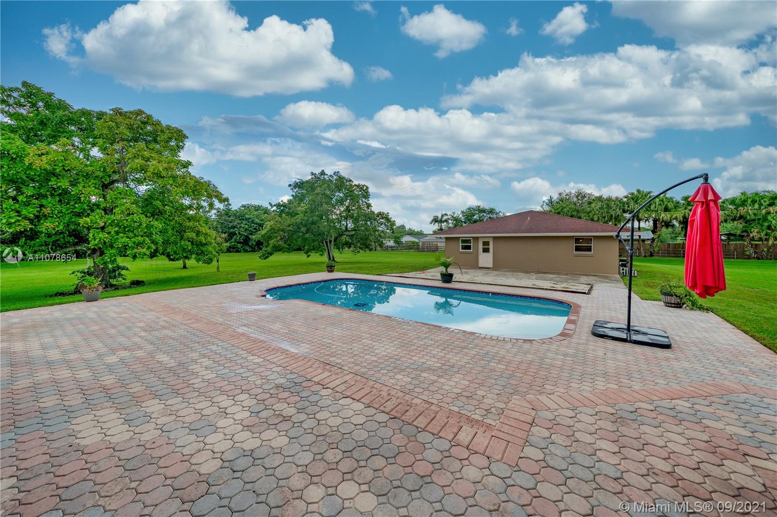 Amazing one-story pool home with a separate guest house! Rare find in sought-after Southwest Ranches, close to Miami/Ft Lauderdale. It offers 5 bedrooms, 3.5 baths, 3063 sf. A separate Guest House with 1155 sf features 2 bedrooms, 1 bath, eat-in kitchen, living room. All this nestled in the equestrian neighborhood of Sunshine Ranches. Custom-built in 2006 on 2.2 acres. This elegant estate includes an expansive floor plan, wonderful natural light, granite countertops, wood cabinets, stainless steel appliances. Primary bedroom suite with walk-in closet, dual vanities, jetted bathtub & separate shower. Fully fenced, tropical fruit trees, 2-car garage and plenty of parking space. Excellent schools. Call in now while you can, don't miss out!