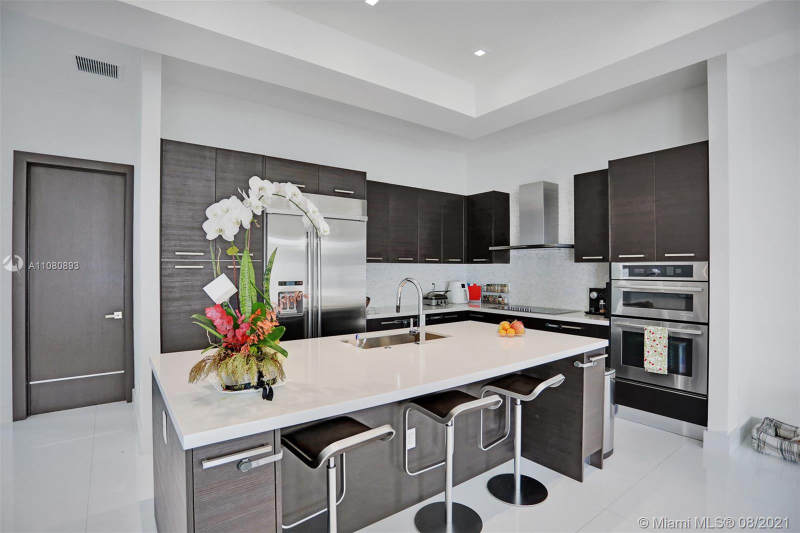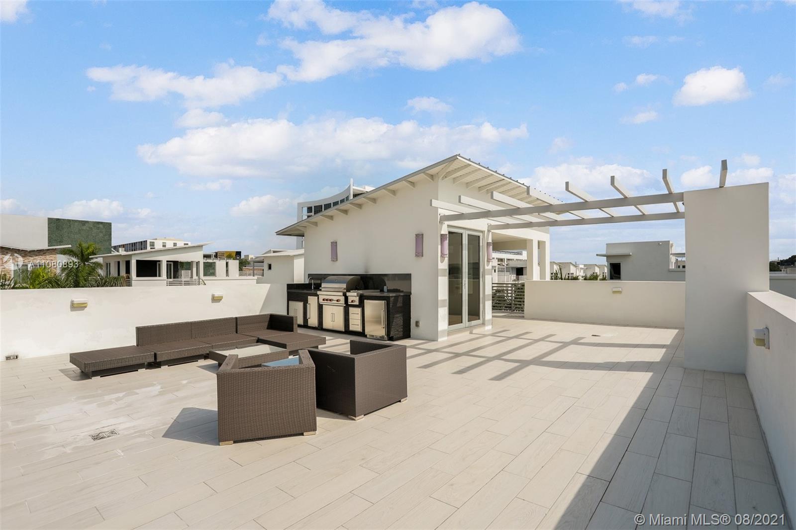 Modern corner home in the heart of Doral. 4 bedrooms - 5 1/2 bathrooms. Great finishes. Porcelain floors throughout the house. Beautiful glass wine cellar for the wine lover. One en-suite bedroom downstairs, great for guest or in-laws. Den area for those working from home! A completely redone/remodeled Rooftop with an outdoor kitchen, jacuzzi, full bathroom and spectacular city views. Nice ample backyard. Walking distance to supermarkets, restaurants and shops. Close to schools and highways. Guard gated community. Easy to show with a 24hrs notice Pls. Perfect home to Live, Work and Play!