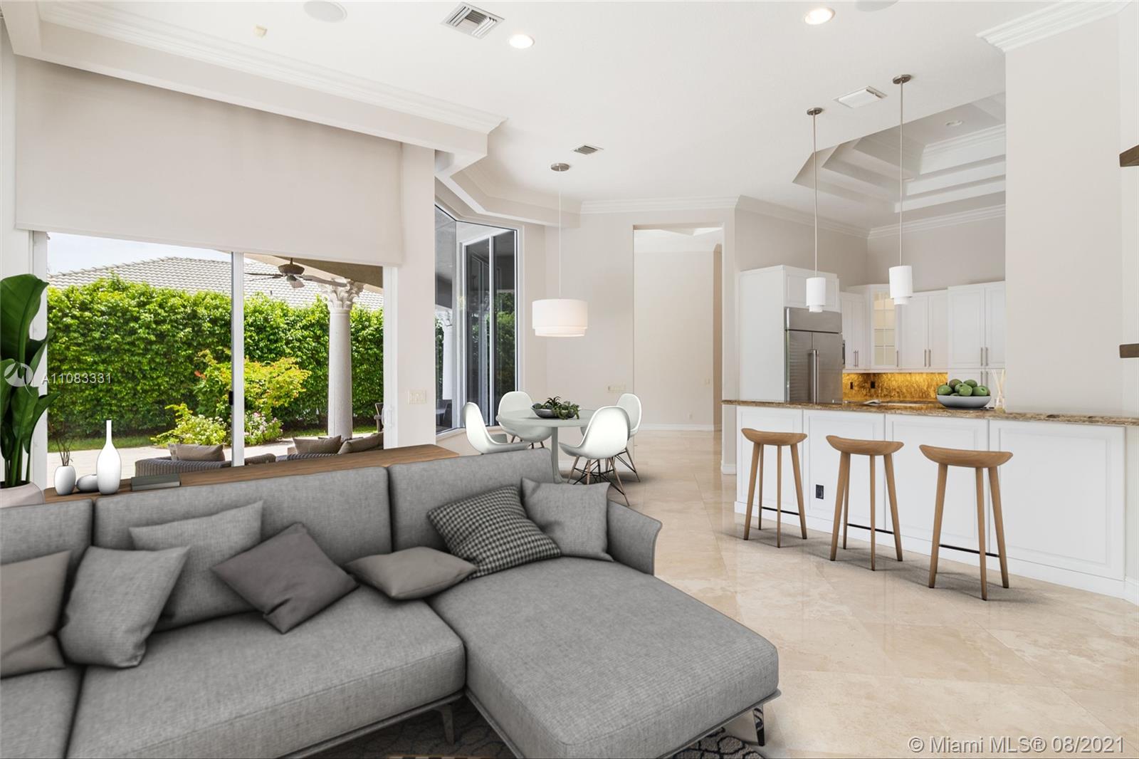 Stunning rarely available unique custom home in the lush and secure gated community of Hawk's Landing . A side garage & large drive way lead into the touret entrance. The home just opens up into bright living spaces with 14' tray ceilings , crema marfils marble floors & many beautiful architectural details. The kitchen is accessible from dining and family room areas with a bar counter, a cooking island and ample storage. Tons of windows and doors showcase the tropical landscape and heated salt water pool area so you can live the Florida lifestyle to the fullest. Large bedrooms with solid wood doors , built out closets and wood style porcelain flooring. The Hawks' Landing Club house with 7 tennis courts , pool, gym and social & kids program adds to the beauty of living in Hawk's Landing.