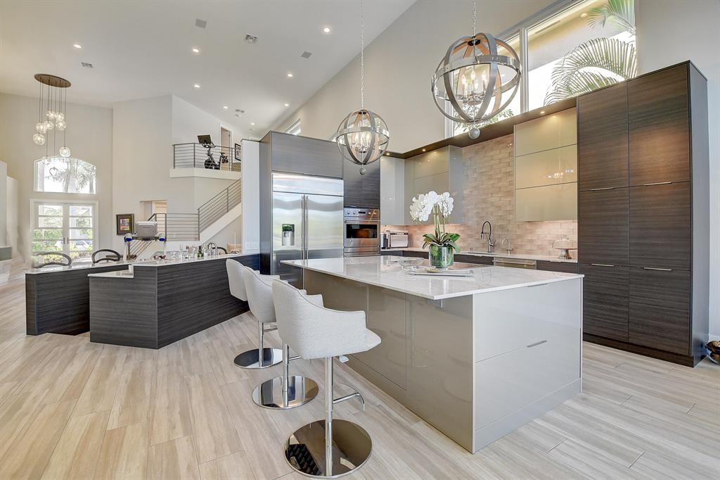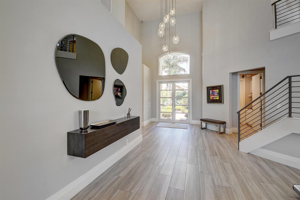 Tranquil lake vistas & upgraded to the nines, this 2-story home of 4 bedrooms plus an office & 4 baths is filled with sunlight. Features include contemporary front doors; volume ceilings with LED lighting; 9'' X 48''wood grain porcelain tile & neutral carpeting; flat wall & ceiling finish; a tastefully designed gourmet kitchen with taupe high-gloss & tigerwood cabinetry, stainless steel appliances, quartzite counters, glass tile backsplash & elegant pendants; & a practically designed built-in office. The Living Room offers an inviting wet bar with ice maker & freezer drawers. The Master Suite offers beautiful lake views, custom closets, ceiling fan & shades & a spacious Master Bath with 3 vanities, free-standing aromatherapy tub, large shower with a bench & multiple heads.