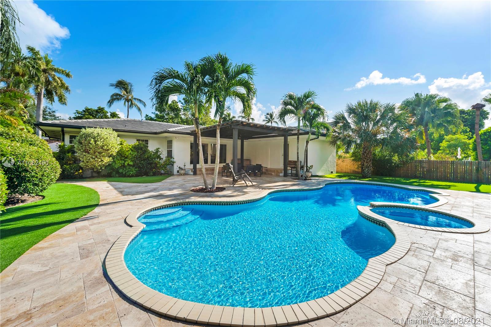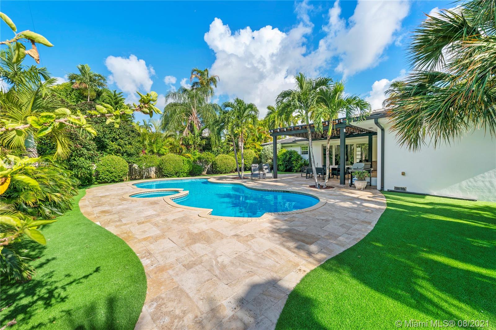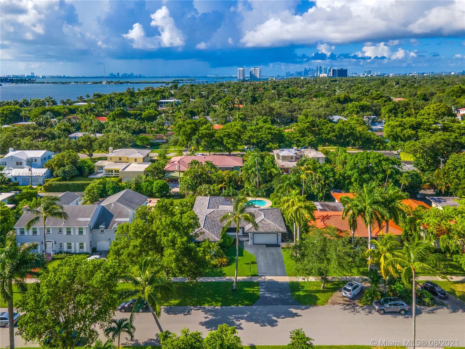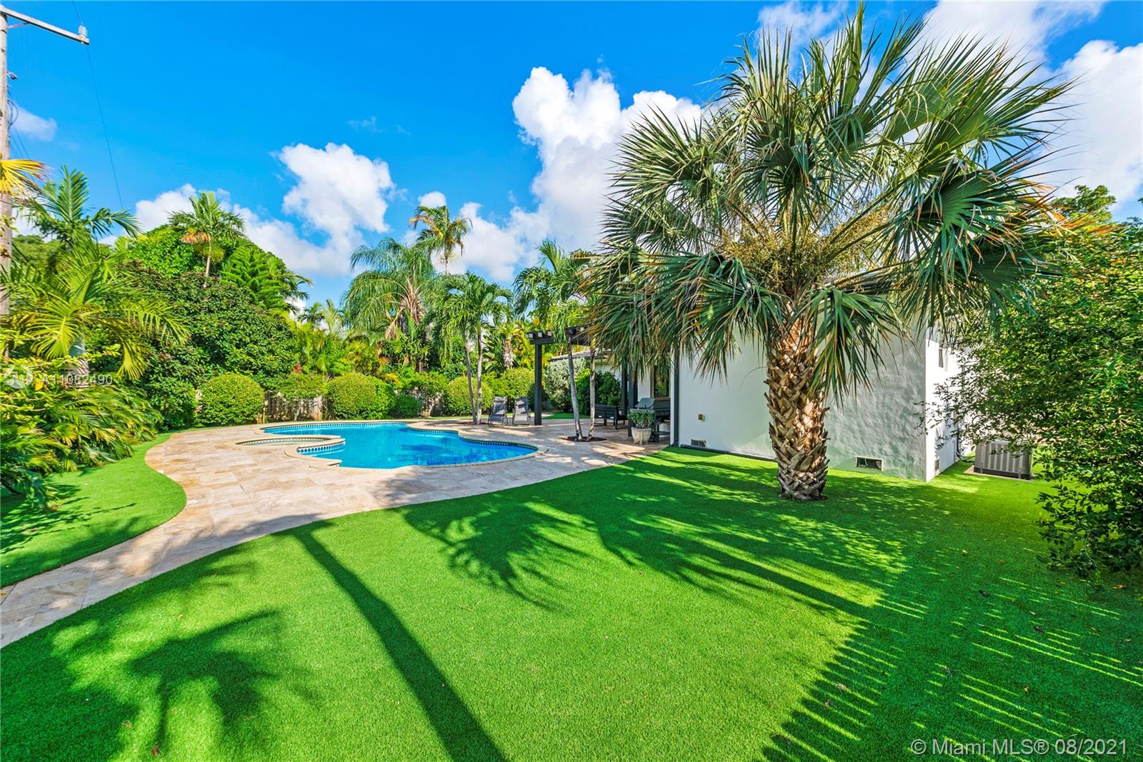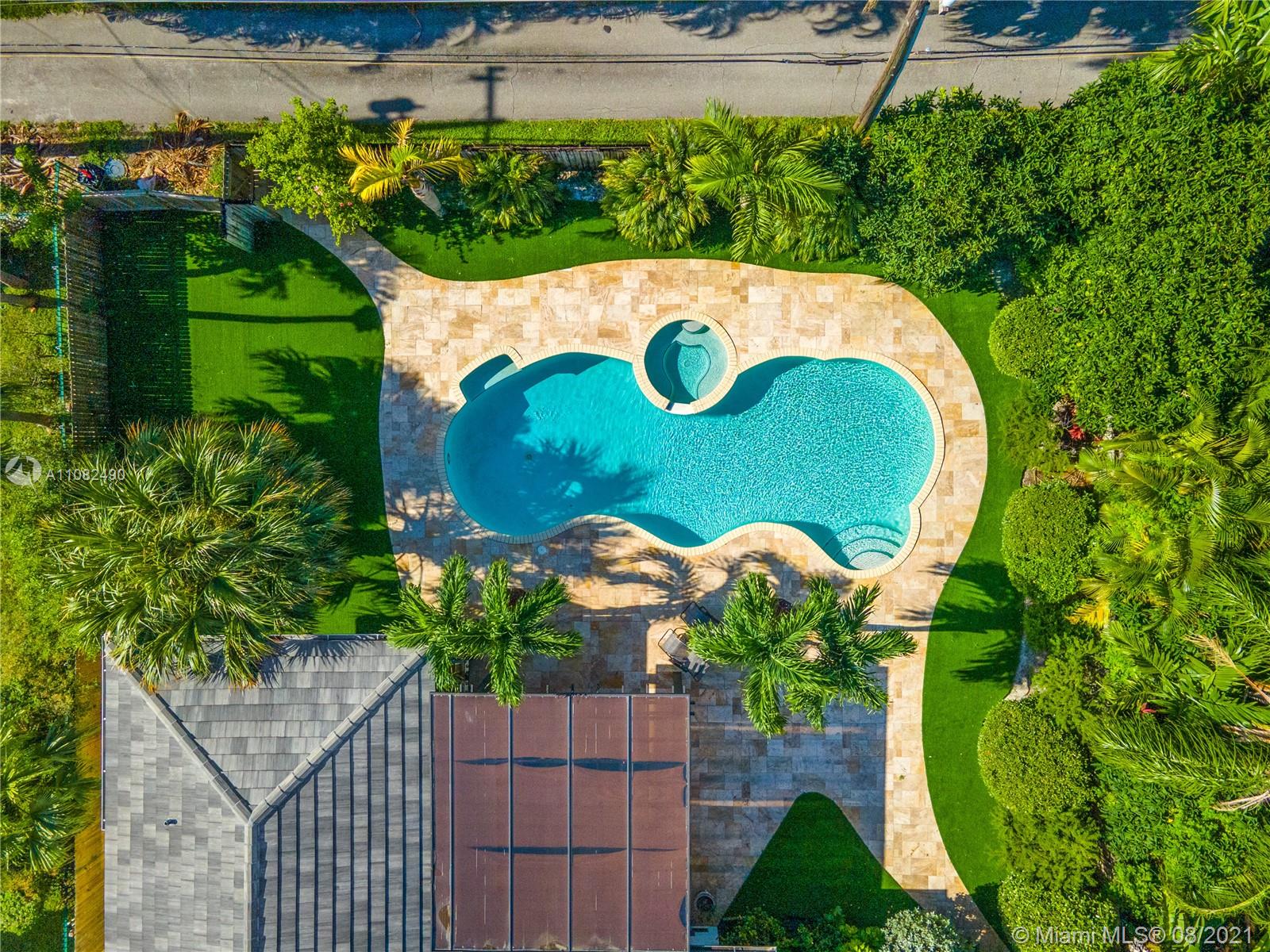 Newly renovated and redesigned 3 bedroom, 3.5 bath home on tree-lined 96th Street in Miami Shores. Located just the six homes away from glistening Biscayne Bay, this home sits on an oversized lot with a magnificent backyard with heated swimming pool, hot tub, brand new pergola and freshly installed Astro Turf throughout the generous sized backyard. Some of the many countless home upgrades include: new roof, two new AC units, brand new Italian porcelain floors throughout, new open kitchen with bar top island, custom countertops, farmers sink, and new smart appliances including wine cooler. The main living area showcase a new custom media wall with surround sound, fireplace and electric shades. Miami Shores is a wonderful community, centrally located, close to everything Miami has to offer!