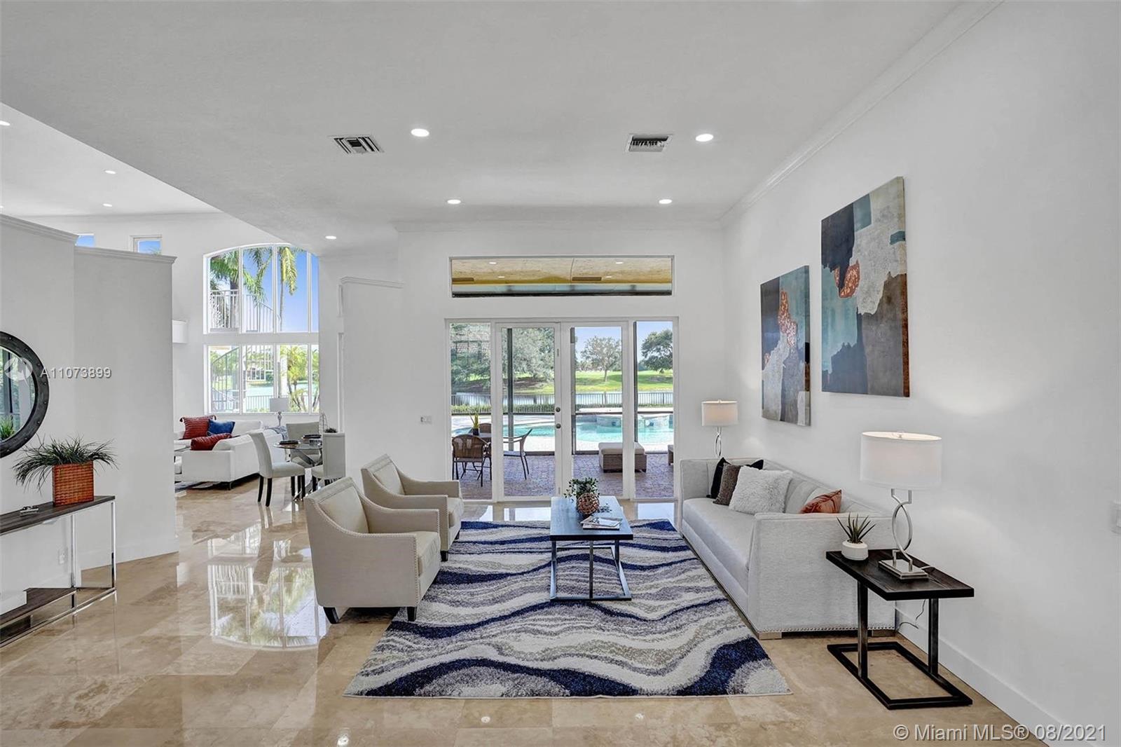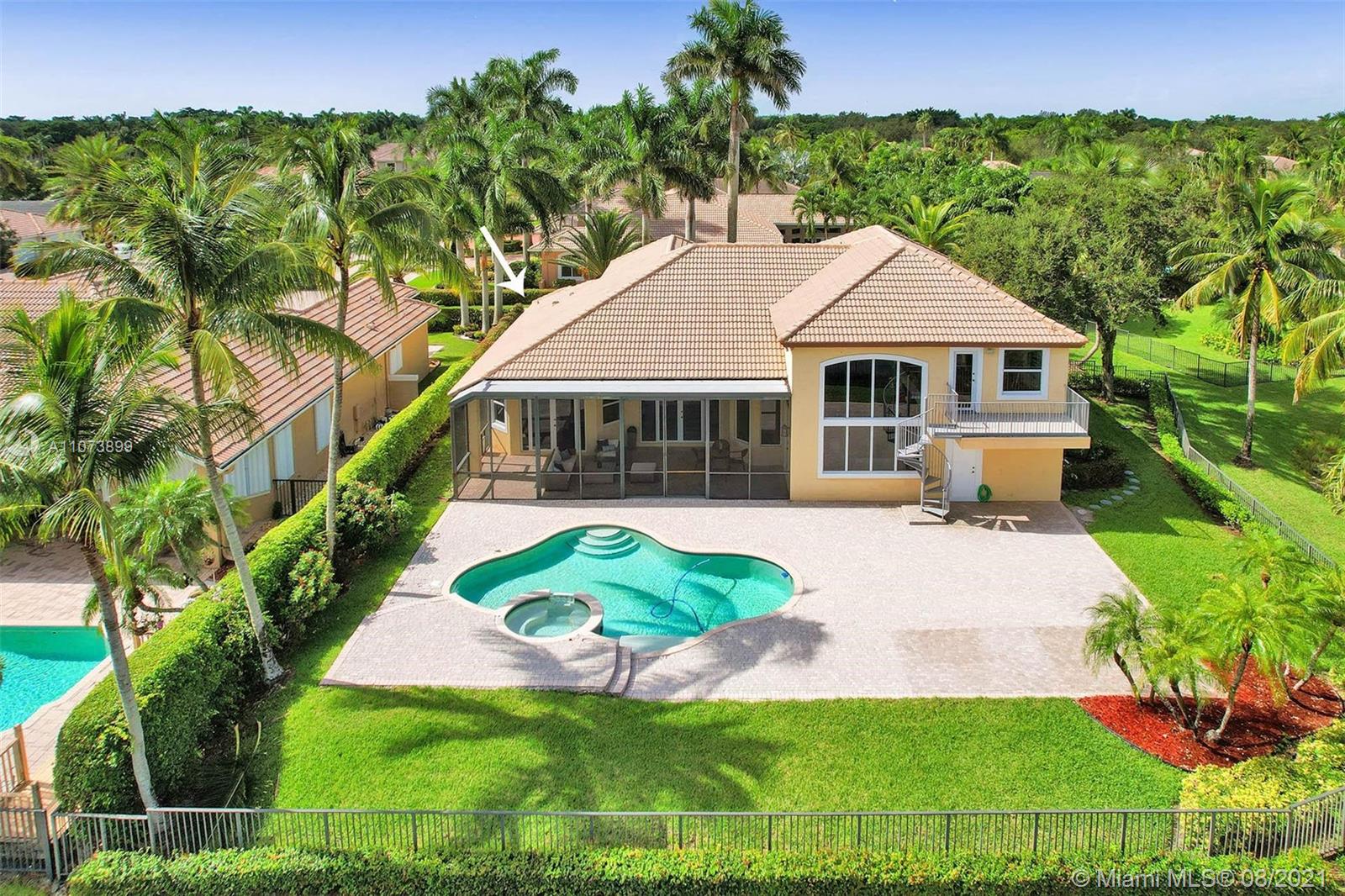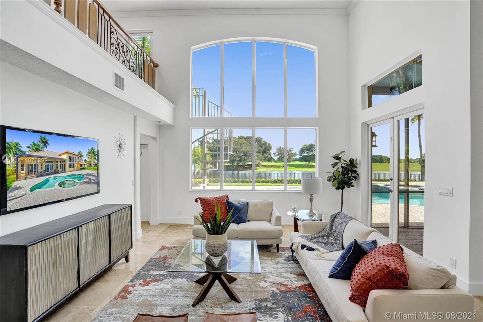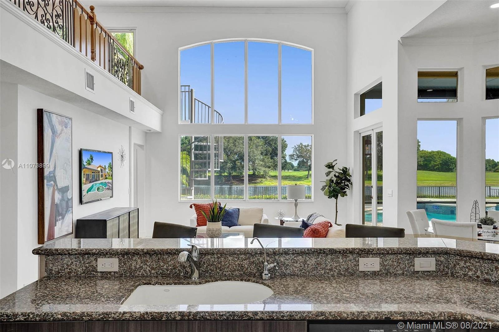 Talk about a VIEW. Incredible setback with oversized paver driveway located in Heron Bay at Long Cove. Privacy galore in this spacious 2 story home featuring travertine marble floors, volume ceiling, windows on water, and extensive crown molding. Brand New modern kitchen with stainless steel appliances and quartz countertops 2021. Owners suite first level with french doors to screened patio, pool, and fully fenced yard with view of golf and water. Newly renovated master bath. Secondary bedrooms 2nd level plus loft and balcony overlooking water and pool.