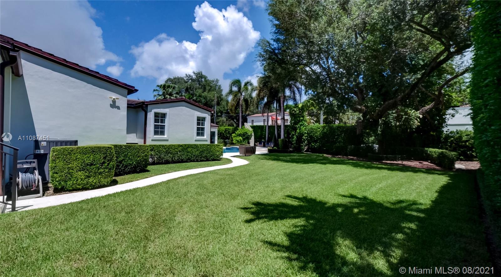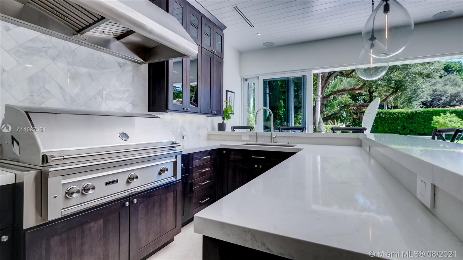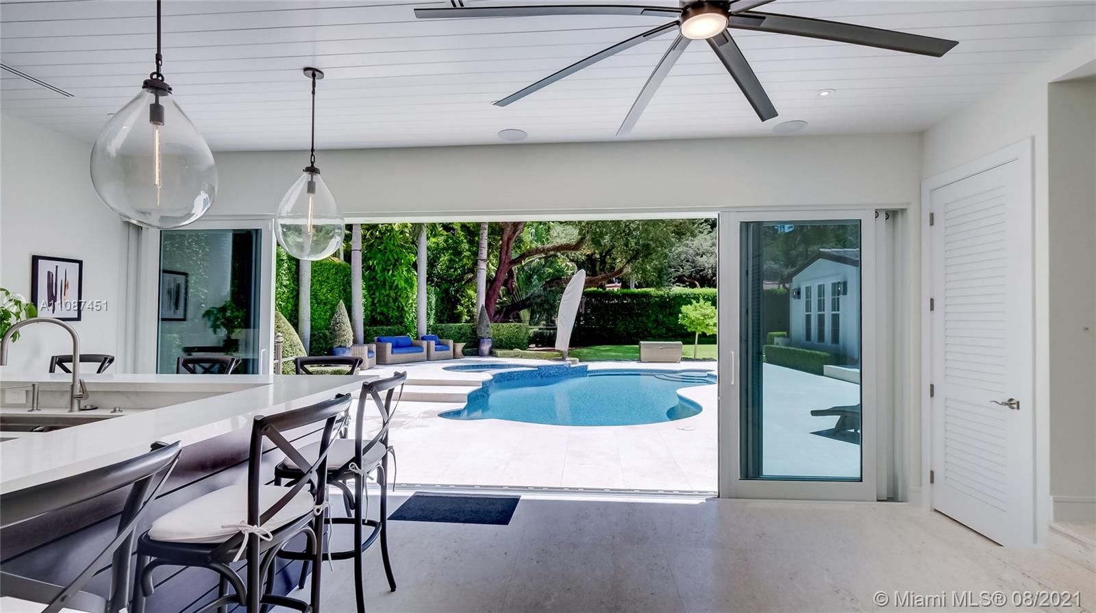 Unique opportunity in the heart of coveted Coral Gable’s Golden Triangle. 1930's renovated 5 Br 4 Ba home on quiet tree-lined 16,500 sqft lot. Property includes newly-built indoor/outdoor entertainment room w/ impact glass sliding doors, full bar & lynx grill + automatic roll down screen. State-of-the-art kitchen w/ subzero/WOLF, Miele appliances, oversized kitchen island w/ galley workstation sink and custom-integrated table, ideal for entertaining. Exquisite shell-stone and oak hardwood flooring. Large great room w/ floor-to-ceiling windows overlooking pool and yard area, offers plenty of natural sunlight. Lush landscaping w/ custom lighting. Extra features: Automatic standby generator w/ 500-gallon underground propane tank, 8 security cameras, Swat repellent integrated system & more!