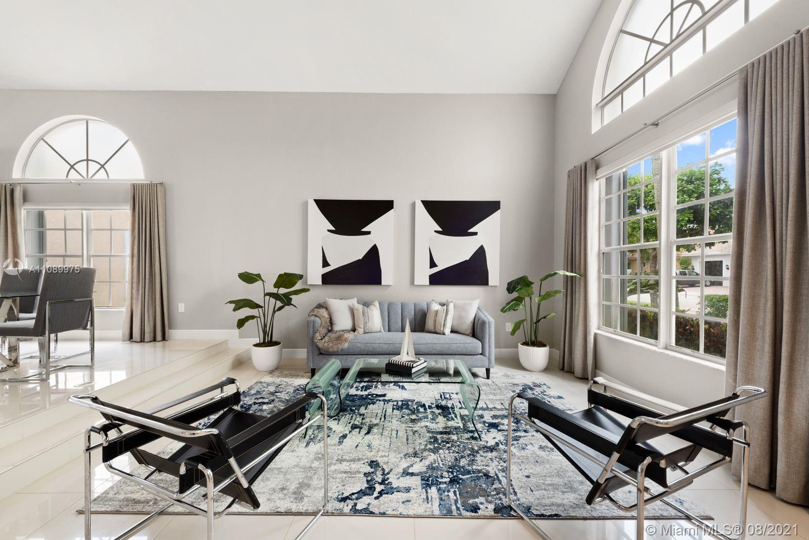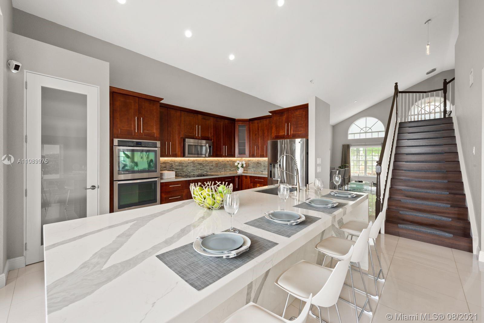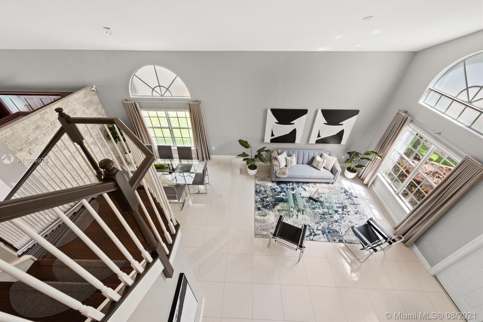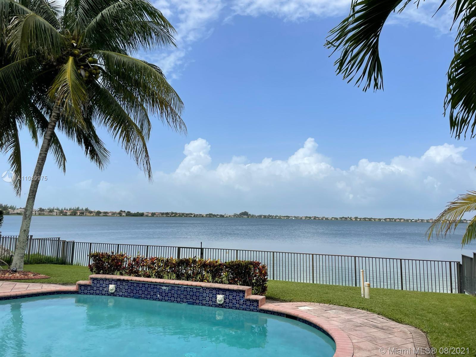 Absolutely stunning wide lake views from this desirable Sunset Falls pool home. Enter into the formal living room with breathtaking high ceilings allowing in abundant natural light. Elevated dining area leading into the beautifully remodeled kitchen with an oversized island & quartz countertops. Enjoy endless pool & lake views from the large family room that leads out to the patio where you can enjoy one of a kind sunsets on one of the largest lakes in Miramar. The master has a sitting area, bathroom with huge walk in shower & custom closets. Huge master bedroom balcony perfect for morning coffee with a water view! Jack & Jill upstairs bedrooms & a bedroom with bathroom & half bath downstairs make for a perfect layout. Gated community with a pool, exercise room, tennis, basketball & parks