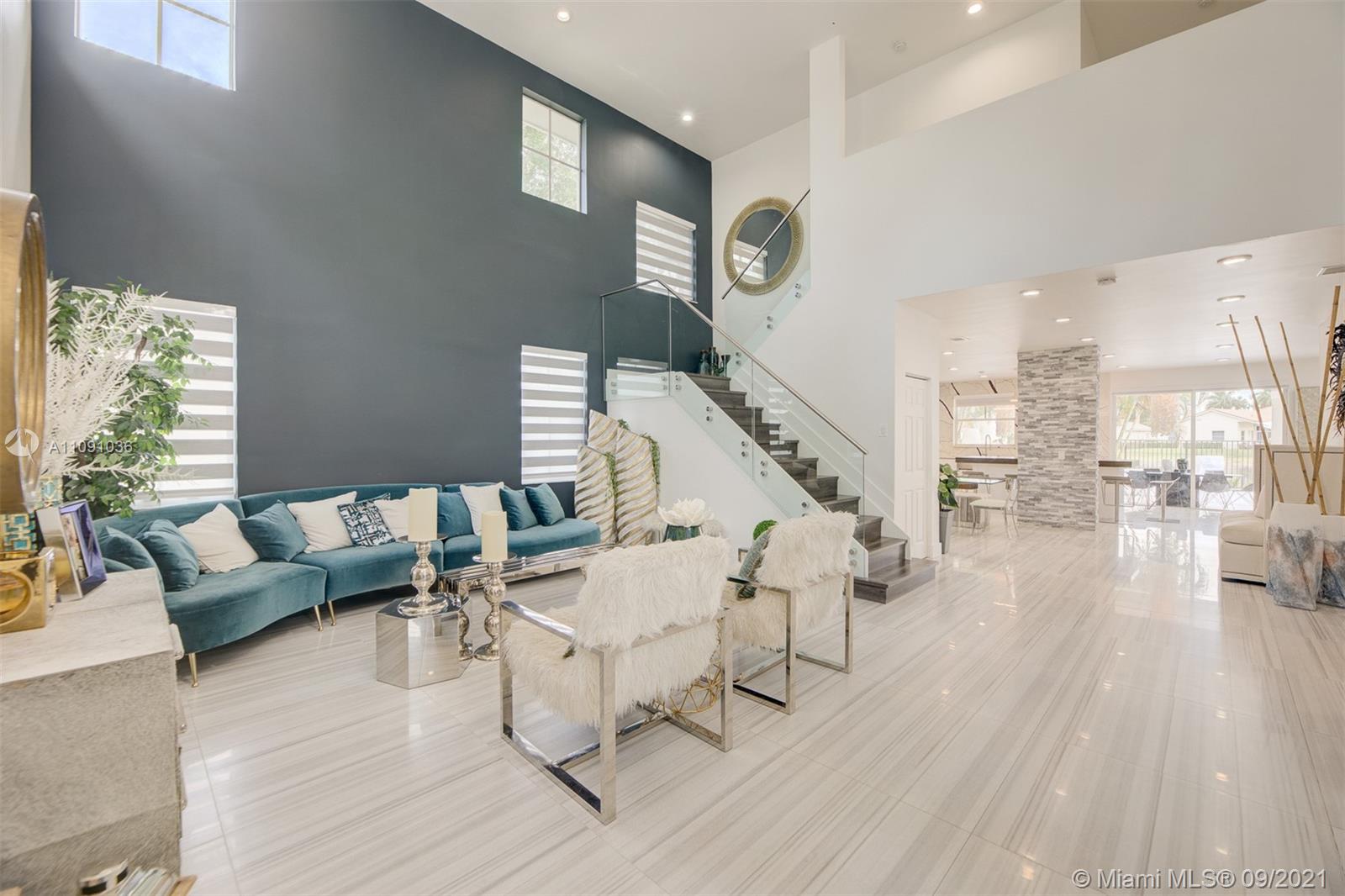 Spectacular 2-Story Remodeled Modern/Contemporary residence featuring 5 Bedrooms, 3 Bathrooms & a 3 Car Garage. Located in the exclusive gated community of Weston Hills. As you enter this masterpiece, you will see the high ceilings throughout the house. It boasts a bright Open floor concept. The Spacious Kitchen has State-of-the-Art appliances GAGGENAU/European Style Cabinets, a spacious island perfect for a big family. Upstairs, the Spacious Master Bedroom is 19x26 with a sitting area/office with plenty of light. Bedroom downstairs with a full bathroom. Ample outdoor space perfect for entertaining with a large pool overlooking a wide lake suited to watch the perfect sunset. With 3,943 sq ft built in 1998.The Family Room is 21x28.