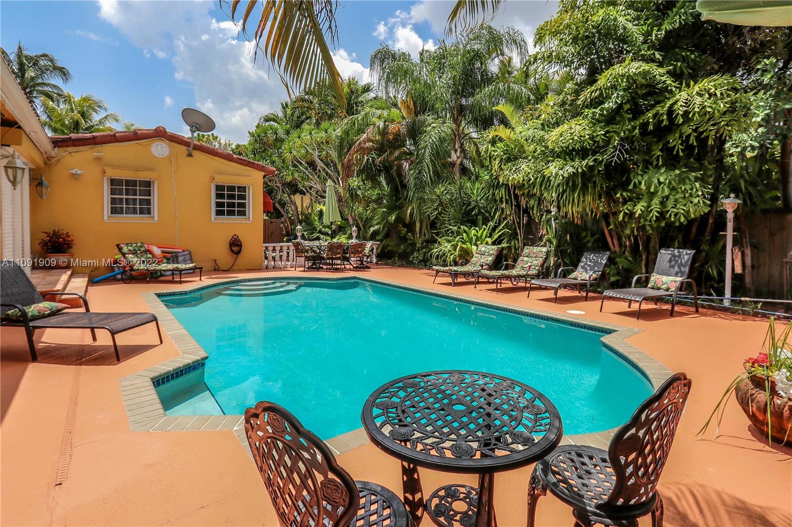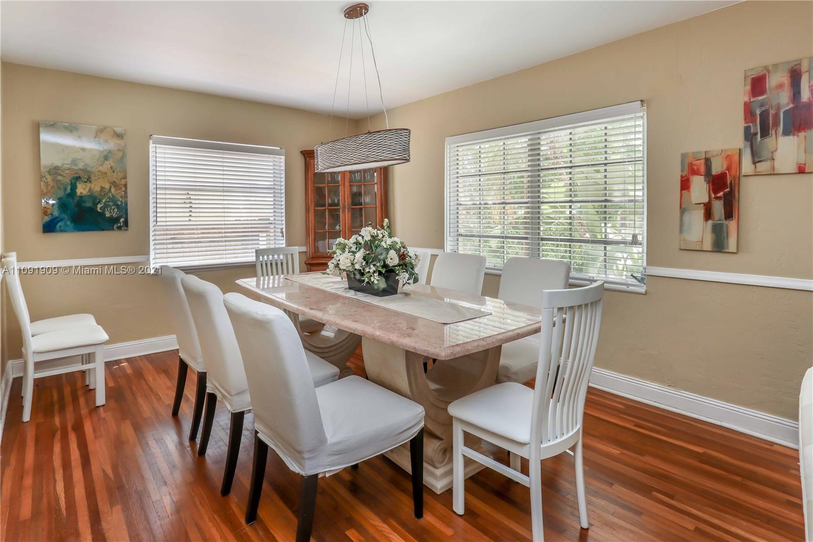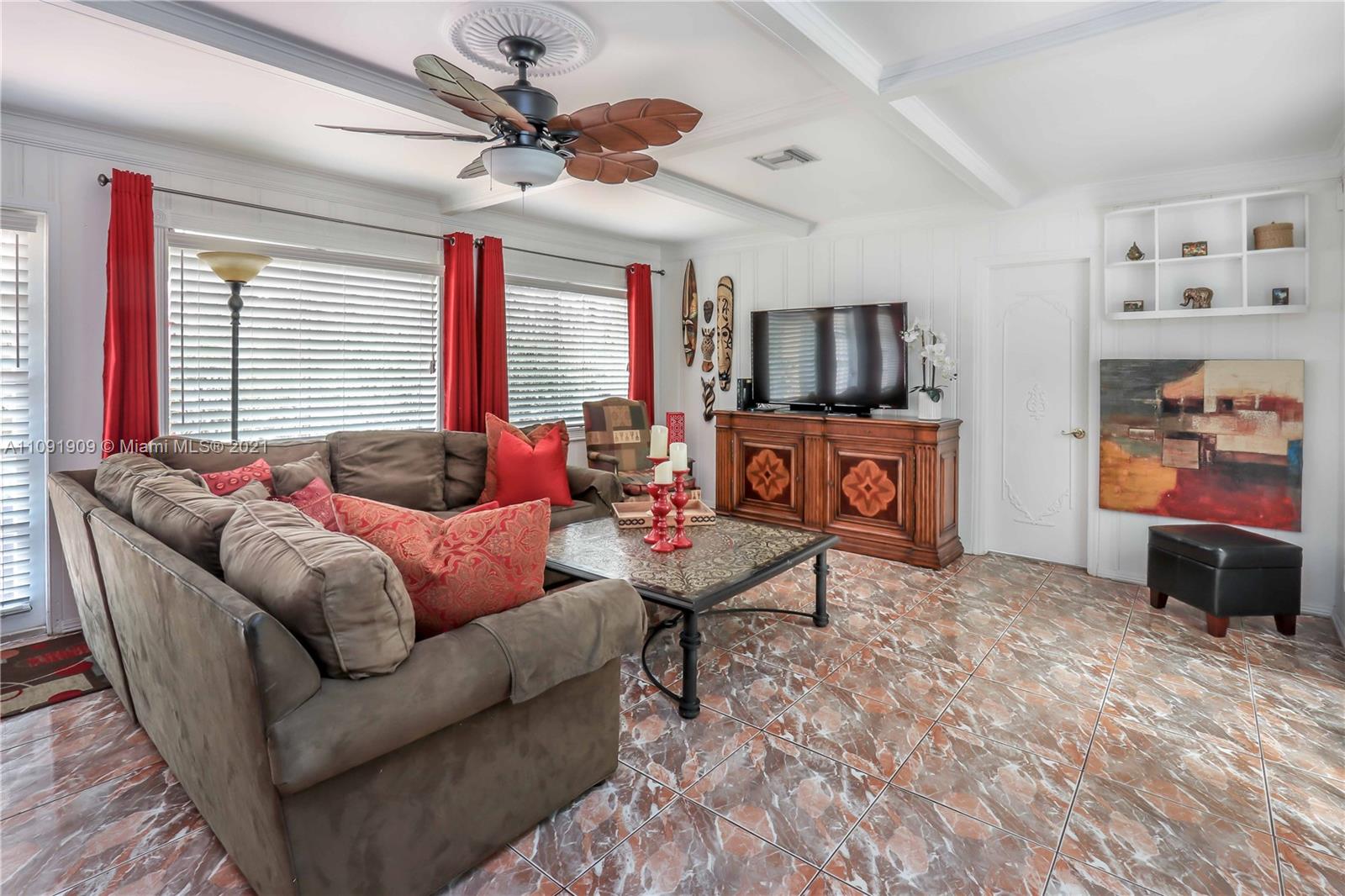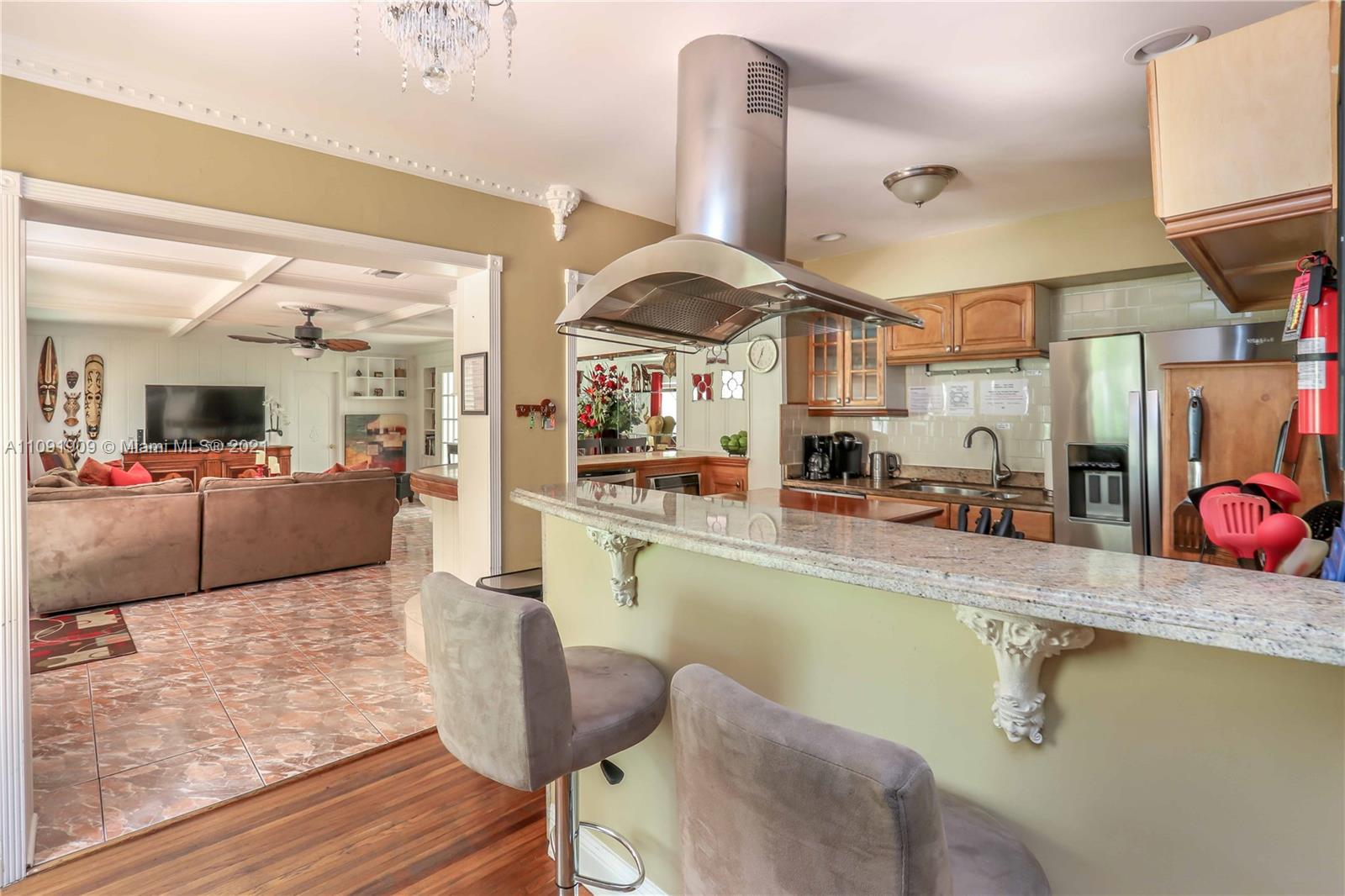 MODERN 4BED / 4BATH FAMILY HOME WITH RESORT STYLE POOL AREA, 5 MINUTES TO BEACH, DOWNTOWN, GULFSTREAM PARK OR AVENTURA! THIS HOME FEATURES FORMAL LIVING ROOM WITH EXPOSED WOOD BEAMS, FRENCH DOORS AND LOTS OF NATURAL LIGHT~ POLISHED HARD WOOD FLOORS IN DINING AREA~ LARGE FAMILY ROOM WITH MARBLE FLOORS AND LARGE WINDOWS OPENING TO PATIO WITH SITTING AREA FOR OUTDOOR DINING EXPERIENCE~ LARGE KITCHEN WITH 2 GRANITE COUNTER AREAS, STAINLESS STEEL APPLIANCES AND WINE COOLER WITH OPENING TO FAMILY ROOM AND BAR EATING AREA~ MASTER SUITE FEATURES LARGE CLOSETS AND OPENS TO BEAUTIFUL HEATED POOL/PATIO AREA. LARGE AND BRIGHT MASTER BATH WITH ROMAN TUB AND SEPARATE SHOWER. FENCED BACKYARD WITH TROPICAL LANDSCAPE SURROUNDING POOL AND PATIO.