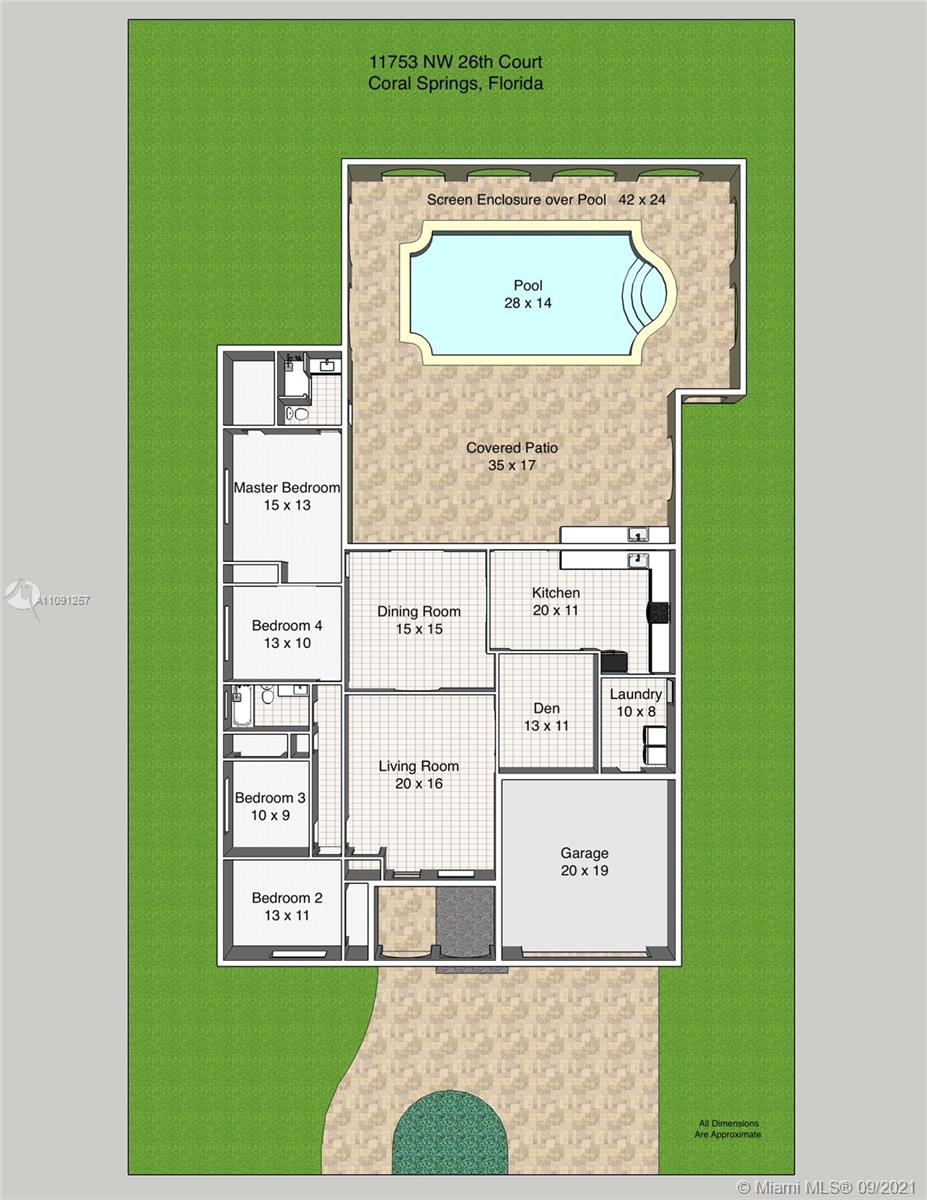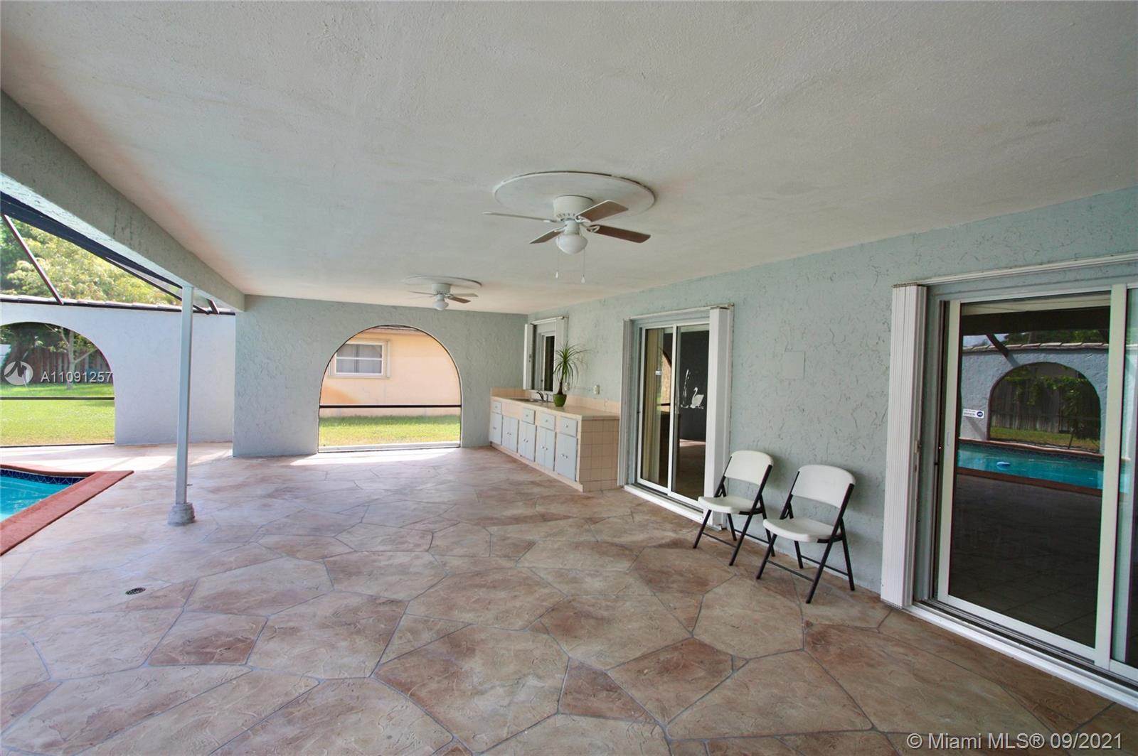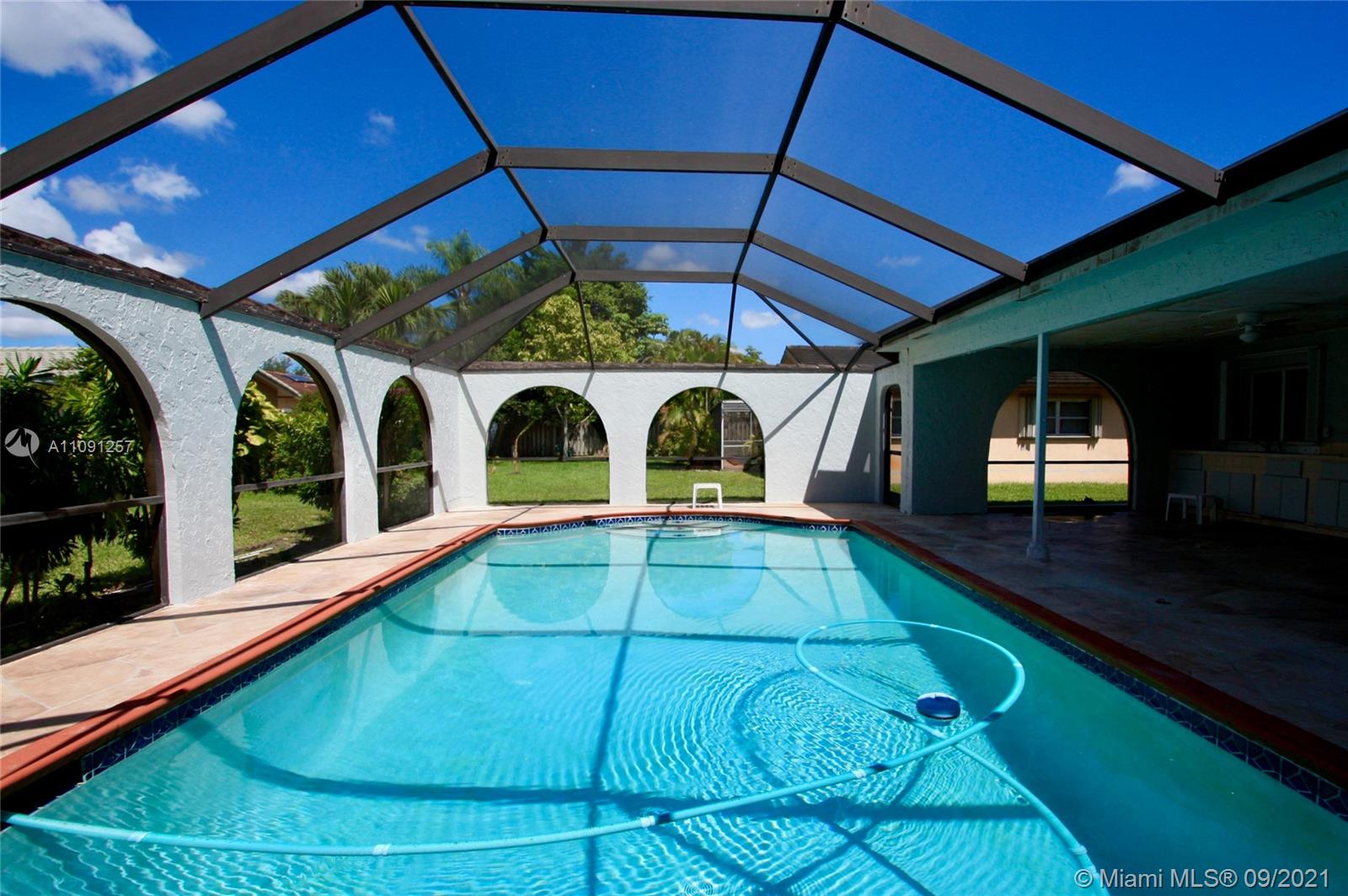 Wonderful 4-bedroom pool home in the heart of Coral Springs. So much to love about this home, from the layout and spacious rooms to the entertaining possibilities. Large kitchen/den and dining room open up to huge covered patio and screened-in pool area. Roof screen supported by concrete wall with arched screened openings. Large Master bedroom with walk-in closet and cabana bath leading to the pool area. Another room can be used as den/office. Separate utility room. Two-car garage. Acoridian hurricane shutters. Circular paver driveway. No HOA. Nice yard with plenty of fruit trees. Well-maintained home with many upgrades, some you can’t see: New flat roof over patio, new water heater & new electrical panels in 2019. New PGT windows in 2006. New A/C in 2013. New tile roof in 1997.