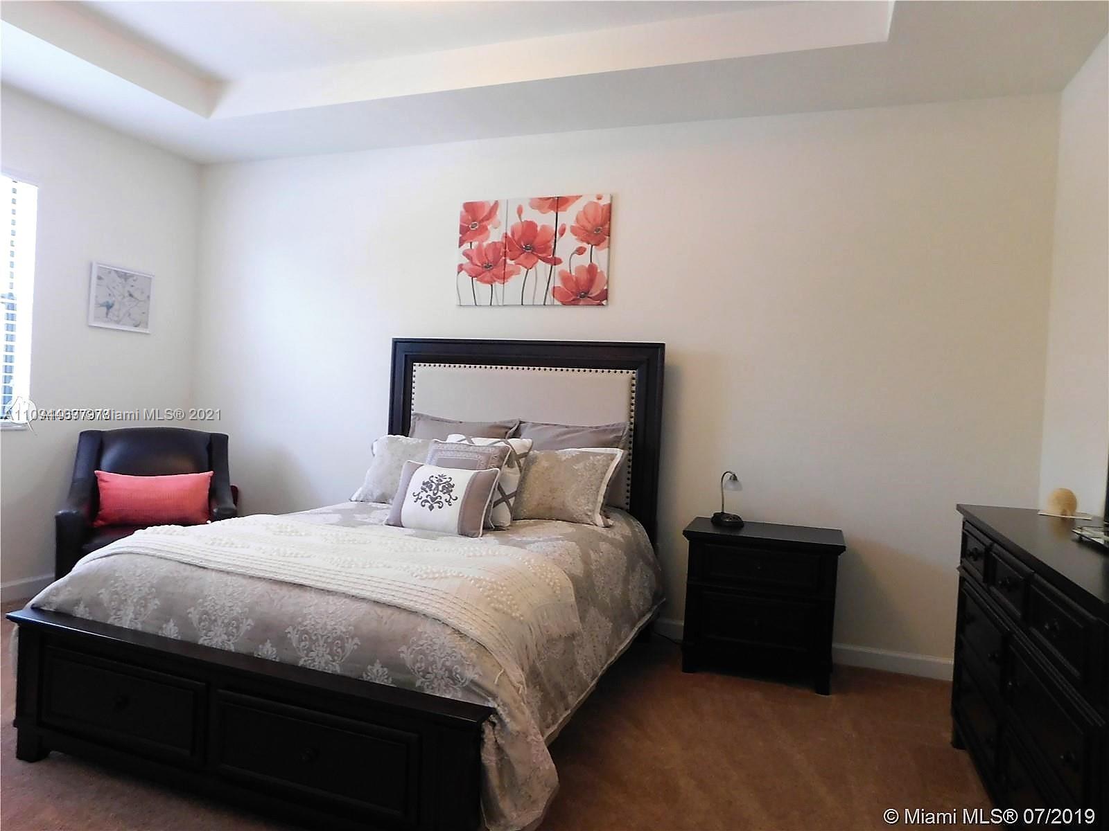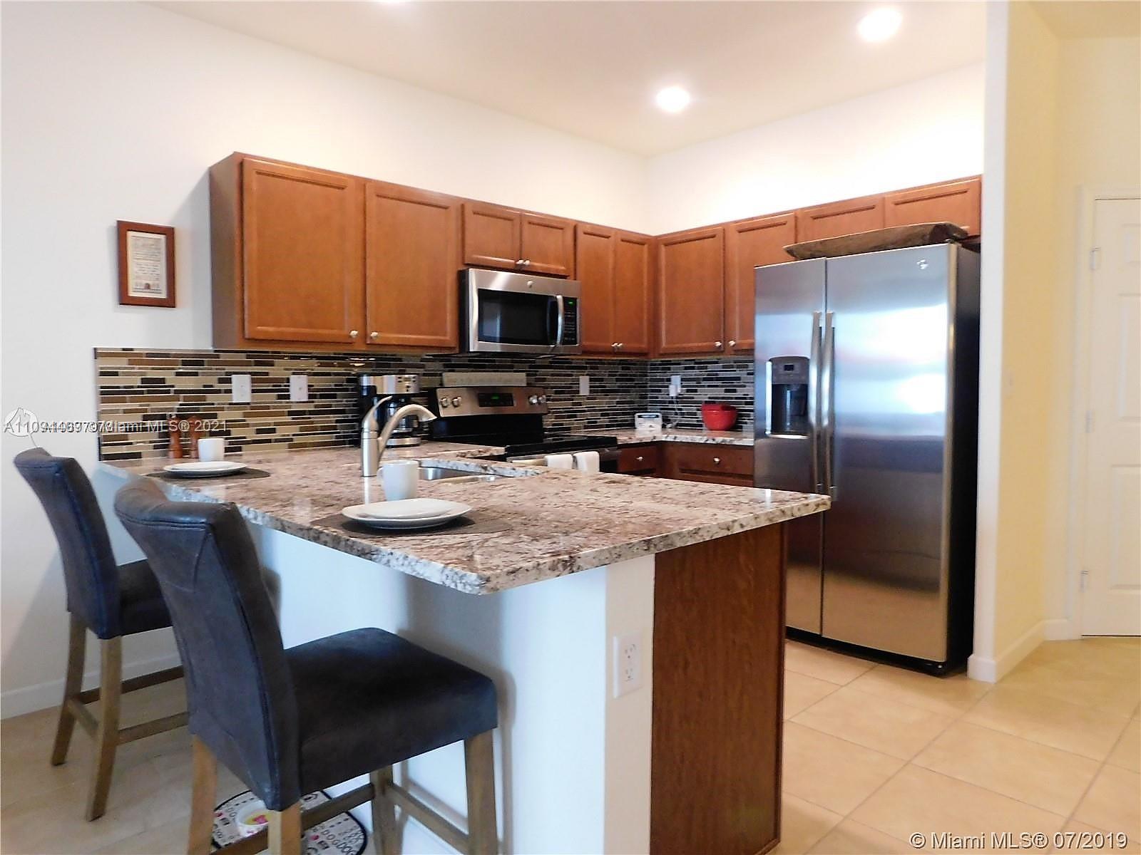 Carpeted floors on 2nd floor; tile & waterproof floors on the 1st floor. Backyard has extended pavers, a PVC fence, a nice grassy area & no rear neighbor. First floor contains: entry room, garage entry, kitchen w/upgraded granite, backsplash, upgraded GE microwave, dishwasher, fridge, electric stove/oven; pantry, a full bathroom & an oversized family room w/large closet. Some models have family room enclosed as a fourth bedroom due to it having a closet and a first floor full bath. All bedrooms upstairs and laundry. Hurricane shutters are available. HOA requires 680 screening score.