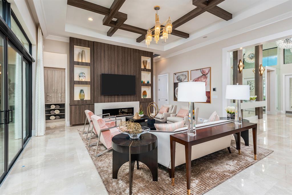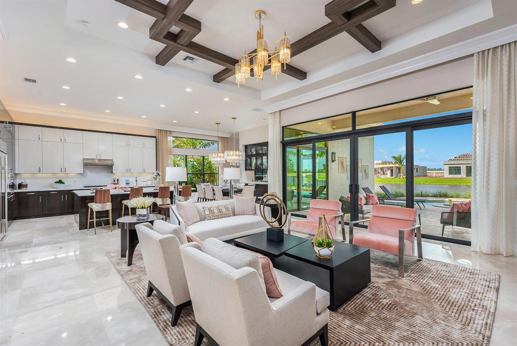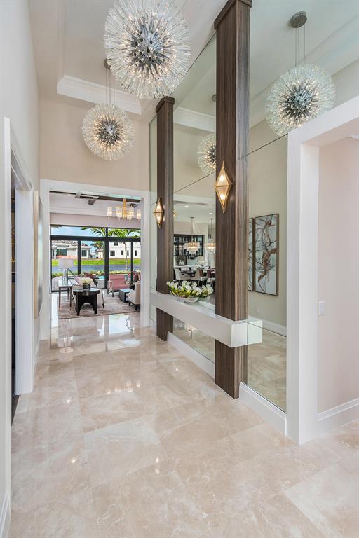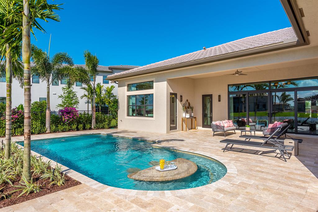 This 1 story great room floorplan is one of the most open floorplans in the Coastal Collection boasting a gourmet kitchen open to the great room, formal dining area and with only an open upgraded wet bar separating it from the club room. The great room has oversized sliders that open to a beautiful social pool with built-in bar top overlooking beautiful water view. Not only does this home have a 3 car garage, but it has the longest upgrade marble paver driveway in the cul-de-sac.