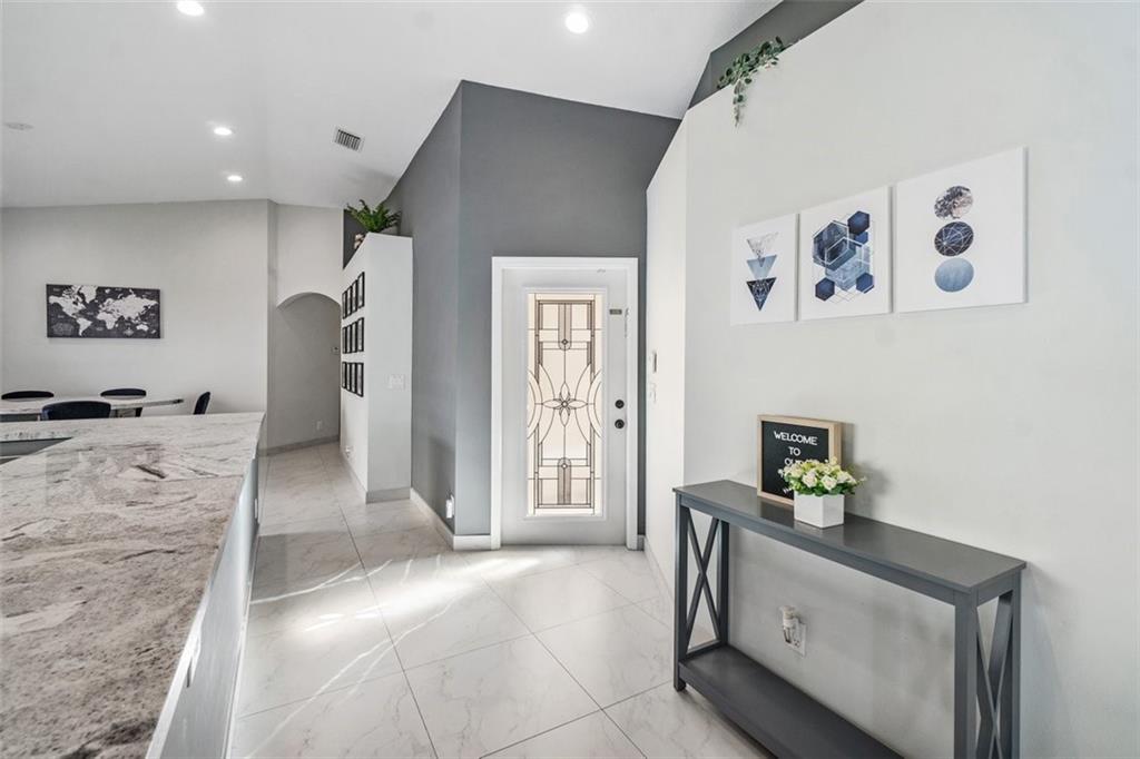 Updated 3 bedroom 2 bath Single Story Home located in the Gated Community of Kensington Green. Walk through your private gated entry to this immaculately kept move in ready home. A/C was replaced in 2020. Large windows with Light Filtering Dual Shades, volume ceilings, open floor plan, great for entertaining, screened back patio, Master bathroom has a frameless glass shower with a spacious walk-in closet. The Kitchen is upgraded with granite, self-closing drawers and an abundance of cabinet space. Close to shopping, restaurants, and major expressways. In addition, Kensington Green amenities include a community pool, outdoor fitness area and a pet area all with a low HOA fee that includes front lawn grass trimming.