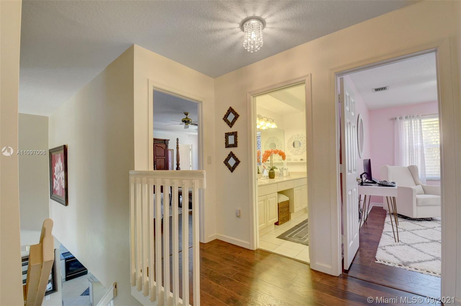 Eagle Lakes in Coral Springs. This gorgeous, spacious 5 bedroom/ 3 bathroom, 3 car garage with one car converted for storage but easily converted back, 20' volume ceilings, single family pool home. Community is gated for security, low HOA. Master bedroom is upstairs and boasts separate tub and shower, dual sinks and ample walk in closet. One bedroom and full bath on main level. Kitchen has upgraded white cabinetry, stainless appliances and looks out to the spacious and private backyard with fully fenced yard. Neutral tile downstairs, upgraded laminate throughout 2nd floor. All bathrooms updated, Accordion shutters, roof 2003, A/C outside 2019, inside upstairs 2018 and inside downstairs 2012, water heater 2019.