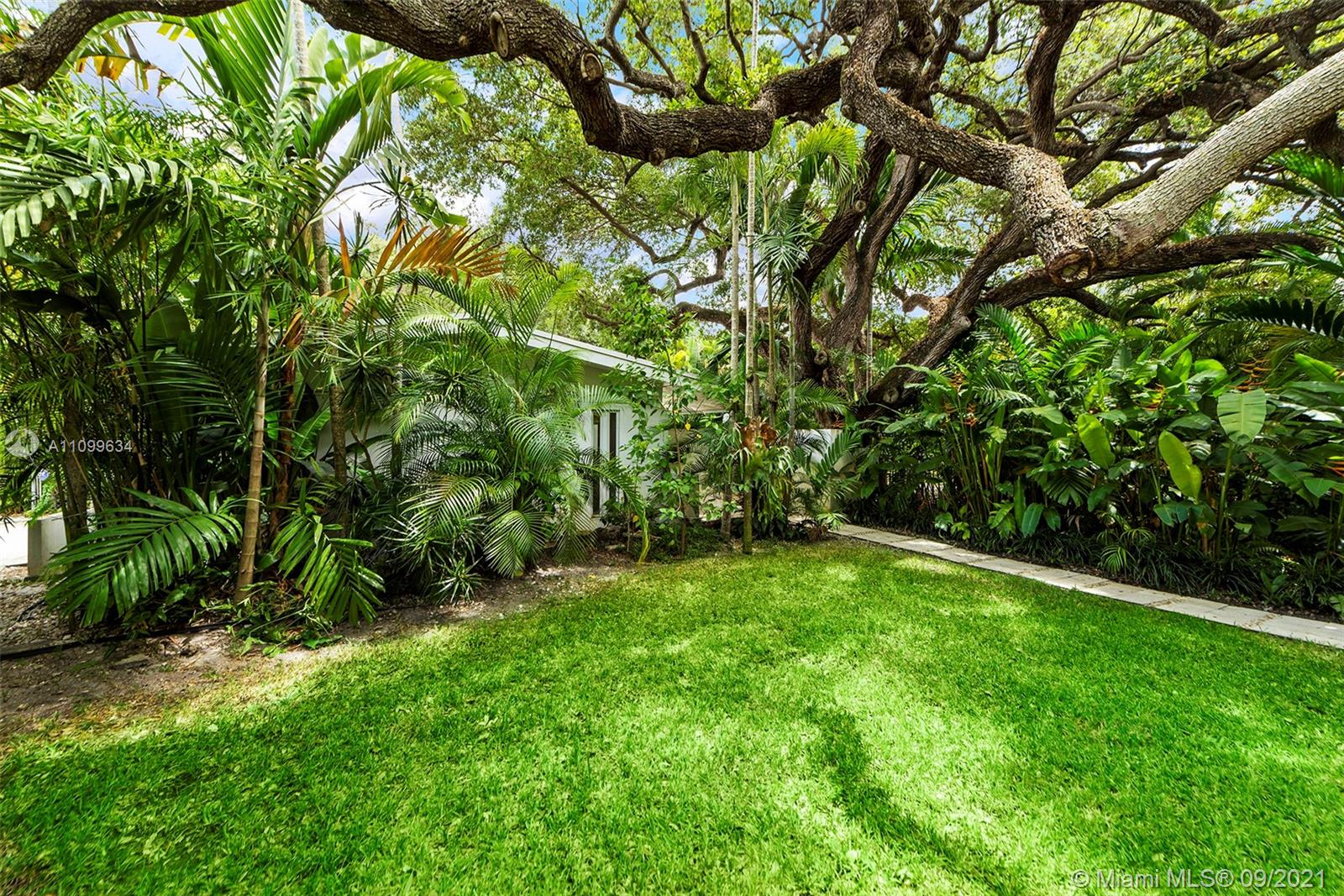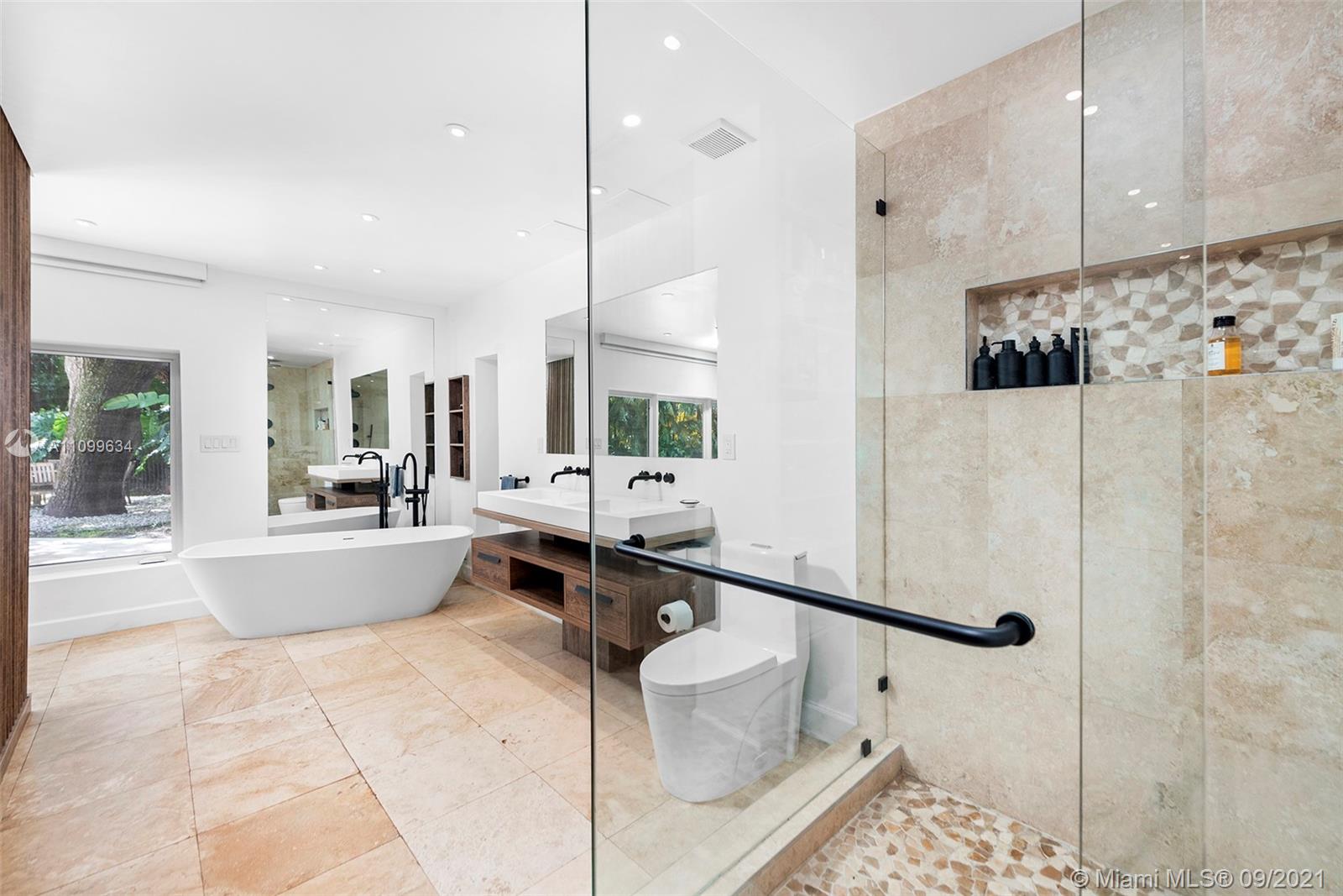 Once in lifetime Miami Shores opportunity to live in a private, tropical oasis under majestic oaks overlooking a stunning, free form pool with beach, jacuzzi, and waterfall! This beautifully updated 4 bed 3 bath, midcentury modern residence offers 4 distinct outdoor living areas for your daytime and evening enjoyment. The open floor plan features large rooms with floor to ceiling impact sliding doors throughout that exaggerate the lush greenery that surrounds the residence for a true indoor / outdoor living experience. Gourmet kitchen with quartz counter tops and VIKING gas stove. Brand new master wing features luxurious walk-thru closet, custom dual sink vanity, oversized shower, and separate extra large soaking tub with a view of your private tropical oasis! 2 A/C units Gas water heater!