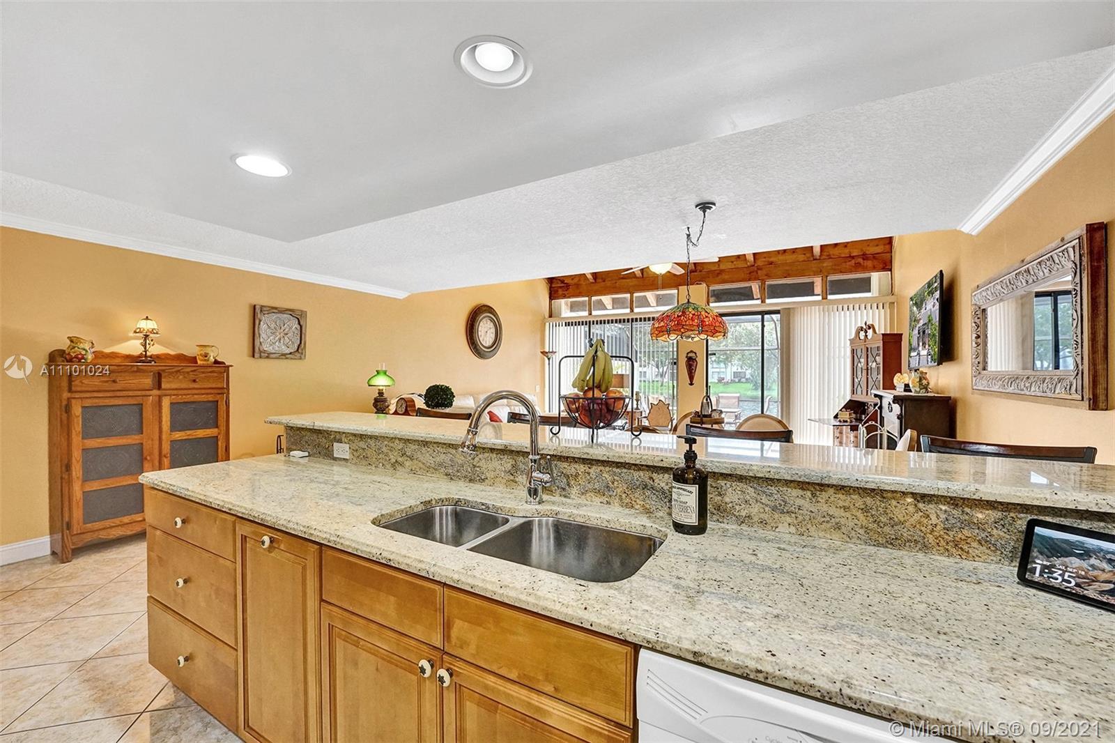 Enjoy outdoor living & beautiful water views - your own private oasis! This gorgeous home features 3 bedrooms, 2 bathrooms, tile flooring throughout spacious living areas & high vaulted ceilings - perfectly light & bright! The generously sized kitchen showcases granite countertops & snack bar with additional seating. Full bedroom & full bath on first floor! Upstairs, enjoy amazing water views from the master bedroom! With an extended screened patio perfect for BBQ & a large yard with wide water views, this home is ready for entertaining! Impact windows and accordion shutters for convenience. Amenities include cable, pool, basketball, racquetball, tennis & exterior painting! Excellent location close to great schools, shopping, dining, parks & more!