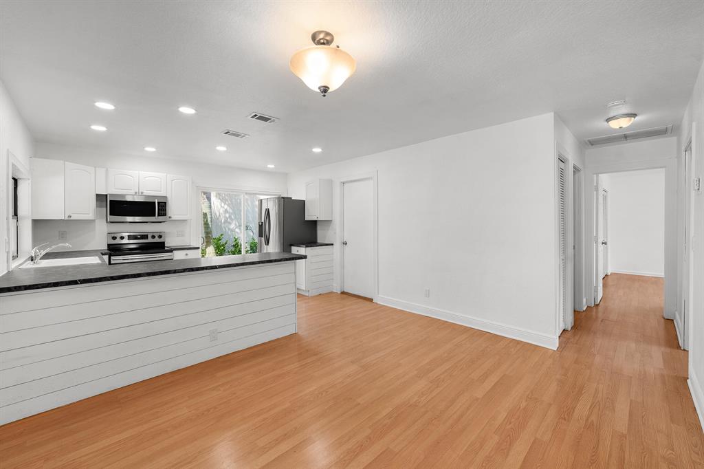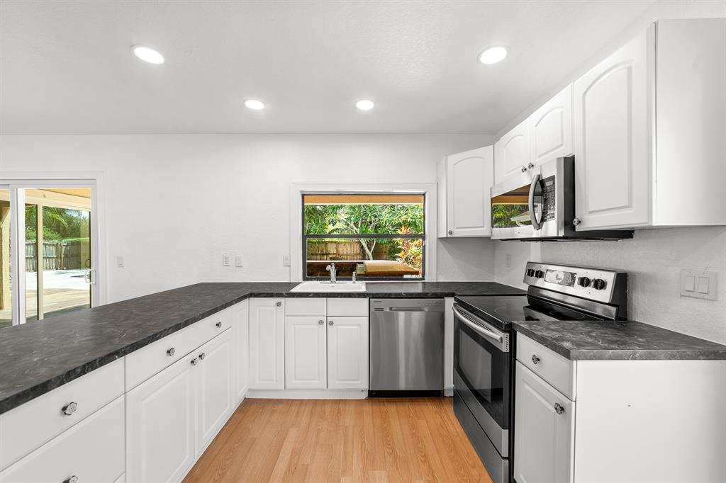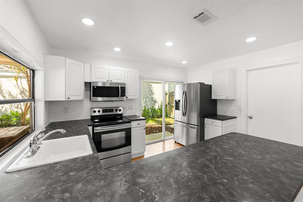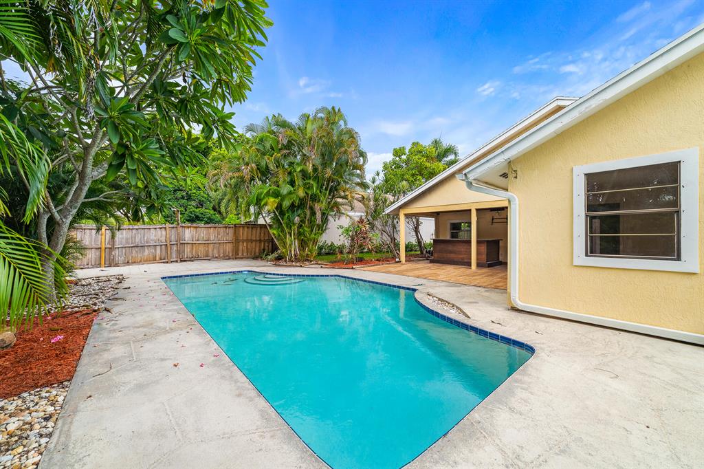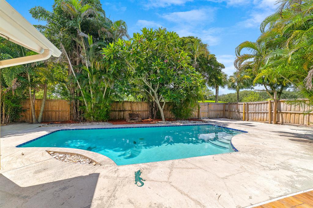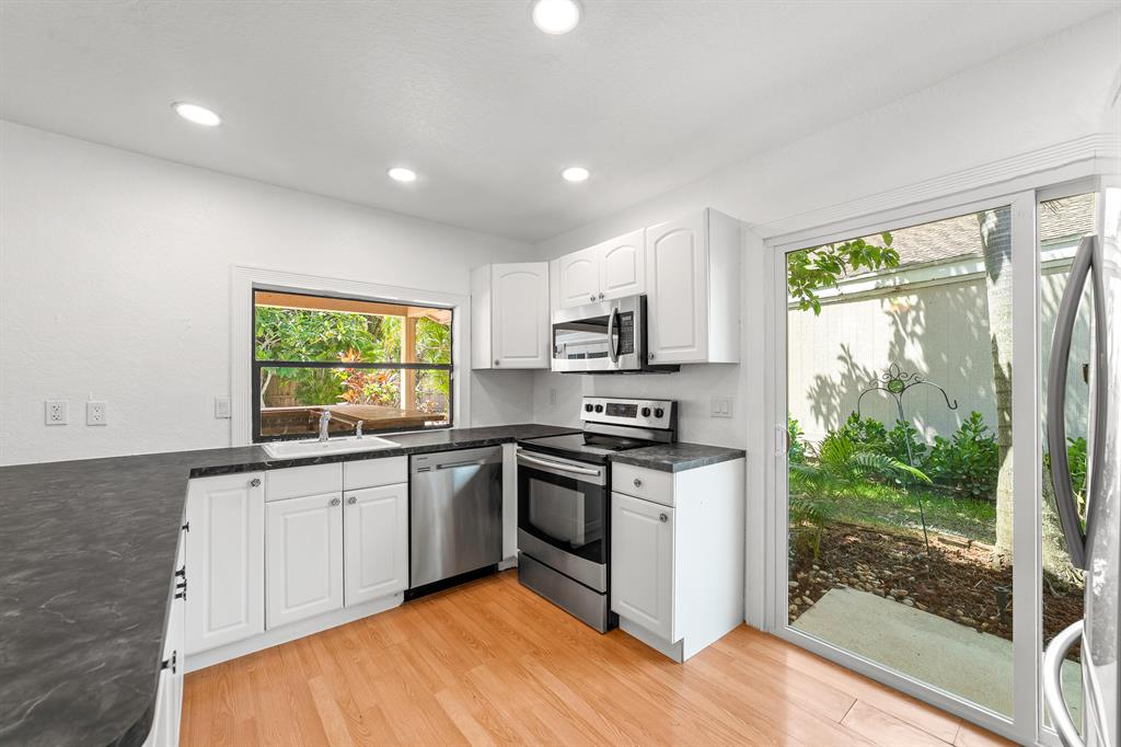 Enjoy the perfect blend of indoor and outdoor living in this beautiful 3 bedrooms, 2 baths, 1-car garage, pool home. It is sitting on a private 0.13 acre lot with no posterior neighbors in a great, low HOA community. Vaulted ceilings and recessed lights in the living room, plus removed popcorn and fresh interior paint (2021) throughout make the home feel airy and bright. The home showcases light laminate flooring. The open kitchen is equipped with stainless steel appliances including a newer double-door Samsung refrigerator (2020), light cabinets and a snack bar. The primary bedroom offers a walk-in closet. The primary has an updated walk-in shower. The guest bathroom is finished with a granite top vanity and jet tub. Step out and enjoy a serene oasis on the tiled patio by the refreshing
