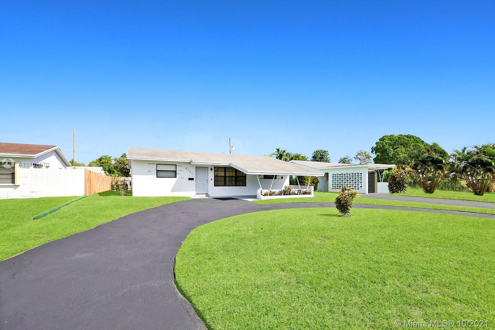 LOVELY 3 BED 2 BATH SINGLE FAMILY HOME HAS WELCOMING CURB APPEAL AND FRESH NEW PAINT. AN AWESOME OVERSIZED CIRCULAR DRIVEWAY EASILY ACCOMMODATES MANY CARS PLUS CARPORT. ENJOY LIGHT AND BRIGHT LIVING SPACES INSIDE, NEUTRAL TILE THROUGHOUT, AND A SPLIT FLOOR PLAN FOR PRIVACY. THE KITCHEN OFFERS REAL WOOD CABINETS AND STAINLESS STEEL APPLIANCES. A COMFORTABLE PRIMARY SUITE HAS LOVELY PLANK STYLE FLOORING AND EASILY ACCOMMODATES A KING SIZE BED. ENSUITE BATH IS UPDATED WITH NEUTRAL FIXTURES. SCREENED-IN PATIO IS PERFECT FOR OUTDOOR DINING. SPACIOUS FENCED YARD HAS ROOM FOR A POOL. EXTRAS INCLUDE A DEDICATED LAUNDRY ROOM AND A SHED FOR EXTRA STORAGE. CONVENIENT CENTRAL HOLLYWOOD LOCATION IS CLOSE TO RESTAURANTS, SHOPS, THE HARD ROCK CASINO, AND IS JUST A SHORT DRIVE TO THE BEACH. NO HOA