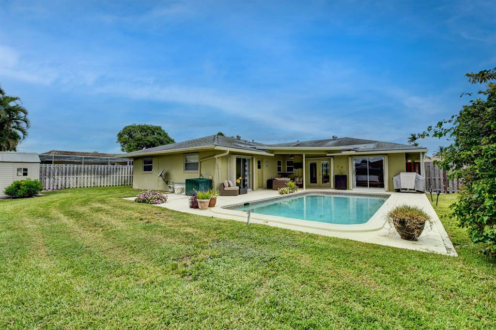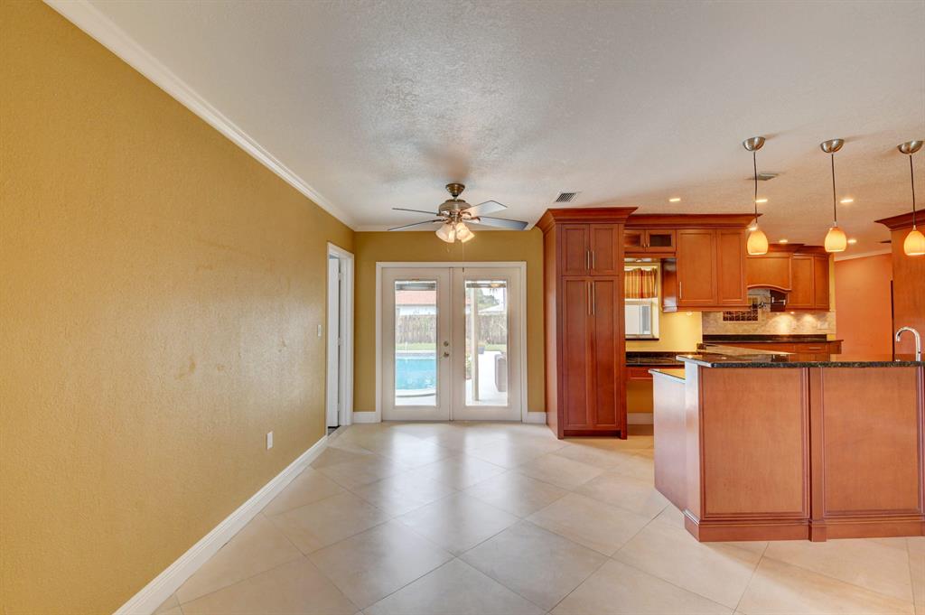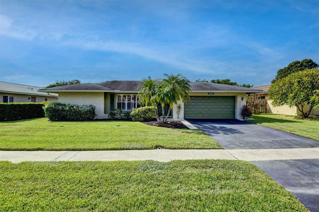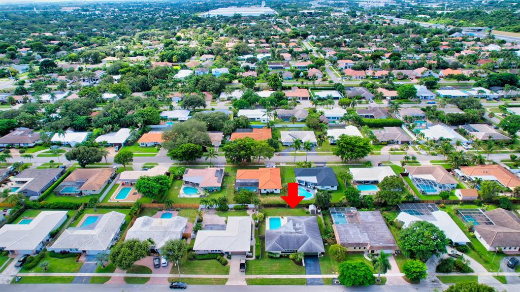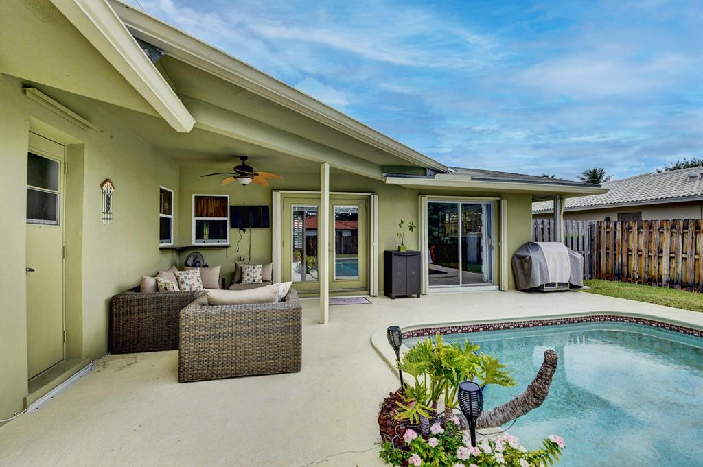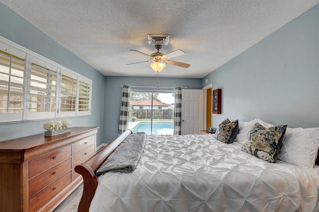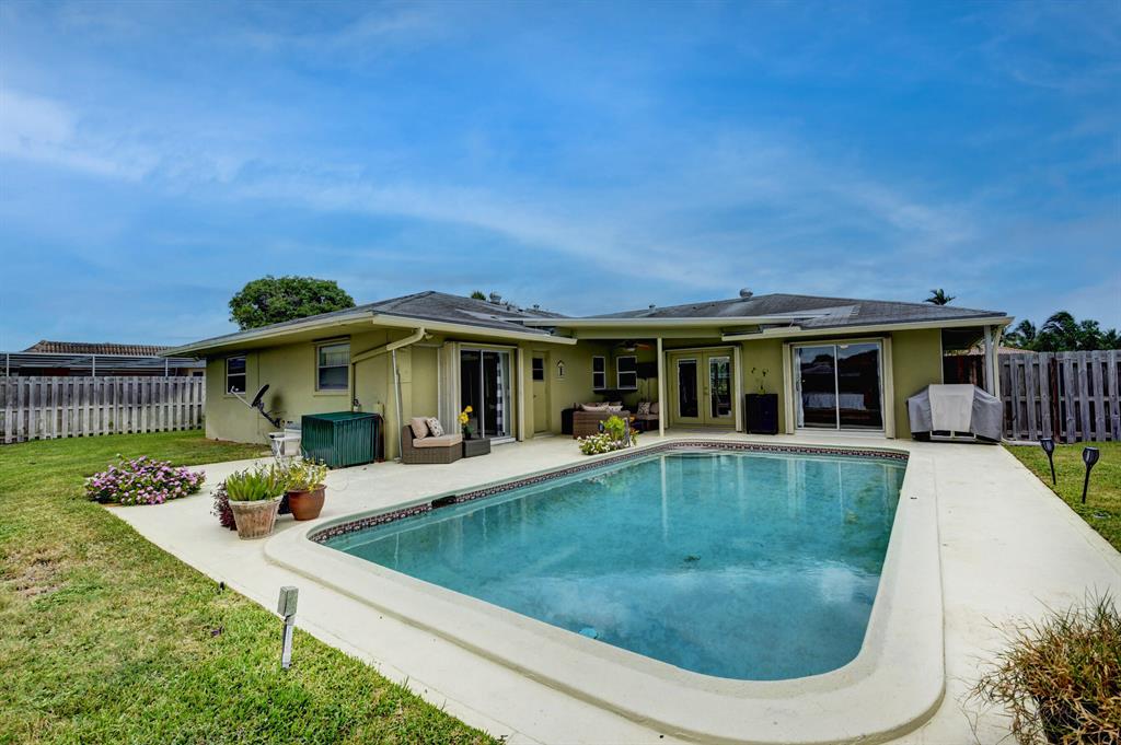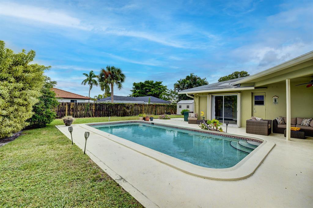 True 4-bedroom pool home with a 2-car garage in the popular community of Boca Raton Square. No HOA, zoned for A rated Addison Mizner (.9 miles), Boca Raton Middle (1.9 miles) and Boca Raton High Schools (2.4 miles) and just 10 minutes to the beach! The home has complete hurricane protection, is wired for a generator and has no overhead power lines! The spacious kitchen is open to the living/dining area and has plenty of storage including a pantry with pullout drawers, double wall ovens, wood cabinets, pot filler faucet, granite counters and an island with sink. The living areas have neutral porcelain tile floors and all bedrooms have wood-look vinyl plank floors. Plantation shutters decorate the windows in the living room and primary bedroom and French doors lead from the dining area to