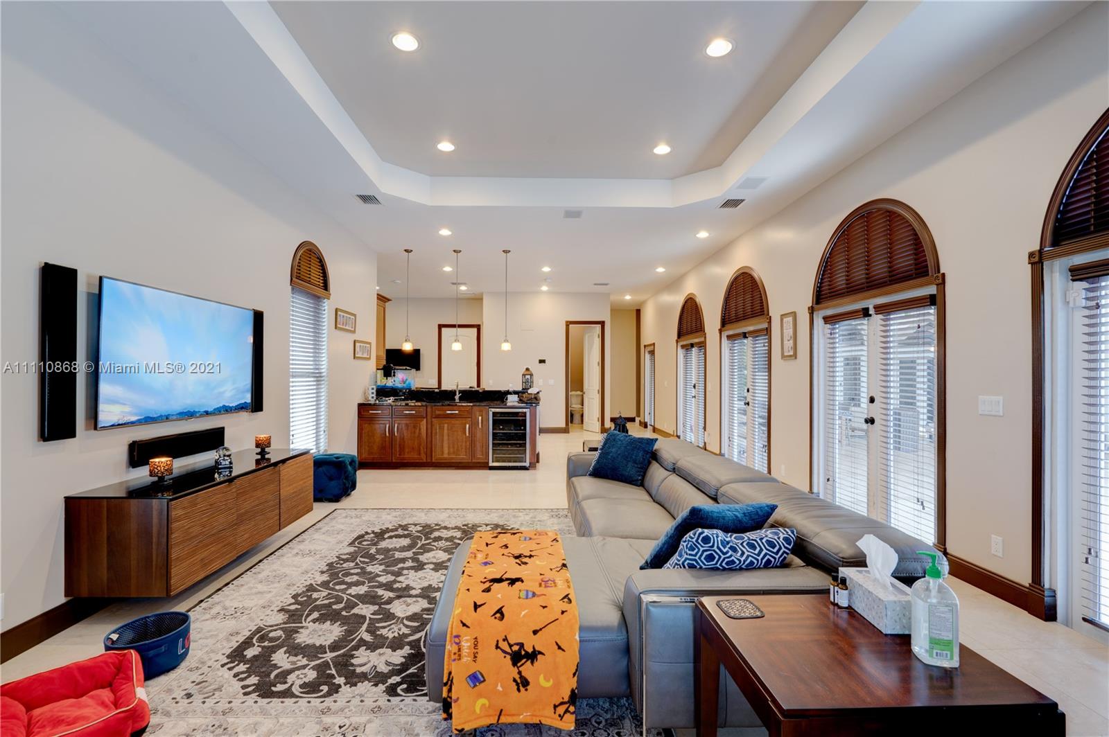 Luxurious custom built home features 4 bedrooms, one large master bedroom and 3 bedrooms, 3 full bathrooms & 2 half bathrooms, 2 living rooms, 1 dining room, 1 playroom, 1 office. Large spacious chefs kitchen (20x18) with the finest custom cabinetry, inbox appliances & open floor plan. Impact windows & doors with porcelain and tile flooring throughout. Entertain in oversized living areas with volume/vaulted ceilings or on the expansive patio featuring a resort style heated pool with jacuzzi, with outdoor kitchen with sink, gas BBQ and dishwasher. Large Garage can contain two large car/van. Two Outdoor garden storage, complete this beautiful house. No HOA, no restriction for your boat, RV. Smart home with music speakers and light control with app. Kids playground area.